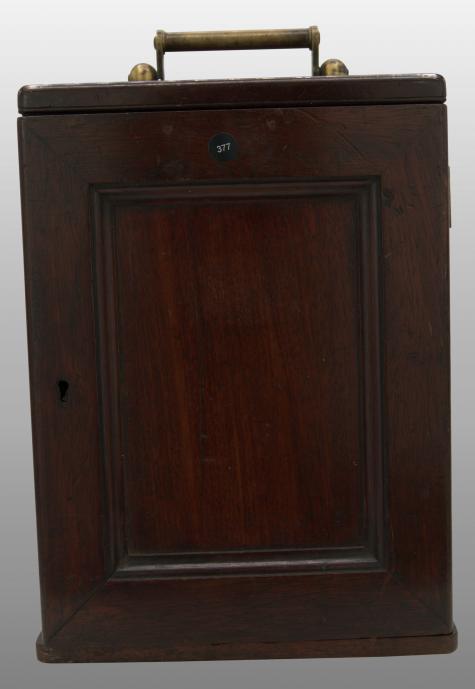 Description 377: boite en acajou à crochet (20x18x25 cm), Oculaire, objectif 1, 1/2 inch.