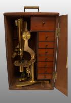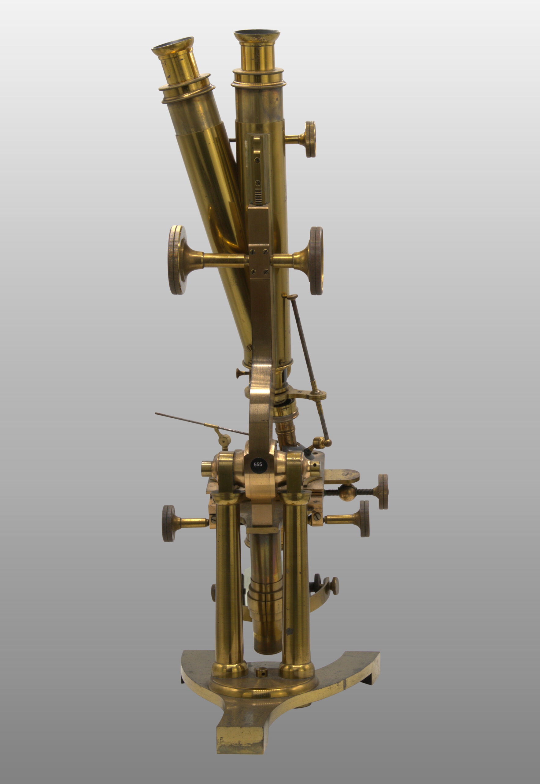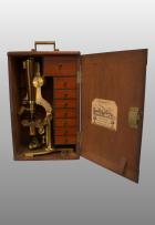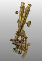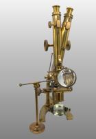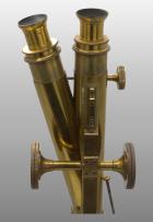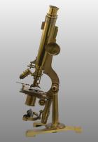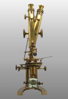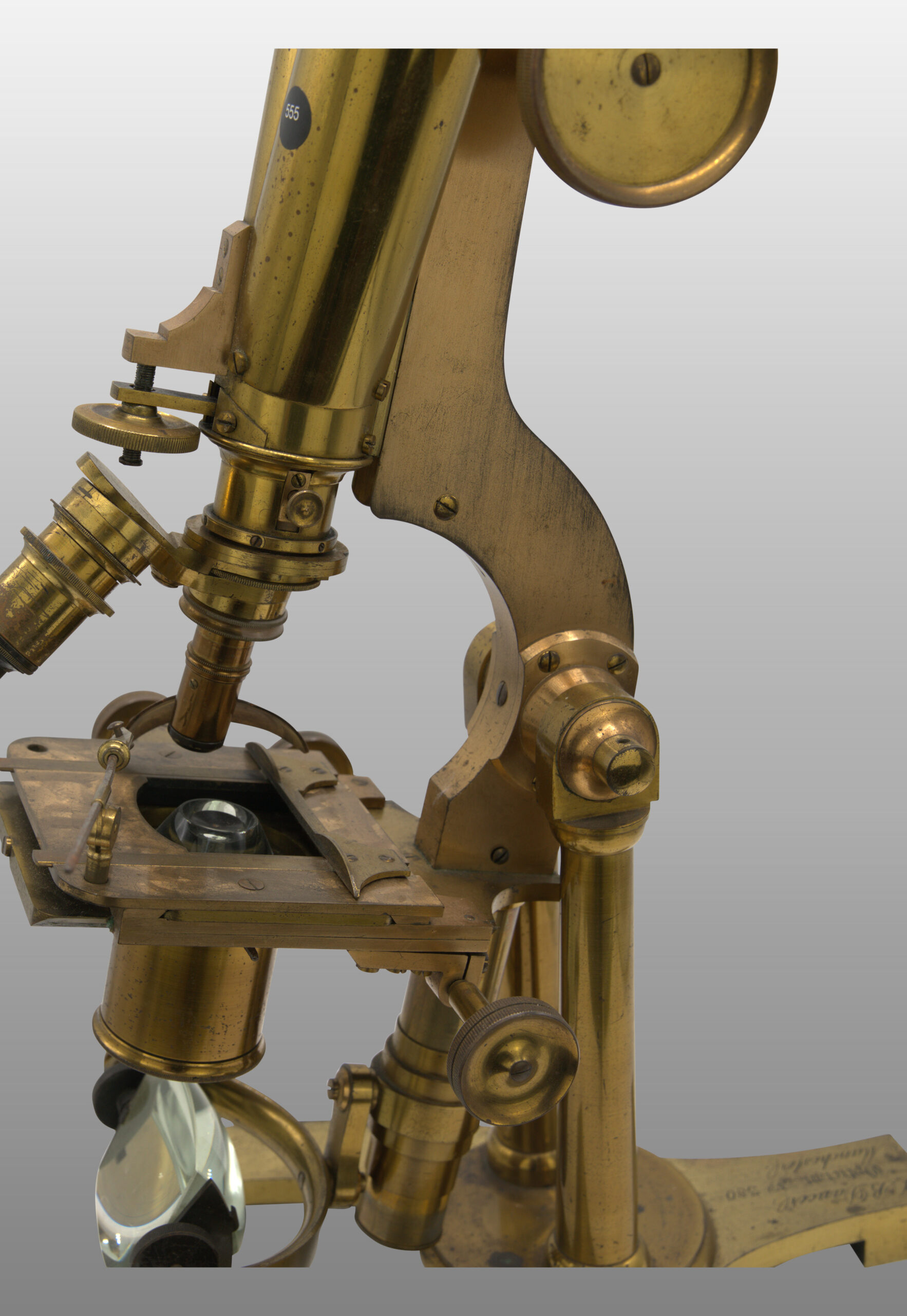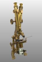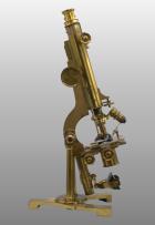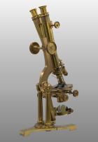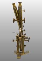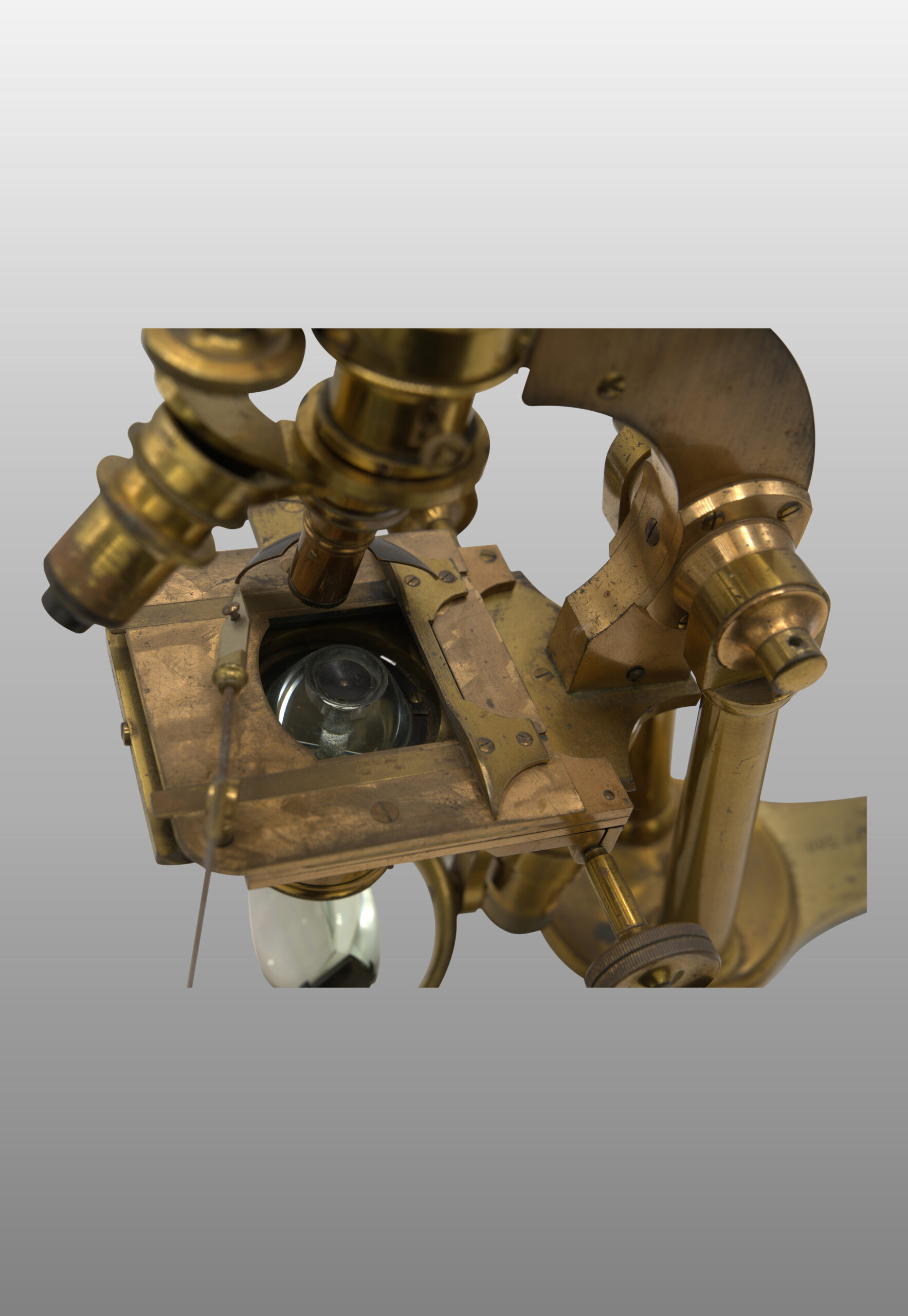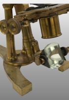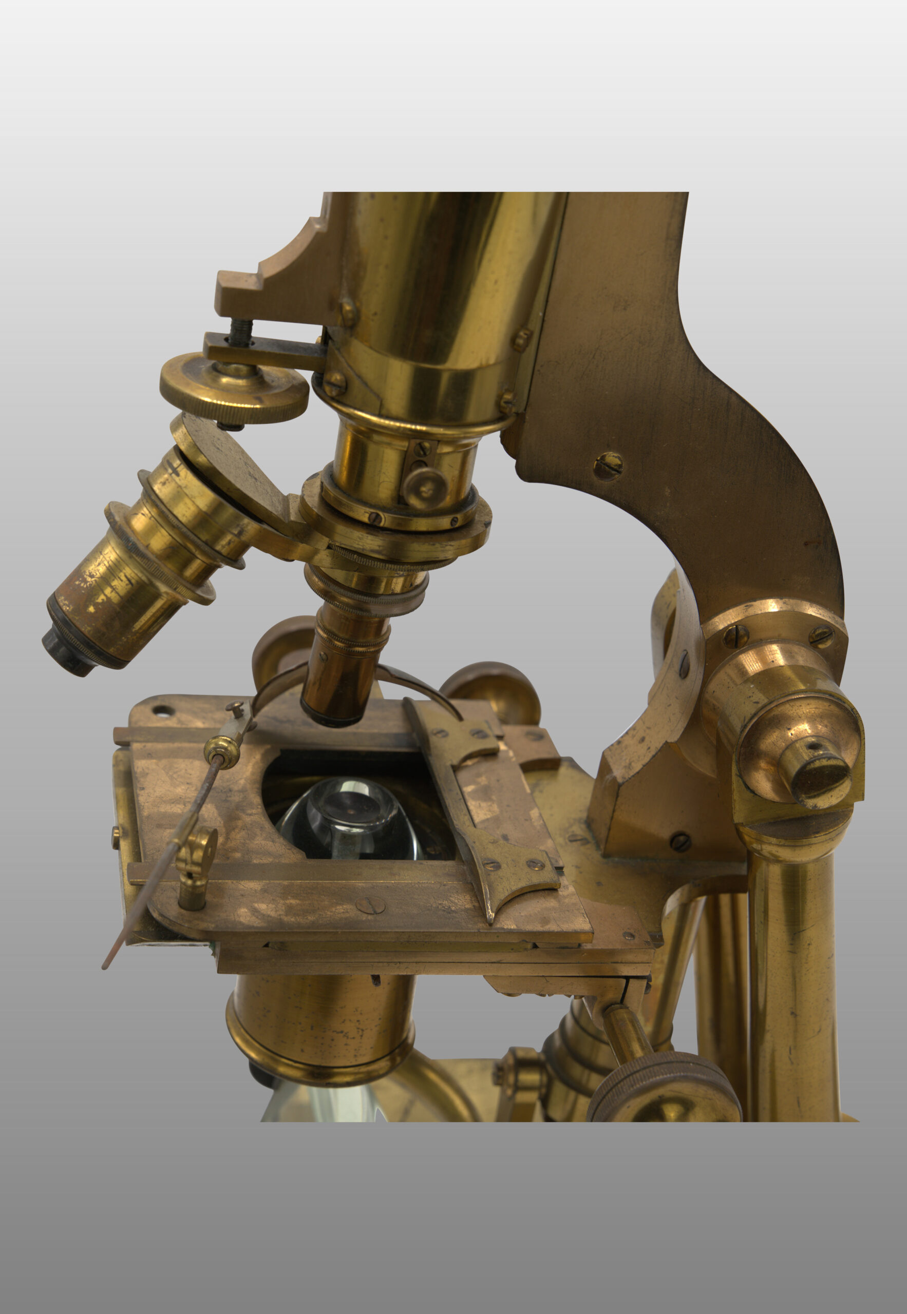 Le microscope est construit en laiton avec une finition de surface laquée brillante et mesure environ 18 pouces de haut lorsqu’il est configuré pour une utilisation en position inclinée avec les tubes de tirage partiellement étendus. L’objectif principal est à crémaillère et la mise au point fine est faite par la vis micrométrique calibrée opérant au-dessus de l’objectif. La séparation interoculaire est ajustée en déplaçant les tubes de traction par crémaillère et pignon. Le microscope est équipé d’une platine mécanique ayant des mouvements orthogonaux et d’un porte-lame réglable. L’instrument est soutenu par des piliers doubles. La sous-platine se compose d’un support cylindrique, qui accueille les différents accessoires.