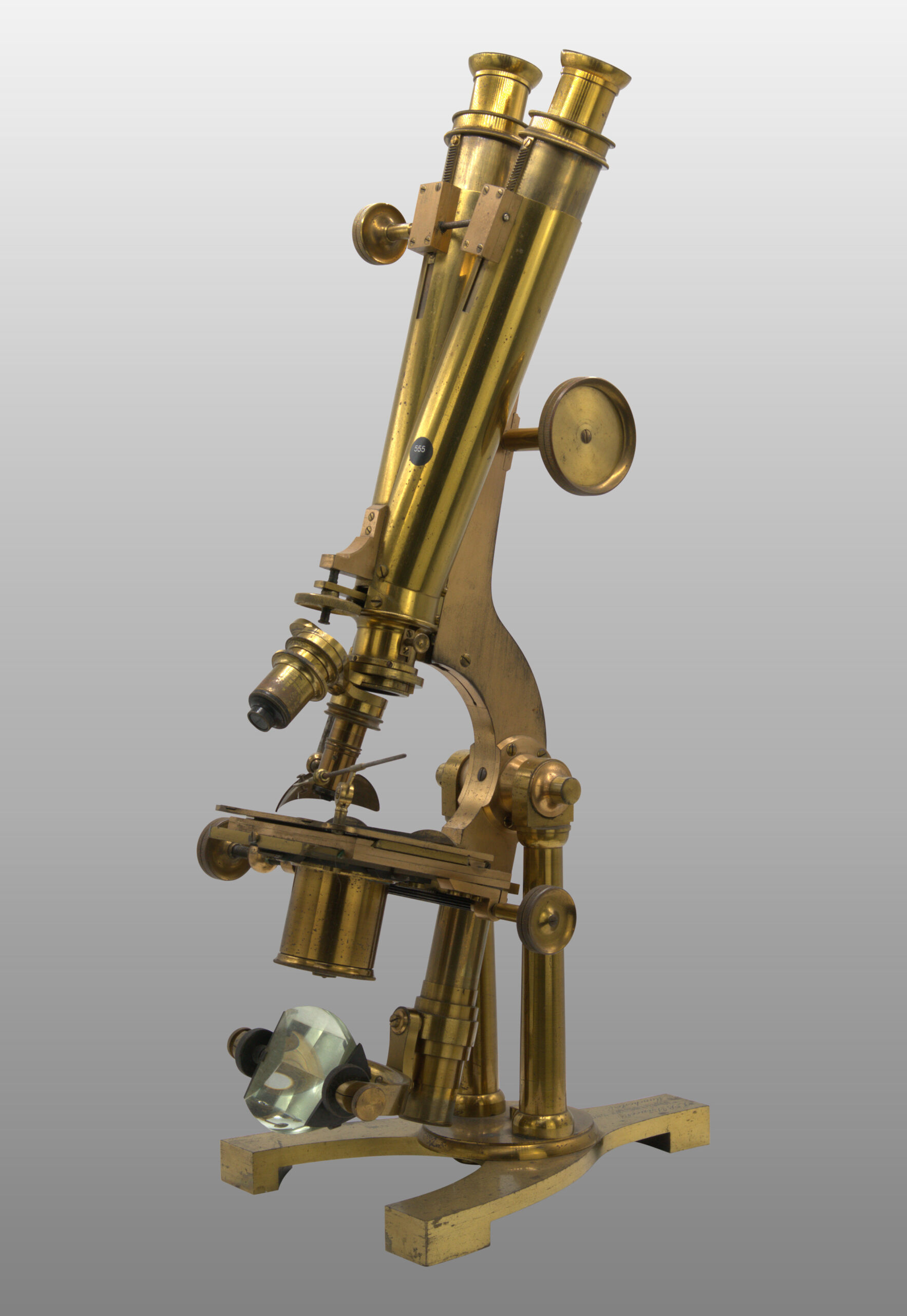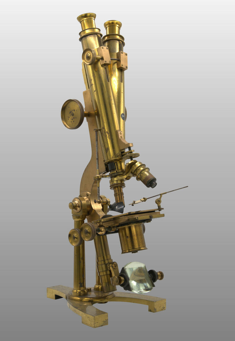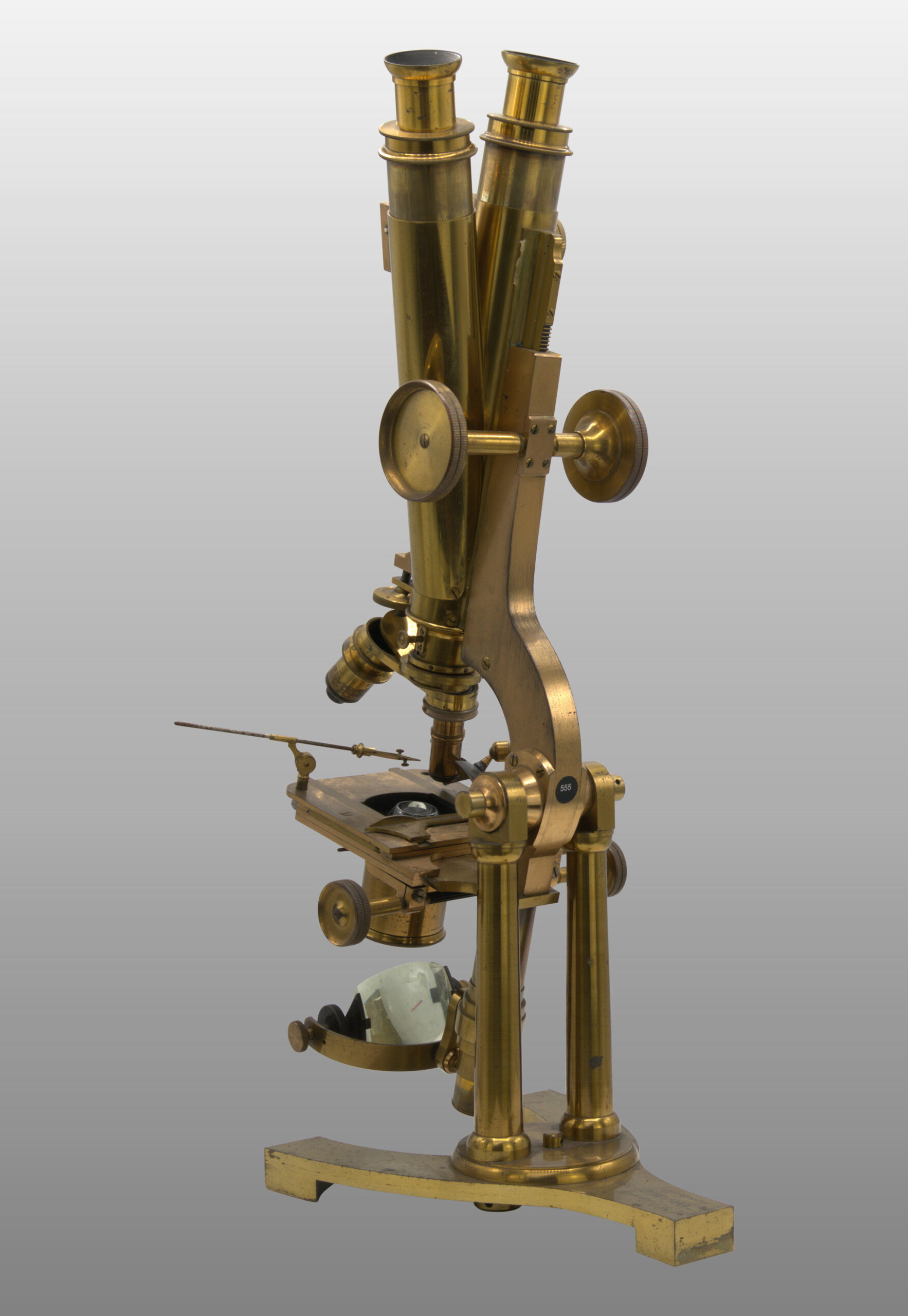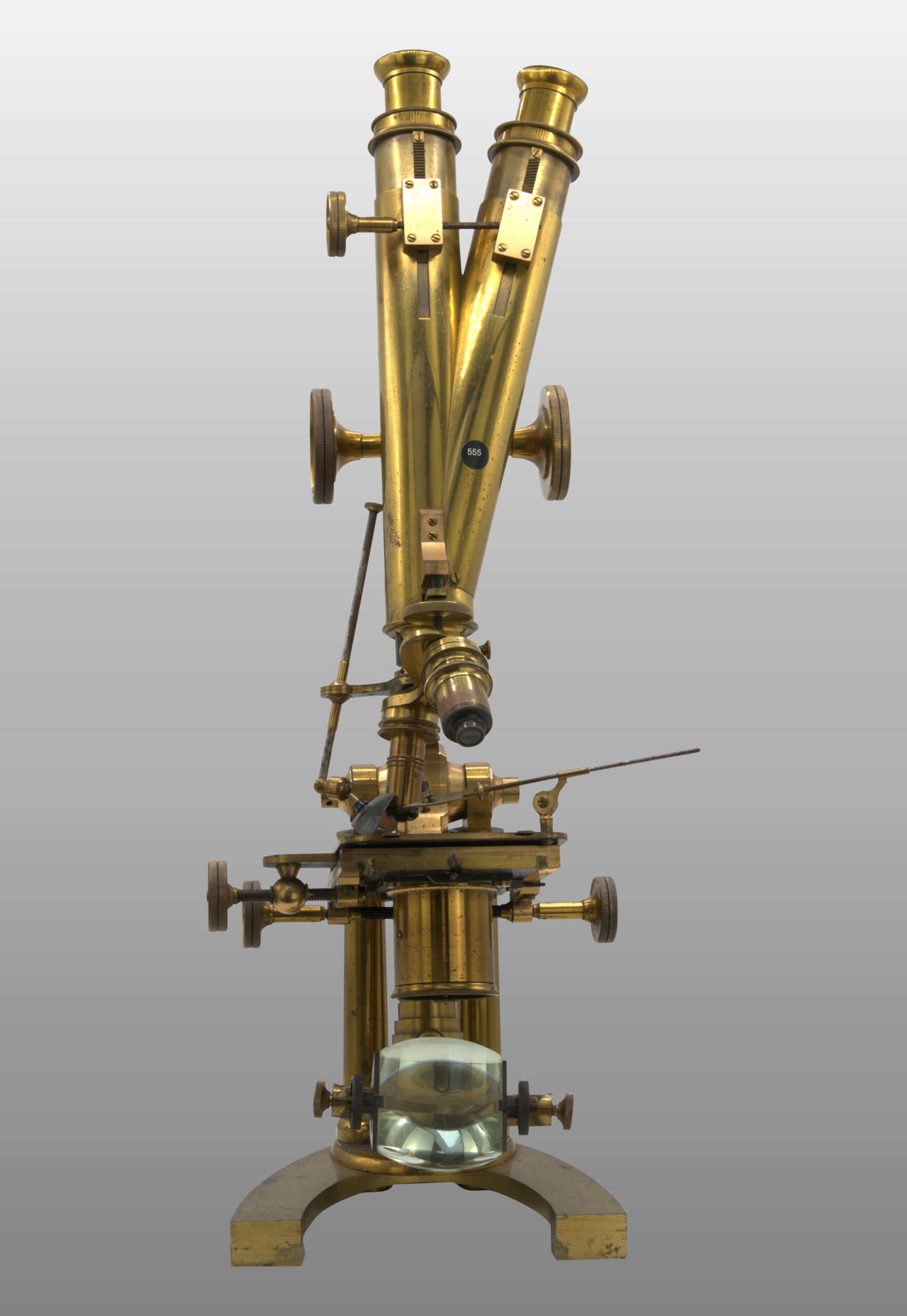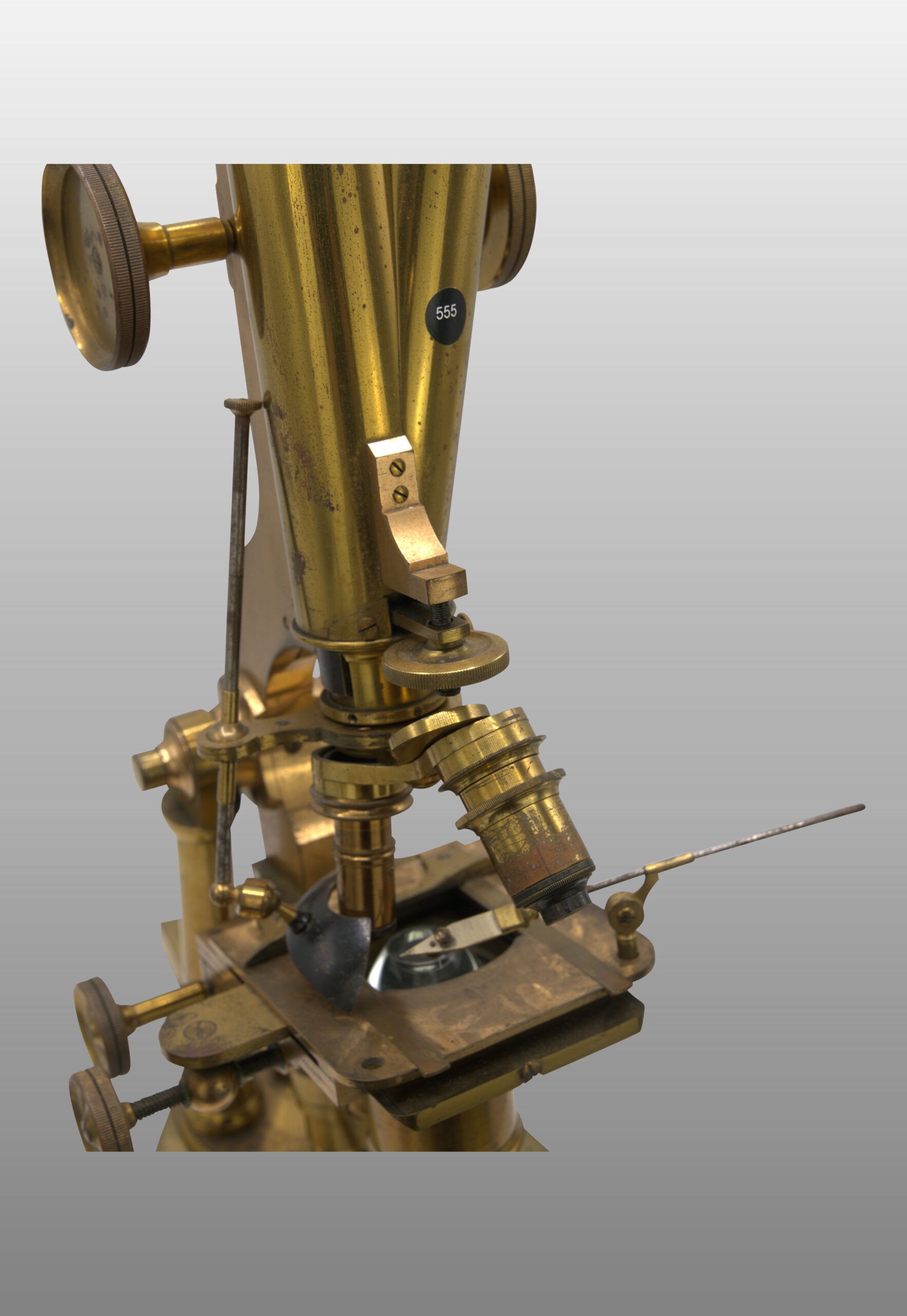 Le microscope est construit en laiton avec une finition de surface laquée brillante et mesure environ 18 pouces de haut lorsqu’il est configuré pour une utilisation en position inclinée avec les tubes de tirage partiellement étendus. L’objectif principal est à crémaillère et la mise au point fine est faite par la vis micrométrique calibrée opérant au-dessus de l’objectif. La séparation interoculaire est ajustée en déplaçant les tubes de traction par crémaillère et pignon. Le microscope est équipé d’une platine mécanique ayant des mouvements orthogonaux et d’un porte-lame réglable. L’instrument est soutenu par des piliers doubles. La sous-platine se compose d’un support cylindrique, qui accueille les différents accessoires.