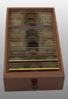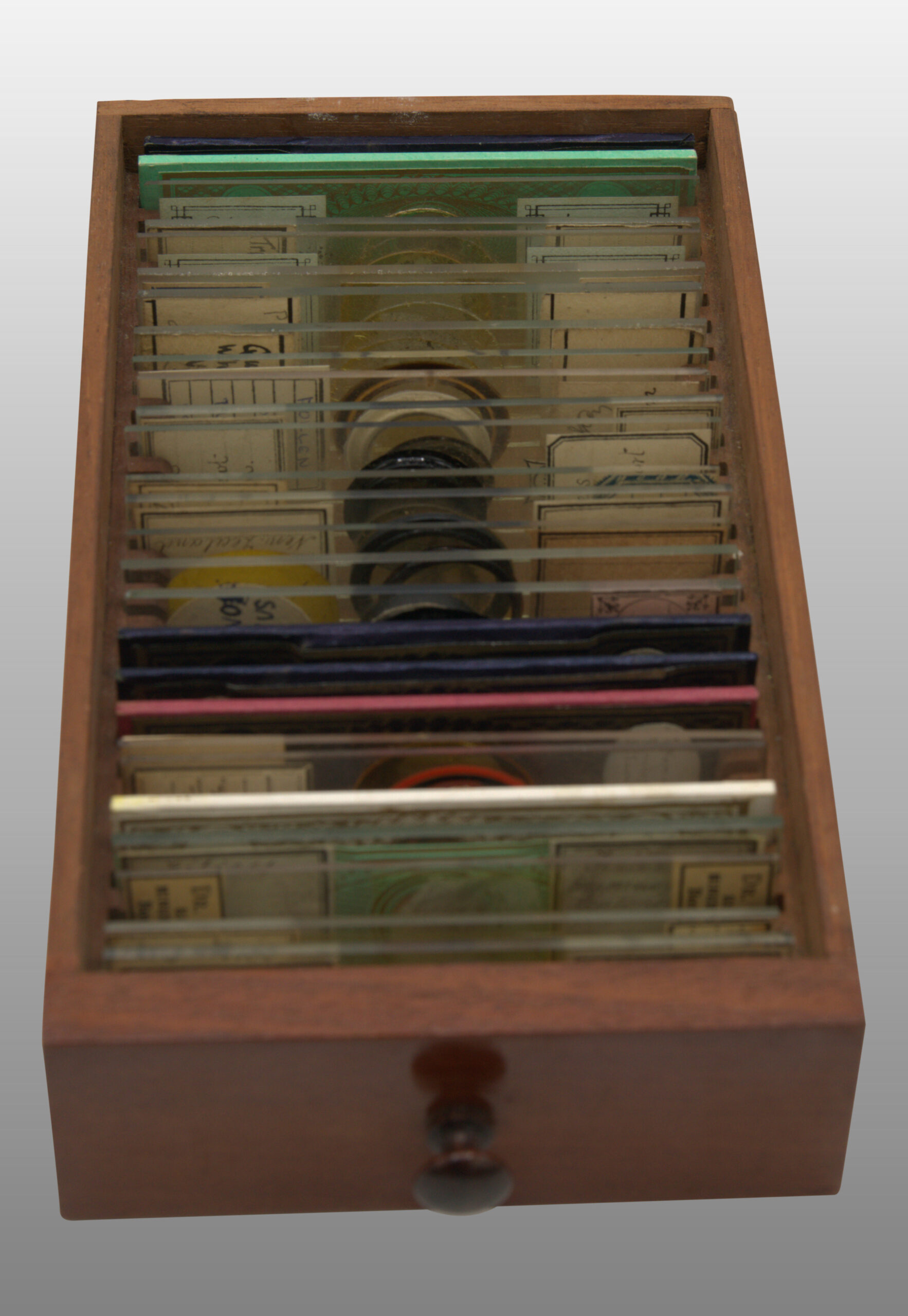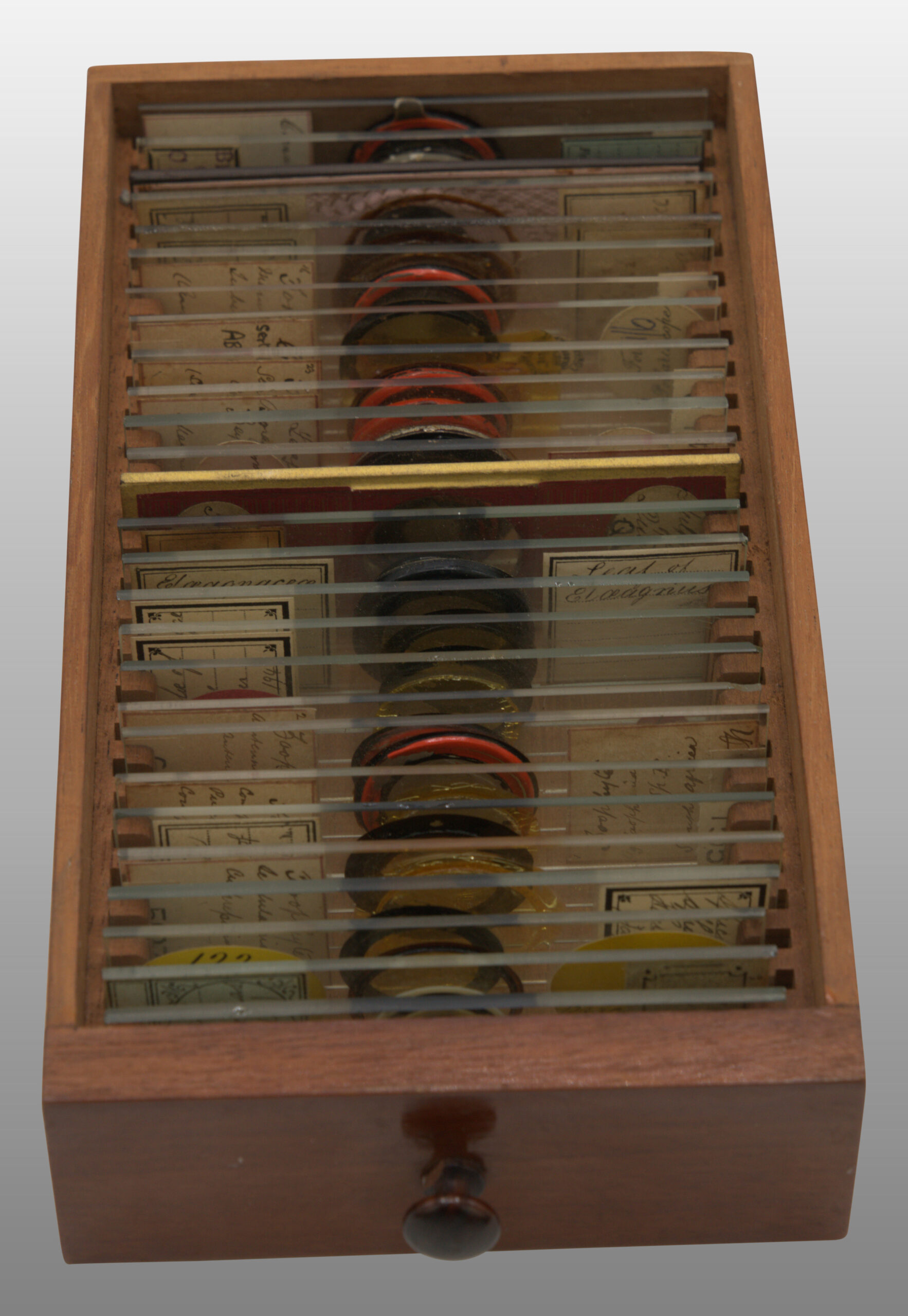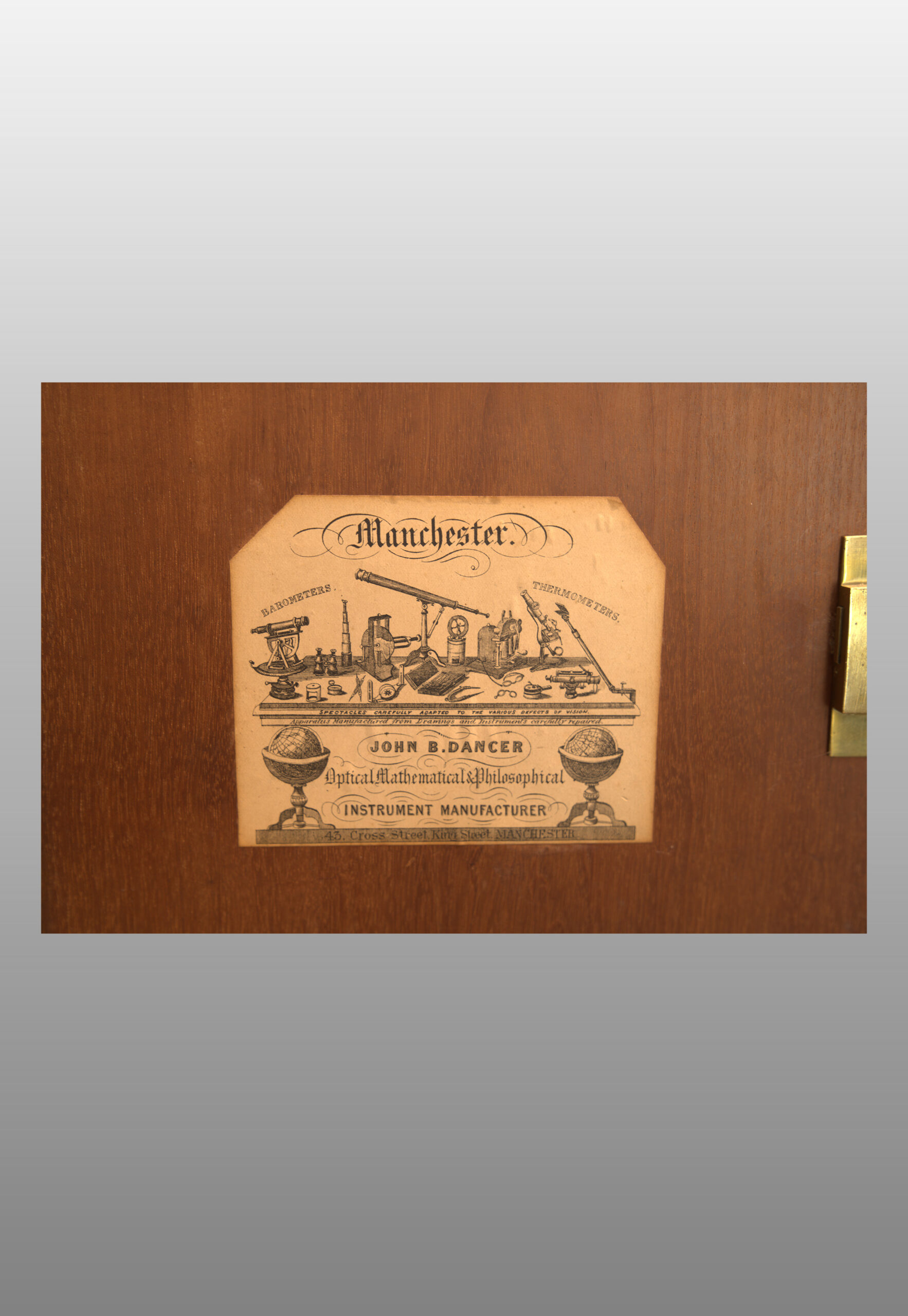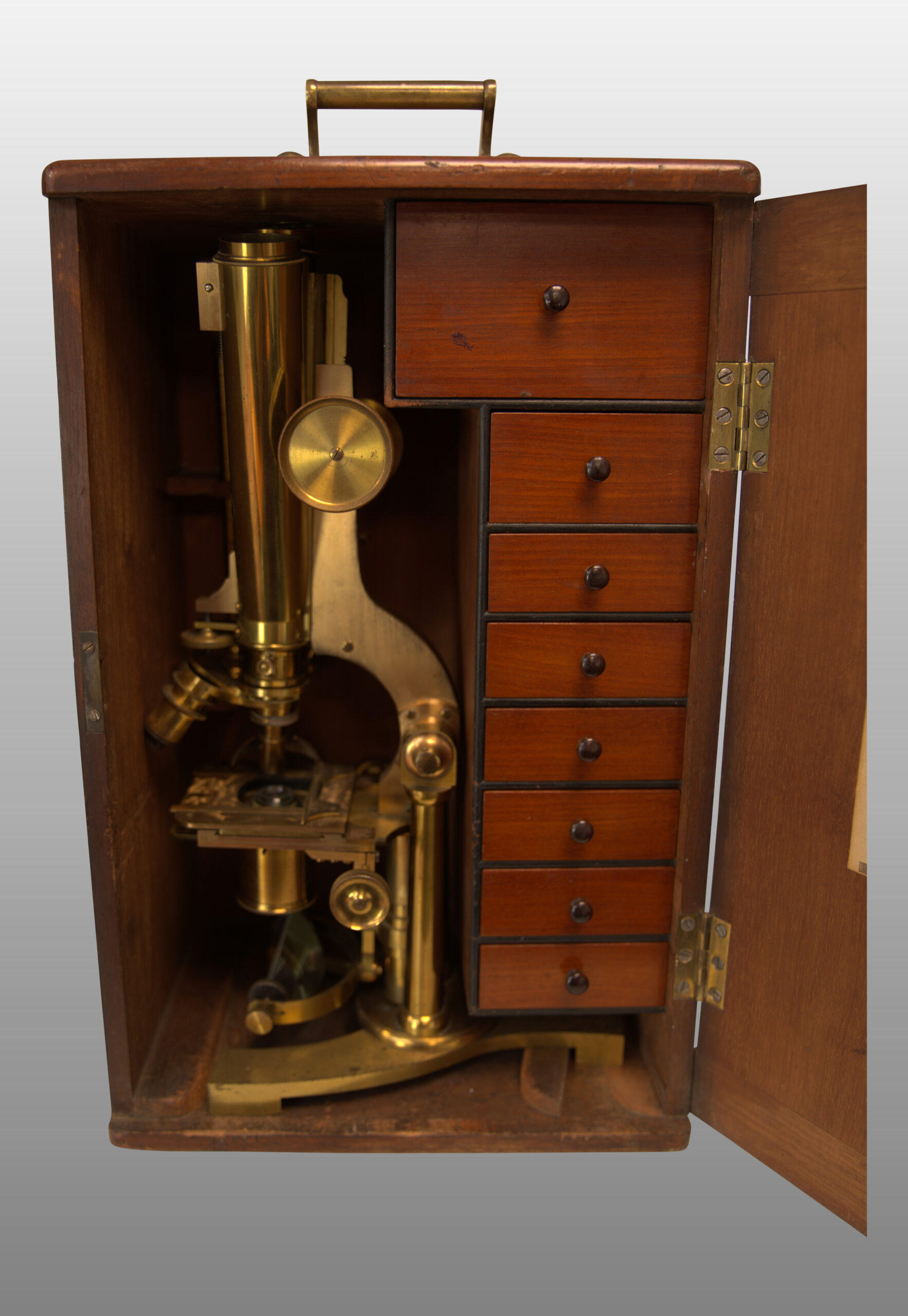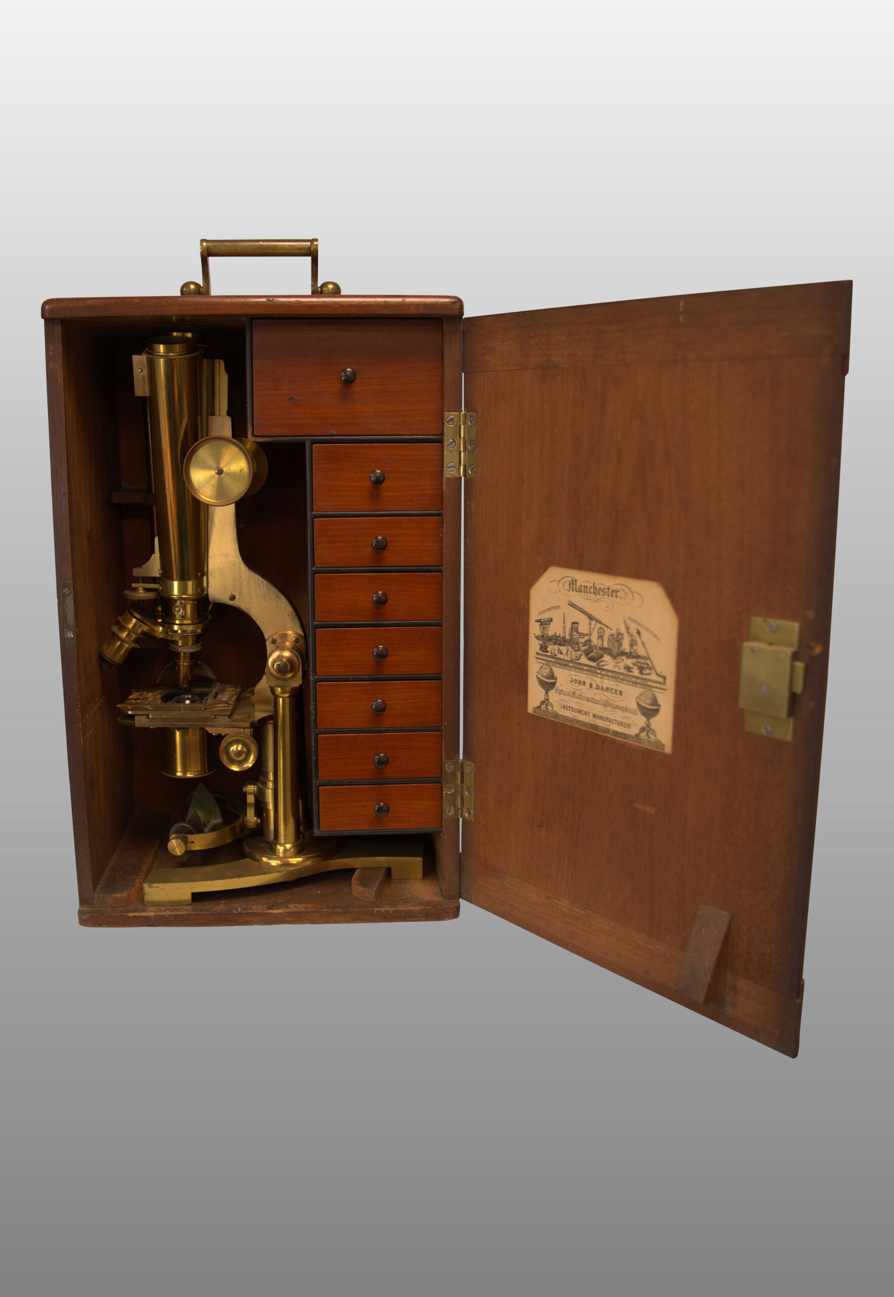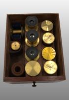 Les accessoires se composent de deux paires d’oculaires étiquetés A et B, trois oculaires simples étiquetés C, D et E, trois objectifs Dancer (2/3, 2 et 3 pouces), un objectif de 4 pouces de Robinson & Sons, Dublin, un prisme polarisant Nicol dans une monture rotative, un prisme d’analyse dans une monture rotative, une plaque de grenouille, des pinces à main, pinces de platine, condenseur achromatique avec divers arrêts, roue à membrane de sous-platine, auge en verre, étage de sélénite monté en laiton avec rotation, boîte sous tension, condensateur indépendant en œil de bœuf, outils de dissection et autres cotes et extrémités. Les autres tiroirs contiennent des lames de microscope préparées.