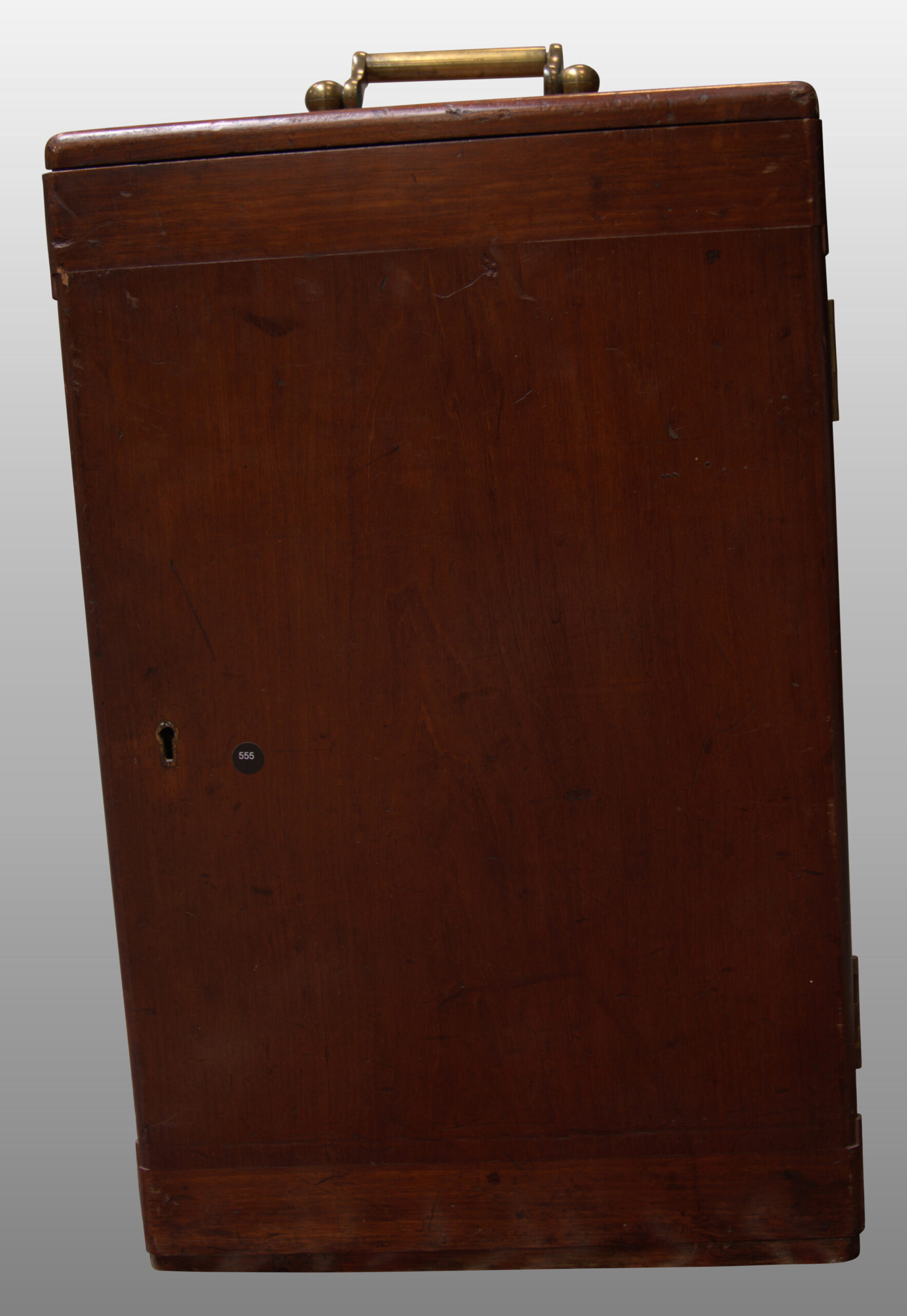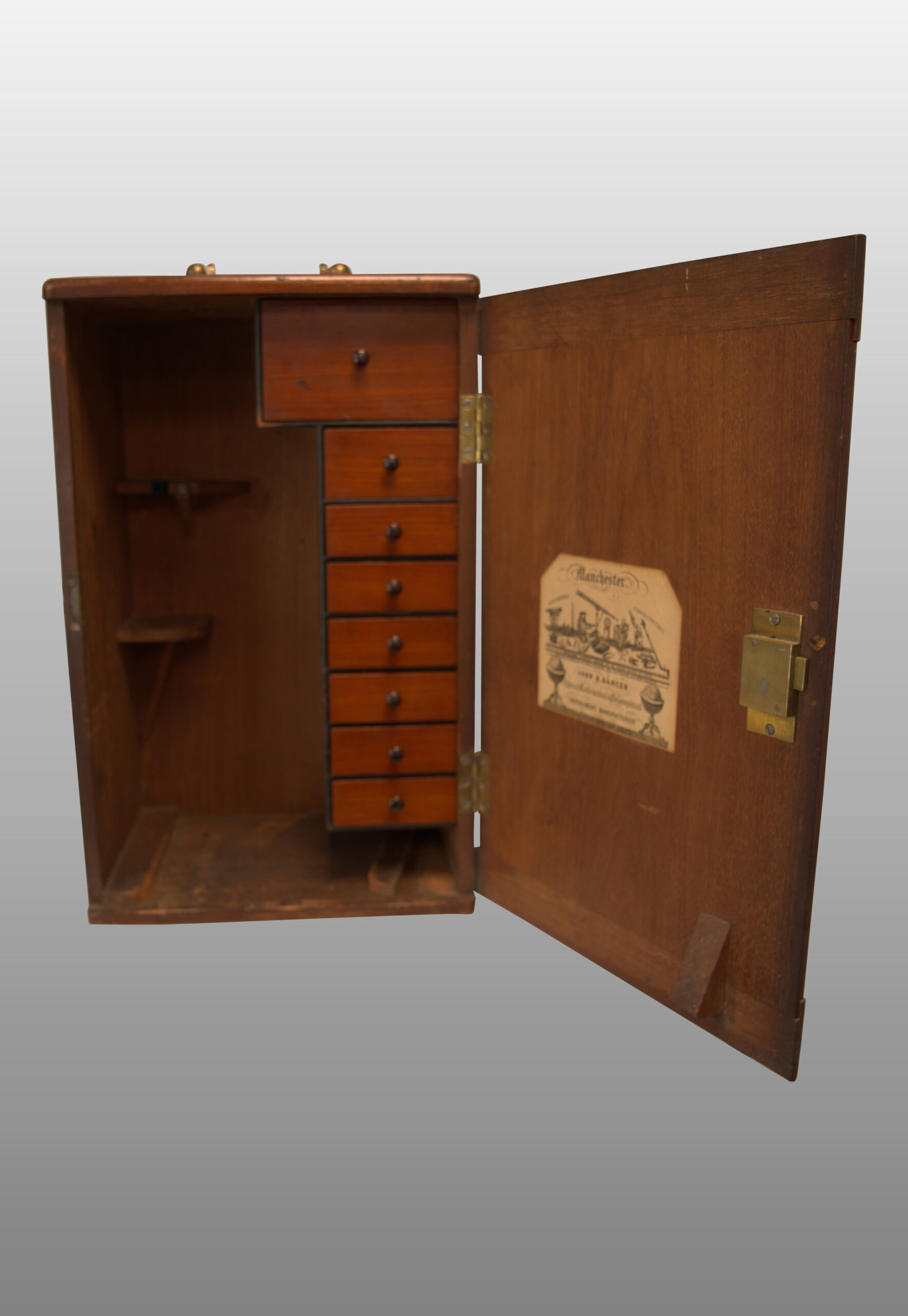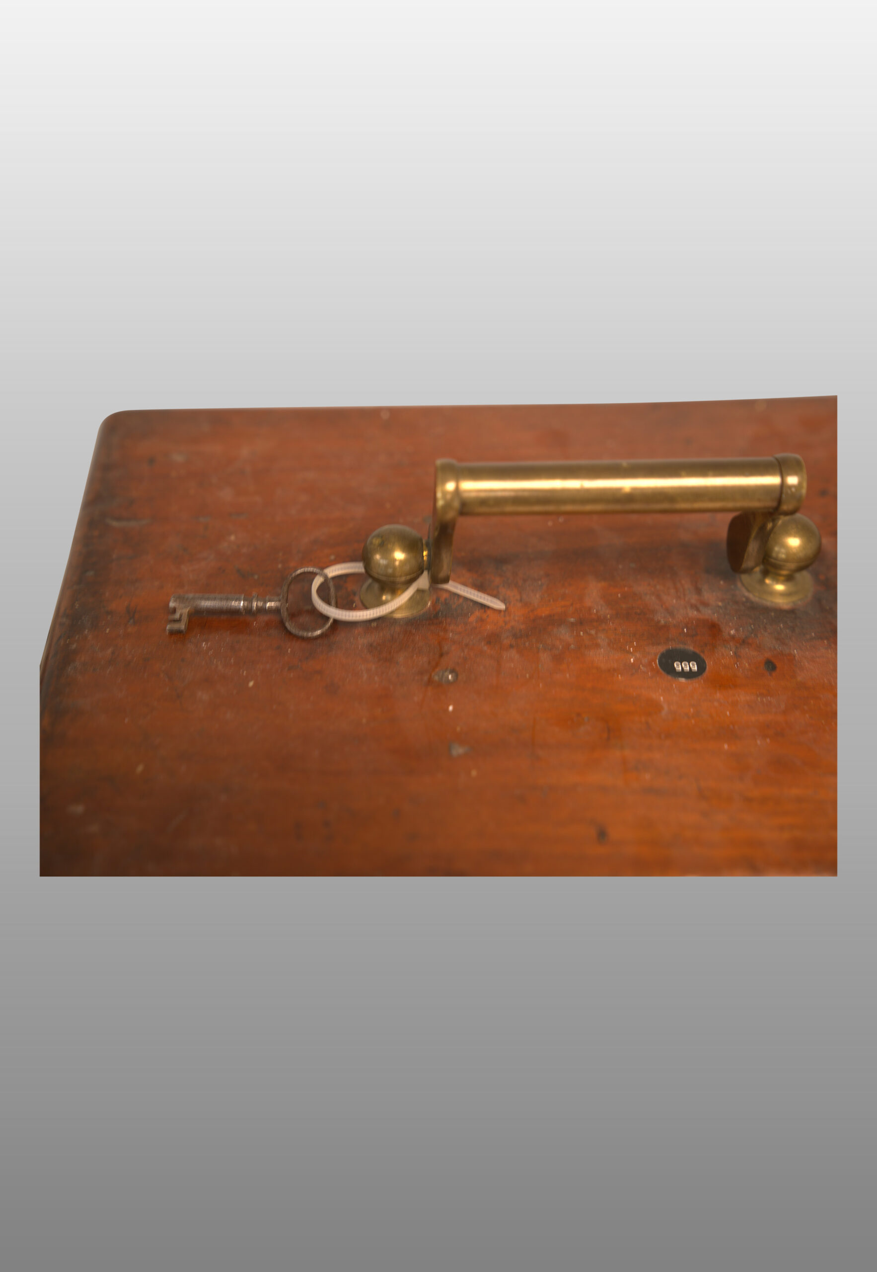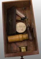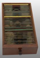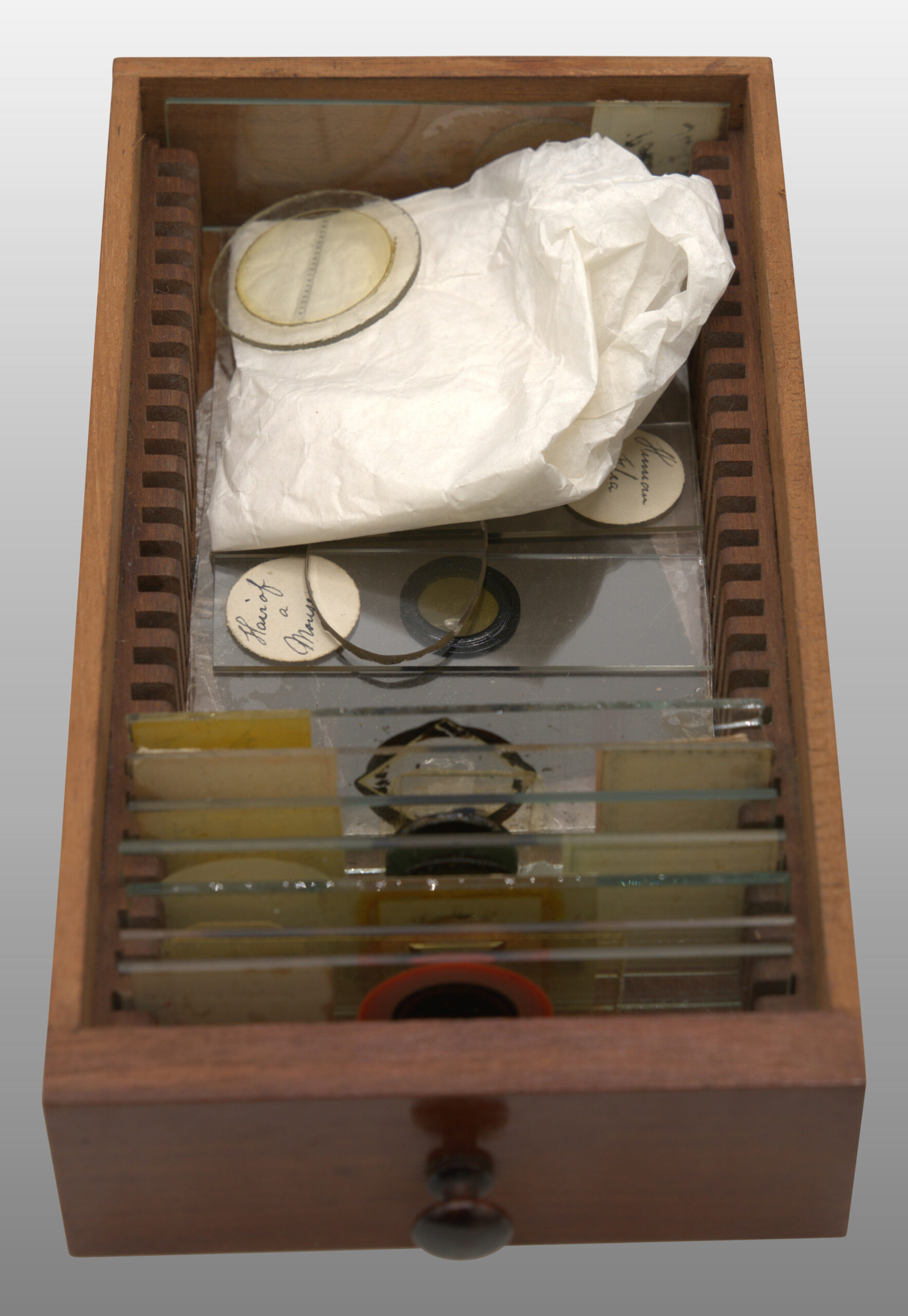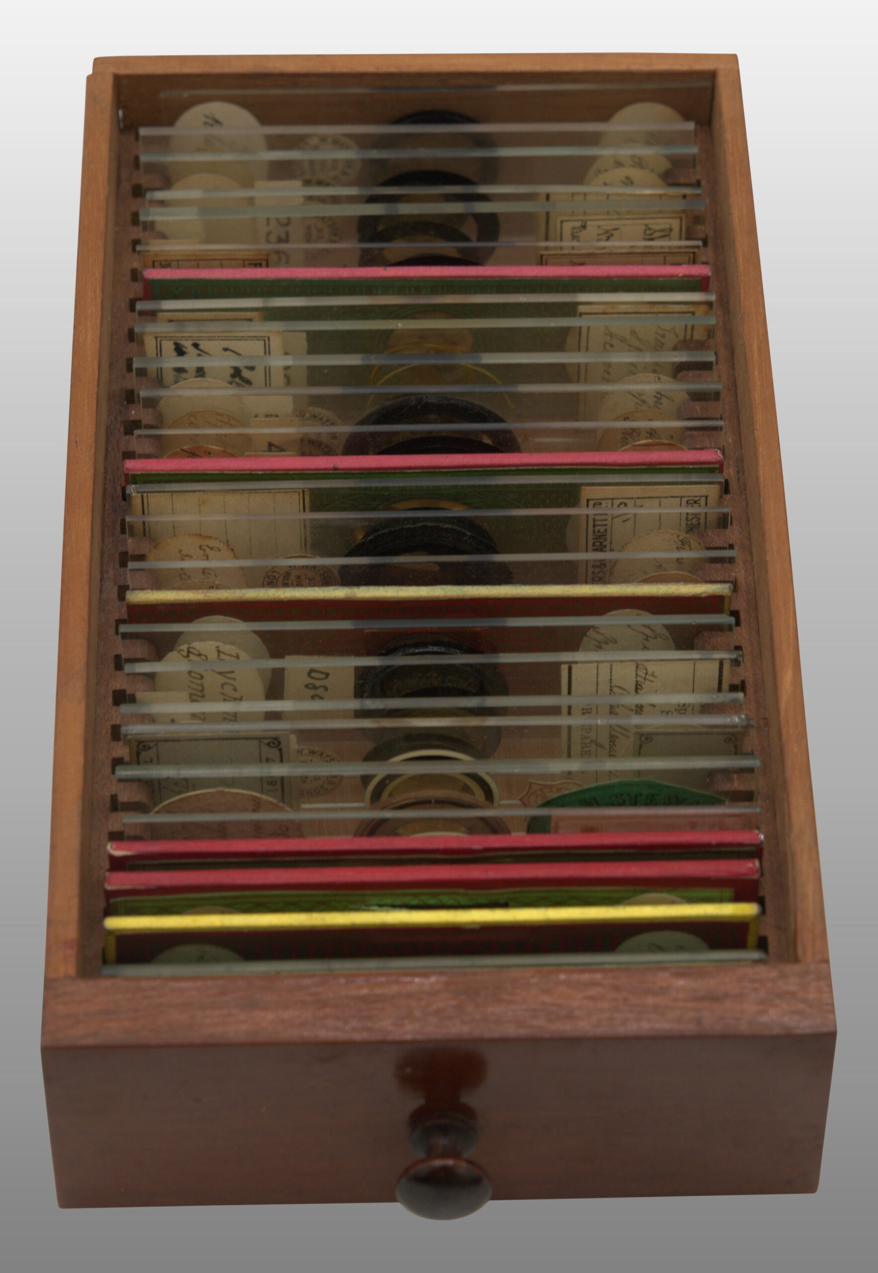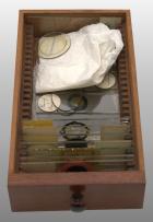 Les accessoires se composent de deux paires d’oculaires étiquetés A et B, trois oculaires simples étiquetés C, D et E, trois objectifs Dancer (2/3, 2 et 3 pouces), un objectif de 4 pouces de Robinson & Sons, Dublin, un prisme polarisant Nicol dans une monture rotative, un prisme d’analyse dans une monture rotative, une plaque de grenouille, des pinces à main, pinces de platine, condenseur achromatique avec divers arrêts, roue à membrane de sous-platine, auge en verre, étage de sélénite monté en laiton avec rotation, boîte sous tension, condensateur indépendant en œil de bœuf, outils de dissection et autres cotes et extrémités. Les autres tiroirs contiennent des lames de microscope préparées.