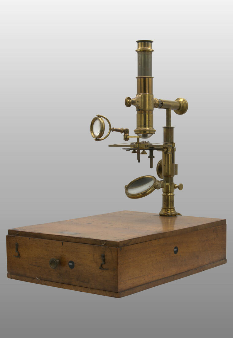 Une fois monté sur la boîte, le microscope pouvait être focalisé au moyen d’un mouvement à crémaillère et pignon. La platine ne pouvant être positionnée avec précision au moyen d’une vis sans fin. La colonne peut être inclinée. Miroir plan concave inclinable.