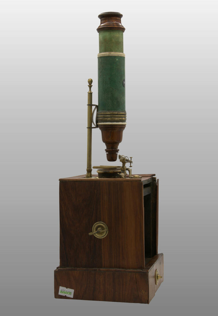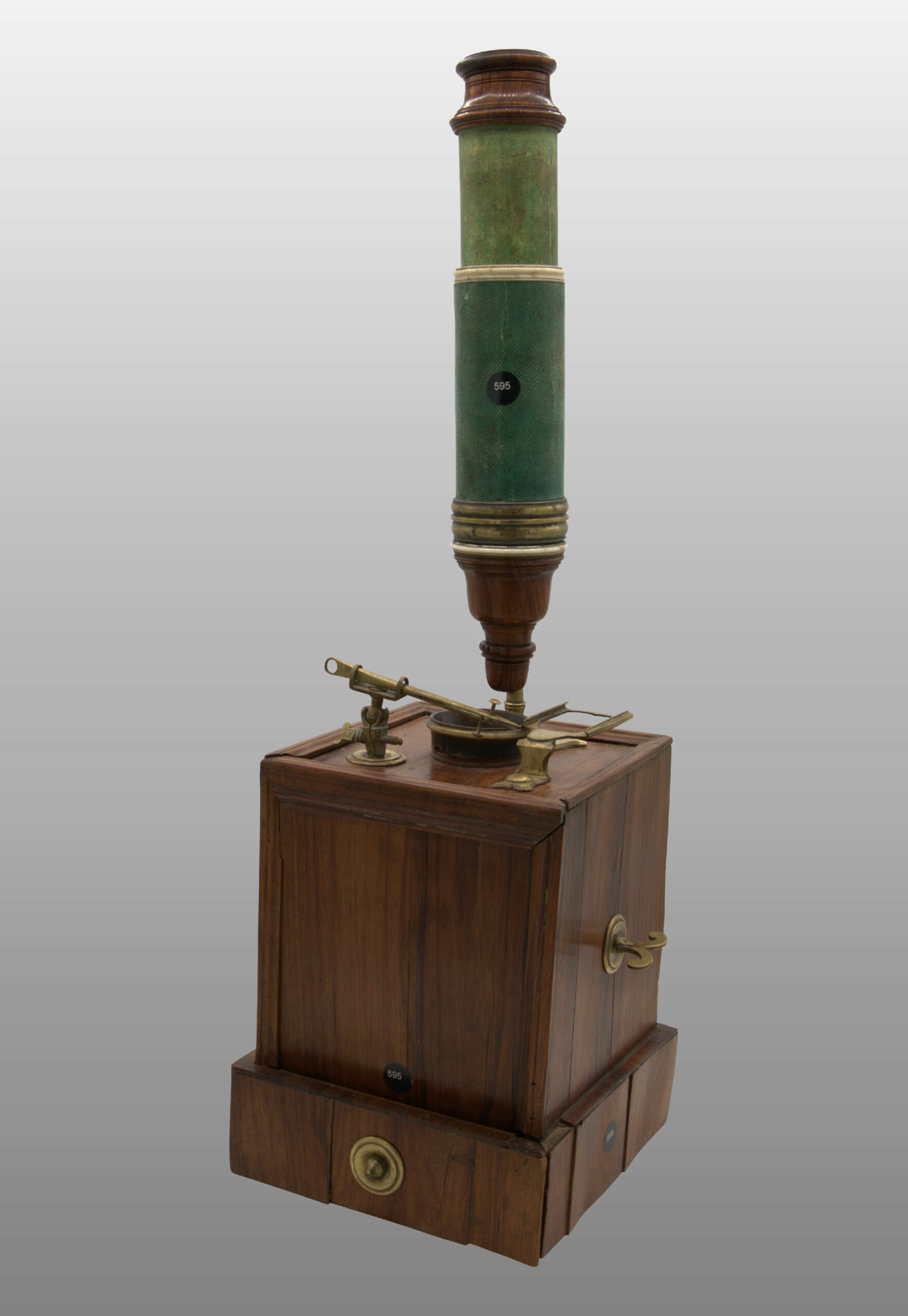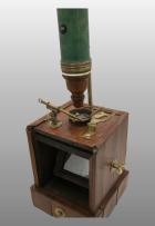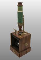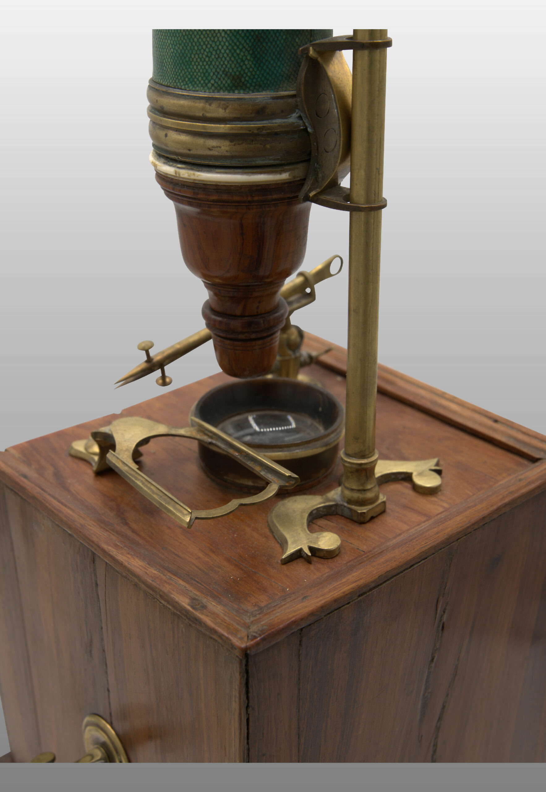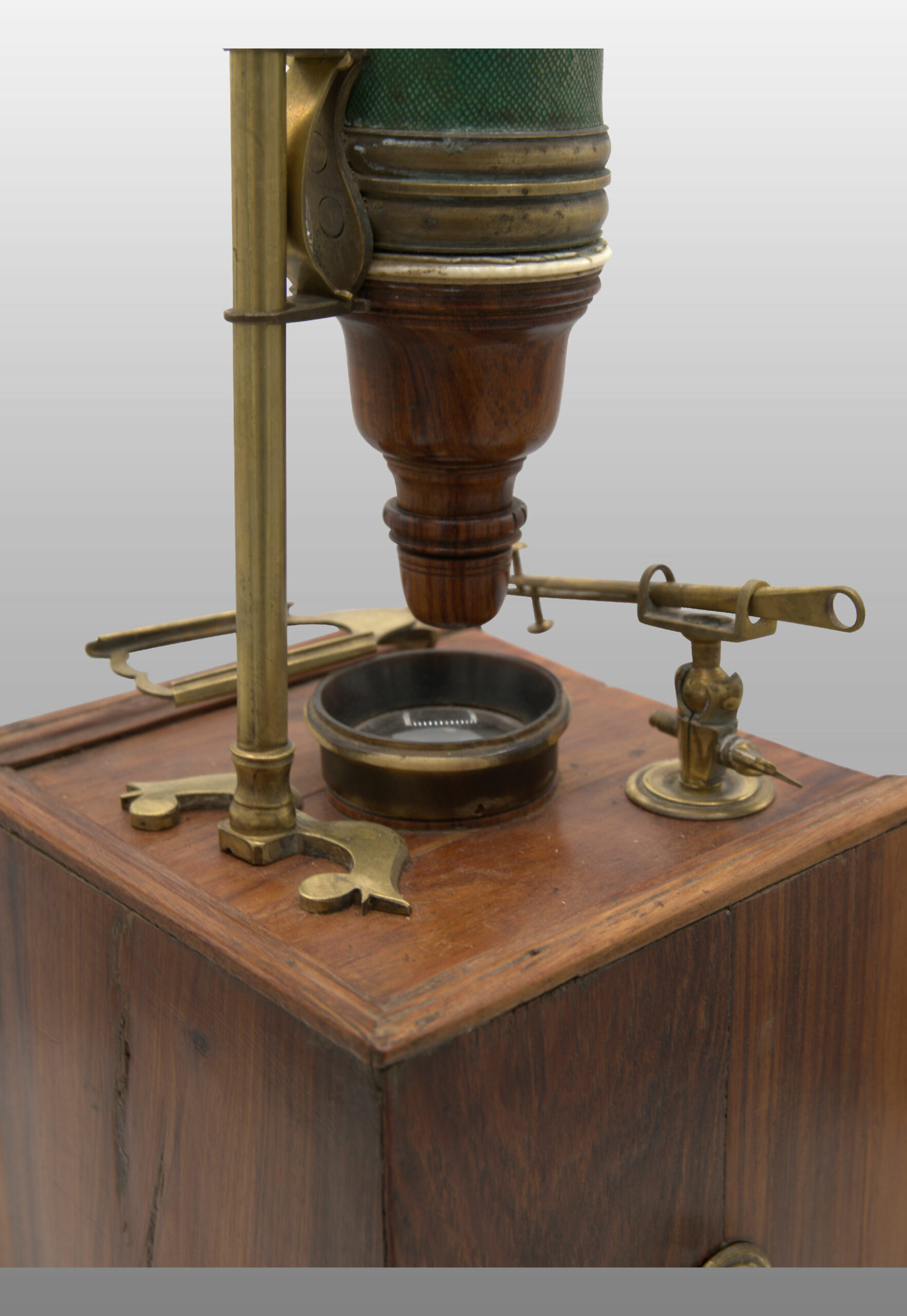 Montée sur un socle en forme de boite en marqueterie de bois de violette, une colonne ronde est fixée sur la plaque supérieure. Un ressort plat et long est en tension entre la tige ronde et le support du corps du microscope. Ce support peut monter ou descendre pour permettre la mise au point. Le tube en carton avec son optique à l’intérieur est glissé dans un support rond en laiton. Sur la face avant, il y a une plaque amovible vers le haut et qui donne accès à un grand miroir. Il est orientable de haut en bas grâce à deux boutons en laiton se trouvant sur les côtés de la boite. Sur la plaque supérieure, il y a un support de lame orientable latéralement et un support de pique. Un tiroir se trouve dans la partie inférieure. Le tube est en carton avec une partie supérieure en bois et sa lentille pour l’oculaire, en bas également un support en bois supportant l’objectif et sa monture en laiton, il n’y a pas de lentille intermédiaire. Le tube supérieur peint en vert coulisse dans le tube inférieur recouvert de galuchat vert. Il faut que l’oeuil soit loin de l’oculaire pour avoir un grand champ eclairé.