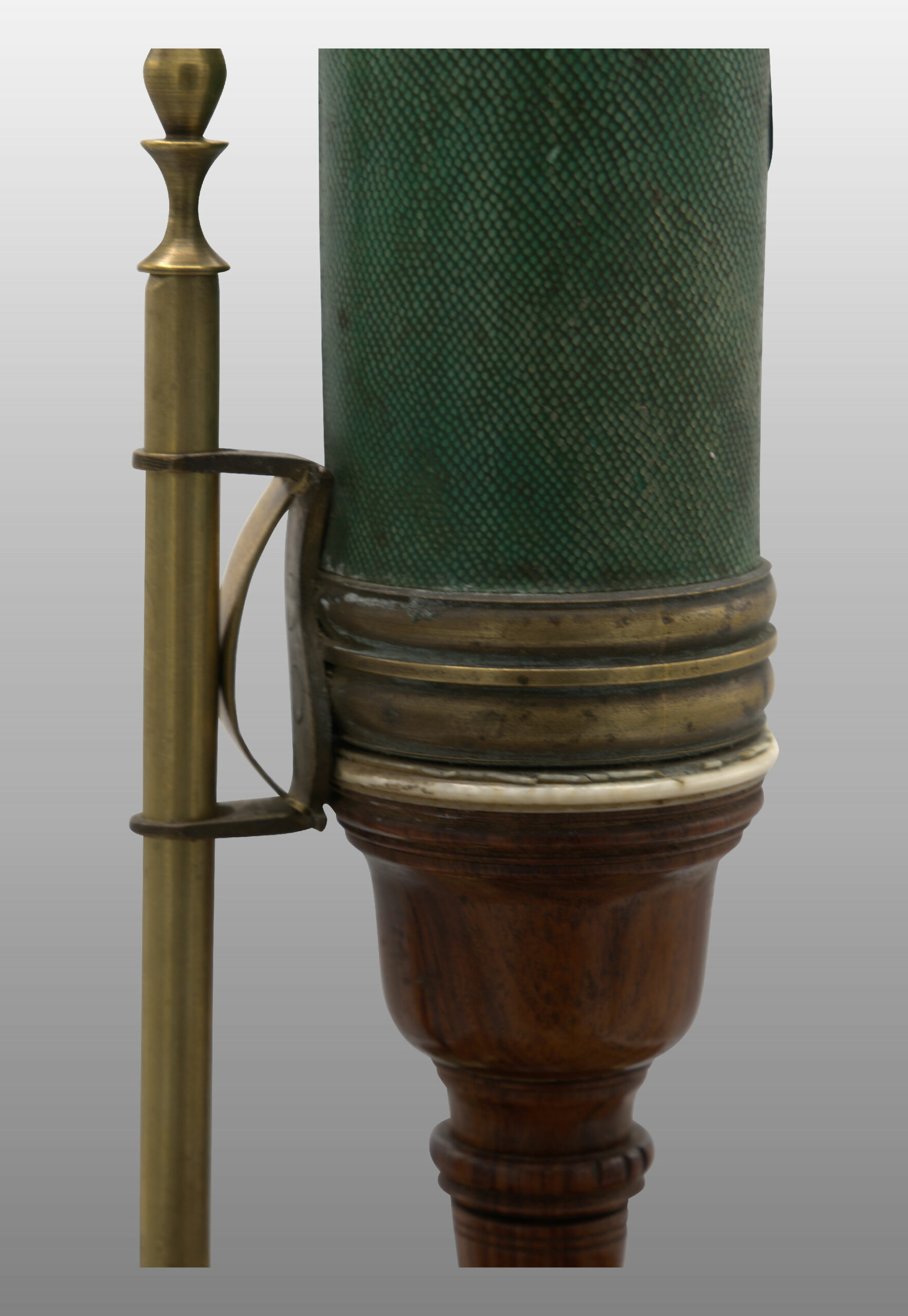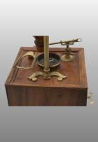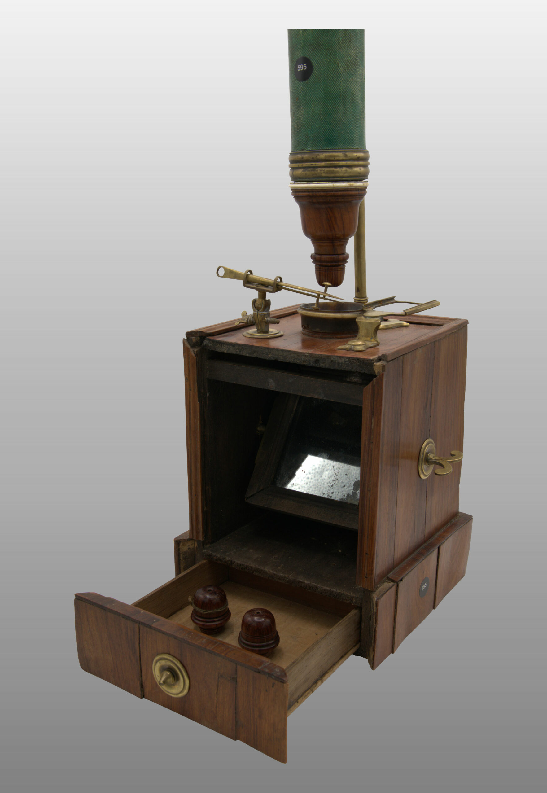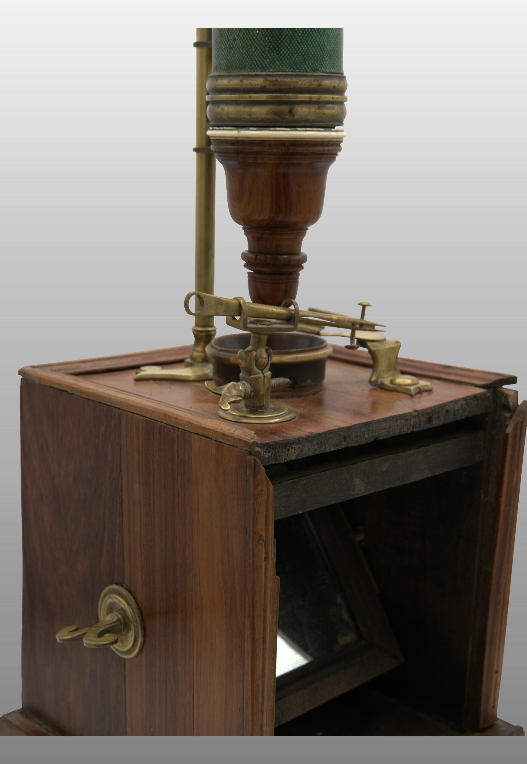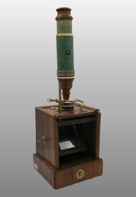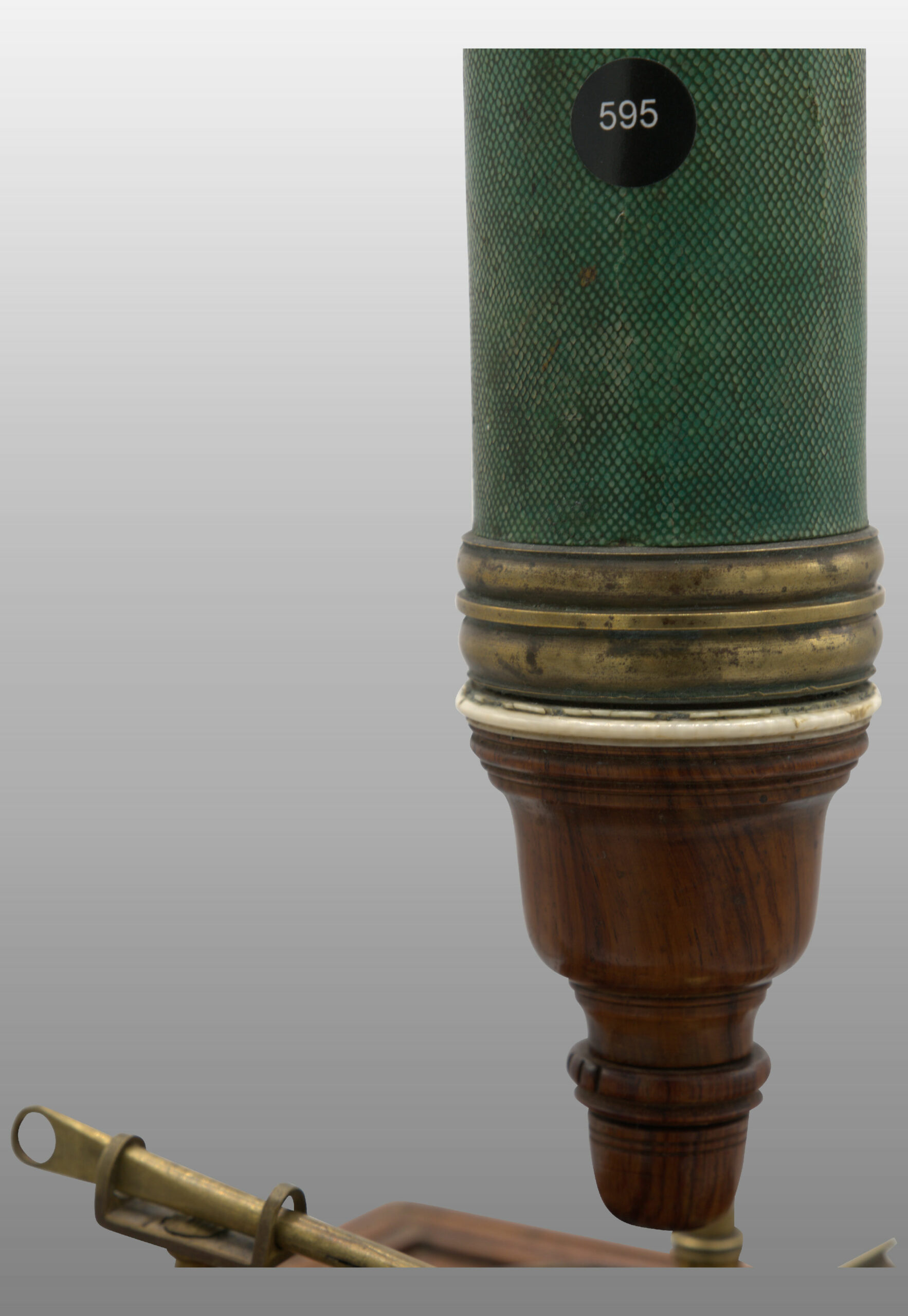 Montée sur un socle en forme de boite en marqueterie de bois de violette, une colonne ronde est fixée sur la plaque supérieure. Un ressort plat et long est en tension entre la tige ronde et le support du corps du microscope. Ce support peut monter ou descendre pour permettre la mise au point. Le tube en carton avec son optique à l’intérieur est glissé dans un support rond en laiton. Sur la face avant, il y a une plaque amovible vers le haut et qui donne accès à un grand miroir. Il est orientable de haut en bas grâce à deux boutons en laiton se trouvant sur les côtés de la boite. Sur la plaque supérieure, il y a un support de lame orientable latéralement et un support de pique. Un tiroir se trouve dans la partie inférieure. Le tube est en carton avec une partie supérieure en bois et sa lentille pour l’oculaire, en bas également un support en bois supportant l’objectif et sa monture en laiton, il n’y a pas de lentille intermédiaire. Le tube supérieur peint en vert coulisse dans le tube inférieur recouvert de galuchat vert. Il faut que l’oeuil soit loin de l’oculaire pour avoir un grand champ eclairé.