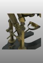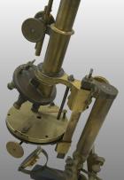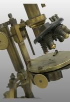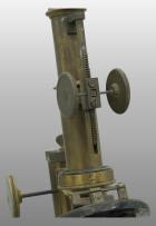 La potence supérieure ronde provient surement d’un vieux microscope. En haut, se trouve une vis papillon qui maintient une colonne triangulaire avec une crémaillère fraisée dans la masse. Un bouton sert à ajuster la mise au point. Cette colonne ressemble beaucoup à Merz. Un axe vertical sert de butée de hauteur pour ne pas casser les objectifs ou la préparation.