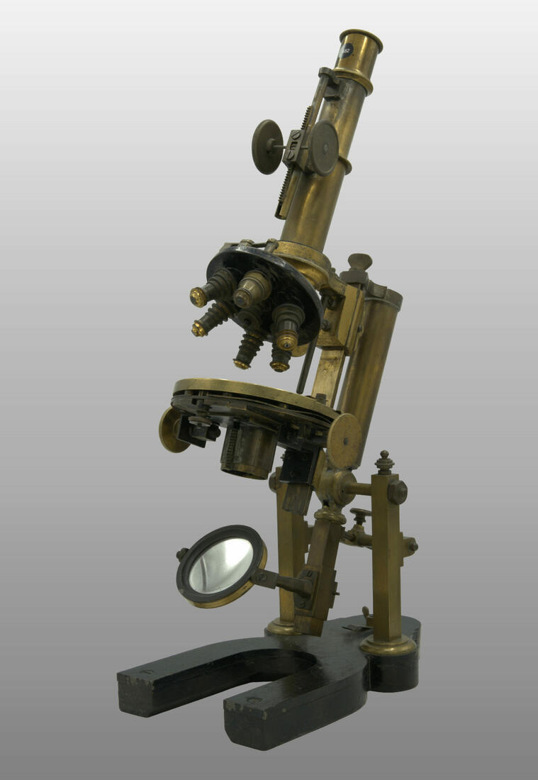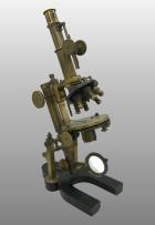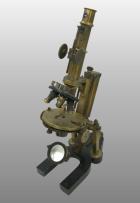 Sur un pied en U d’une longueur de 20 cm et d’une largeur de 12 cm, sont fixées deux colonnes carrées qui supportent un axe horizontal permettant de faire basculer tout le microscope. Un petit axe rentre dans un trou avec une vis de blocage. En serrant cette vis, elle bloque la tige et donc l’inclinaison du microscope.