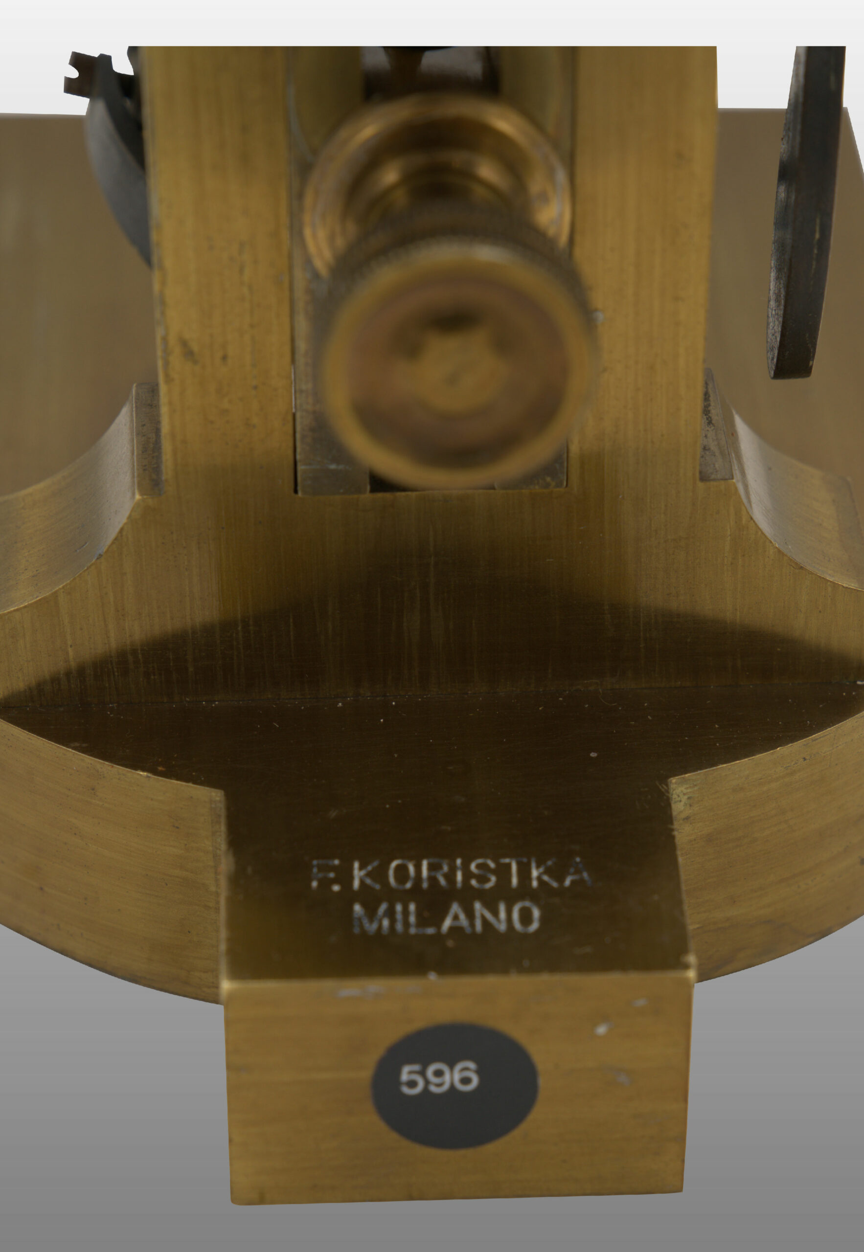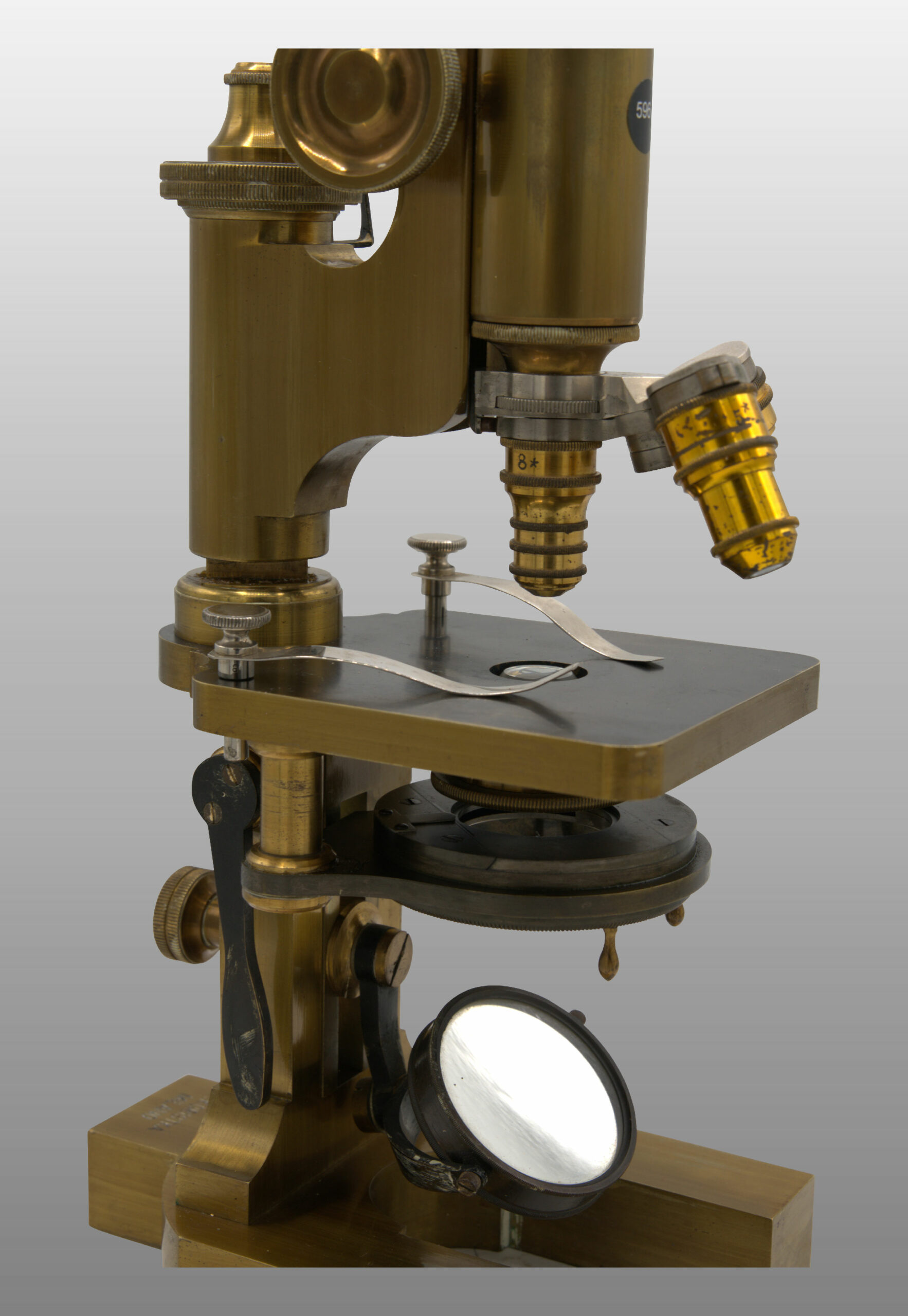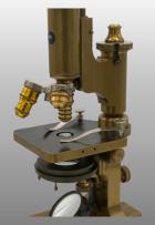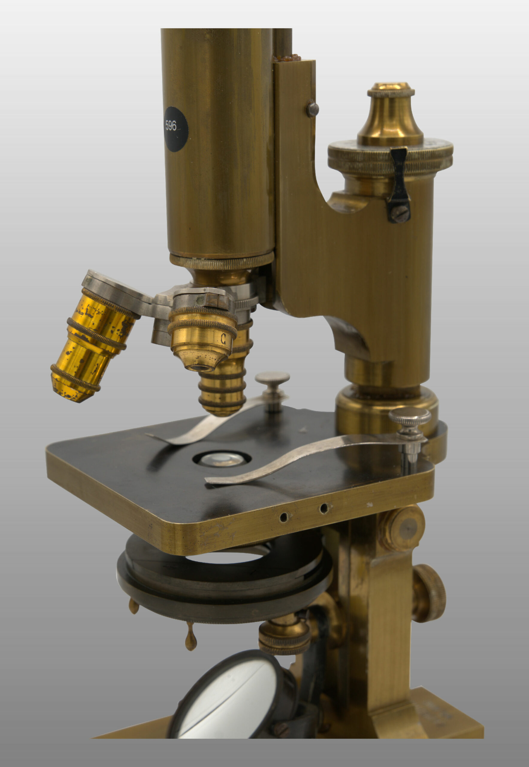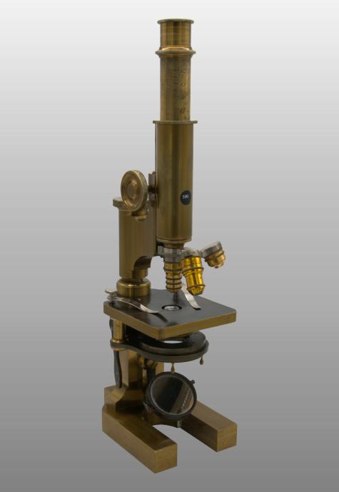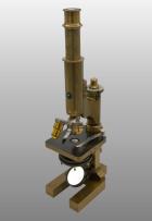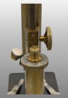 Pied en fer à cheval. Une plaque est vissée à l’arrière du U. En haut de cette plaque se trouve une articulation permettant de basculer tout l’ensemble. Il y a un levier qui sert de blocage à l’inclinaison. Sur cette dernière la platine est fixée par deux vis. Une colonne supportant le tube est maintenue par un écrou. En haut de cette colonne se trouve la vis micrométrique. Platine fixe. Mise au foyer macrométrique par le biais de 1 bouton latéral, avec miroir plan concave mobile fixé par une tirette sous la platine et réglable en hauteur. Condenseur d’Abbe sans diaphragme autocentré fixé sous la platine. Une deuxième pièce articulée autour d’un axe fixé sous la platine est escamotable, On peut tourner un support dans lequel se trouve une glissière excentrable latéralement. Révolver à trois trous. Deux valets.