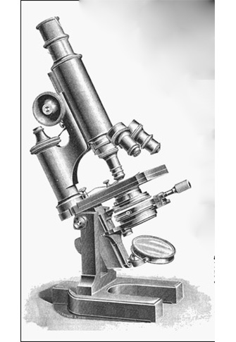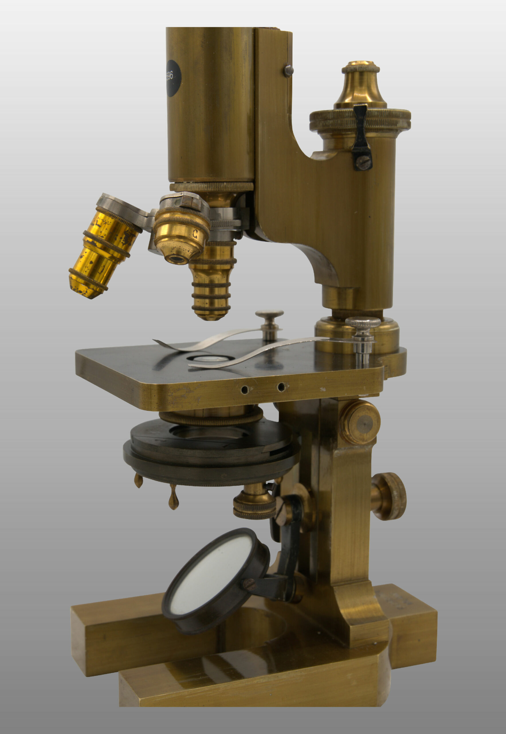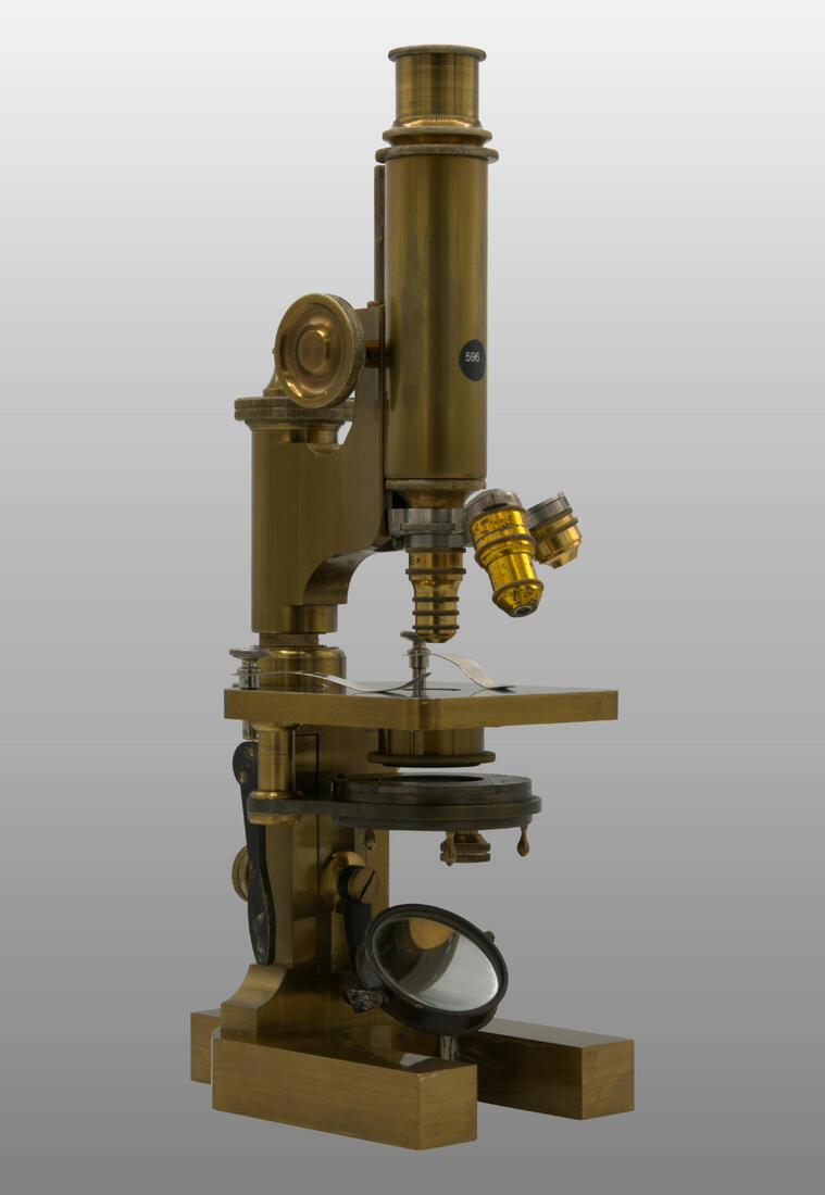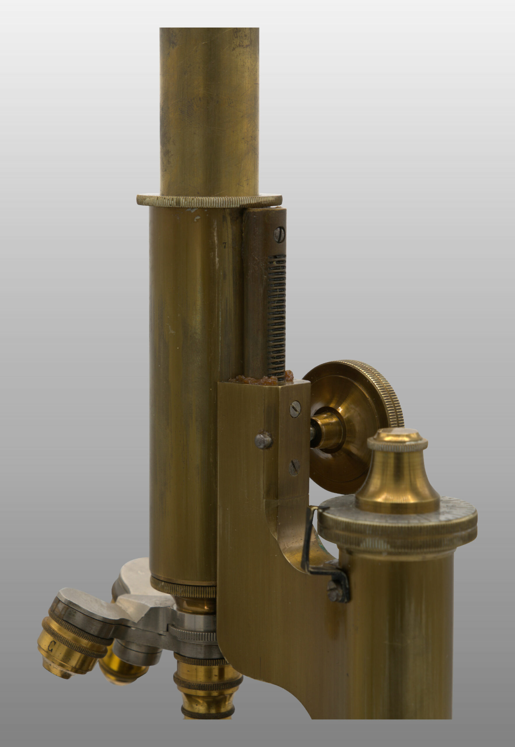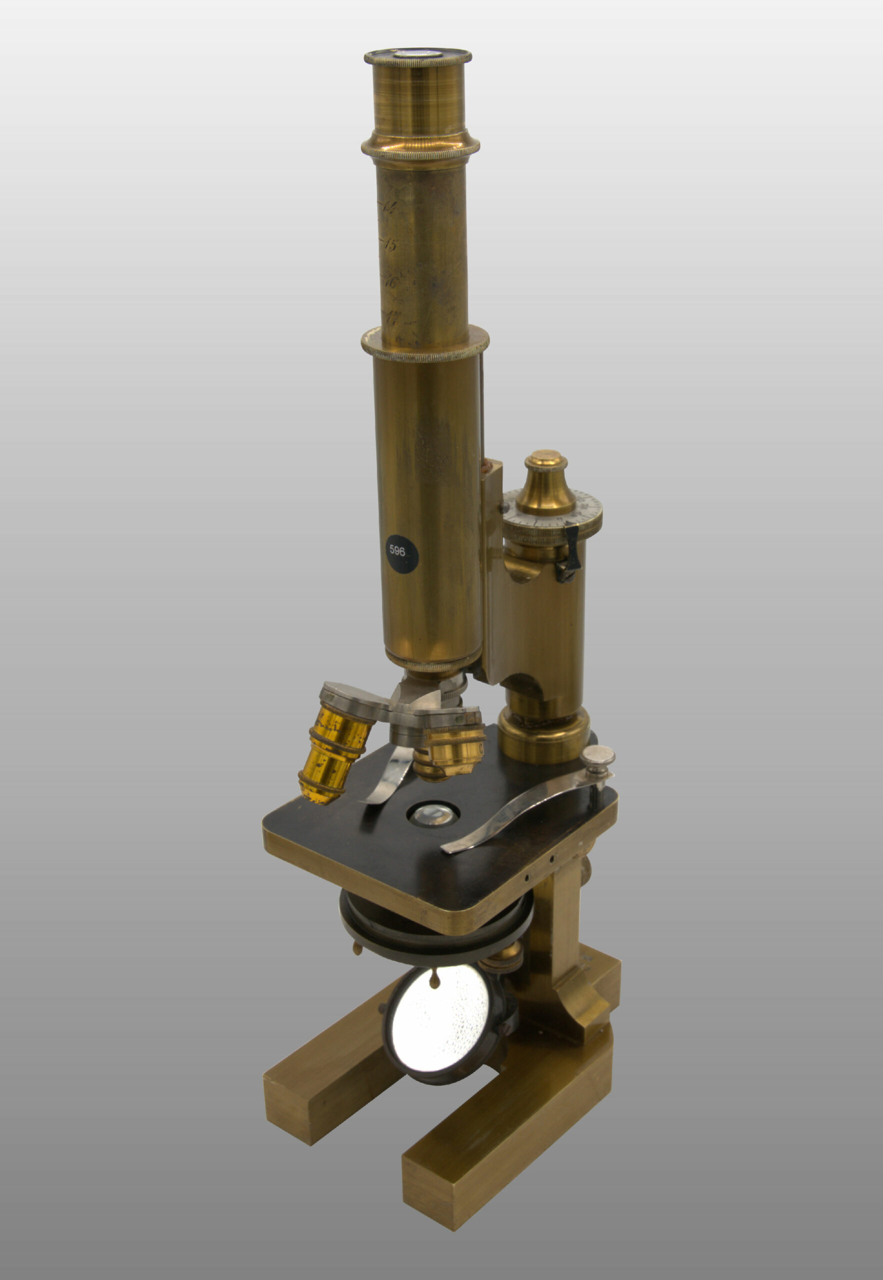 Pied en fer à cheval. Une plaque est vissée à l’arrière du U. En haut de cette plaque se trouve une articulation permettant de basculer tout l’ensemble. Il y a un levier qui sert de blocage à l’inclinaison. Sur cette dernière la platine est fixée par deux vis. Une colonne supportant le tube est maintenue par un écrou. En haut de cette colonne se trouve la vis micrométrique. Platine fixe. Mise au foyer macrométrique par le biais de 1 bouton latéral, avec miroir plan concave mobile fixé par une tirette sous la platine et réglable en hauteur. Condenseur d’Abbe sans diaphragme autocentré fixé sous la platine. Une deuxième pièce articulée autour d’un axe fixé sous la platine est escamotable, On peut tourner un support dans lequel se trouve une glissière excentrable latéralement. Révolver à trois trous. Deux valets.