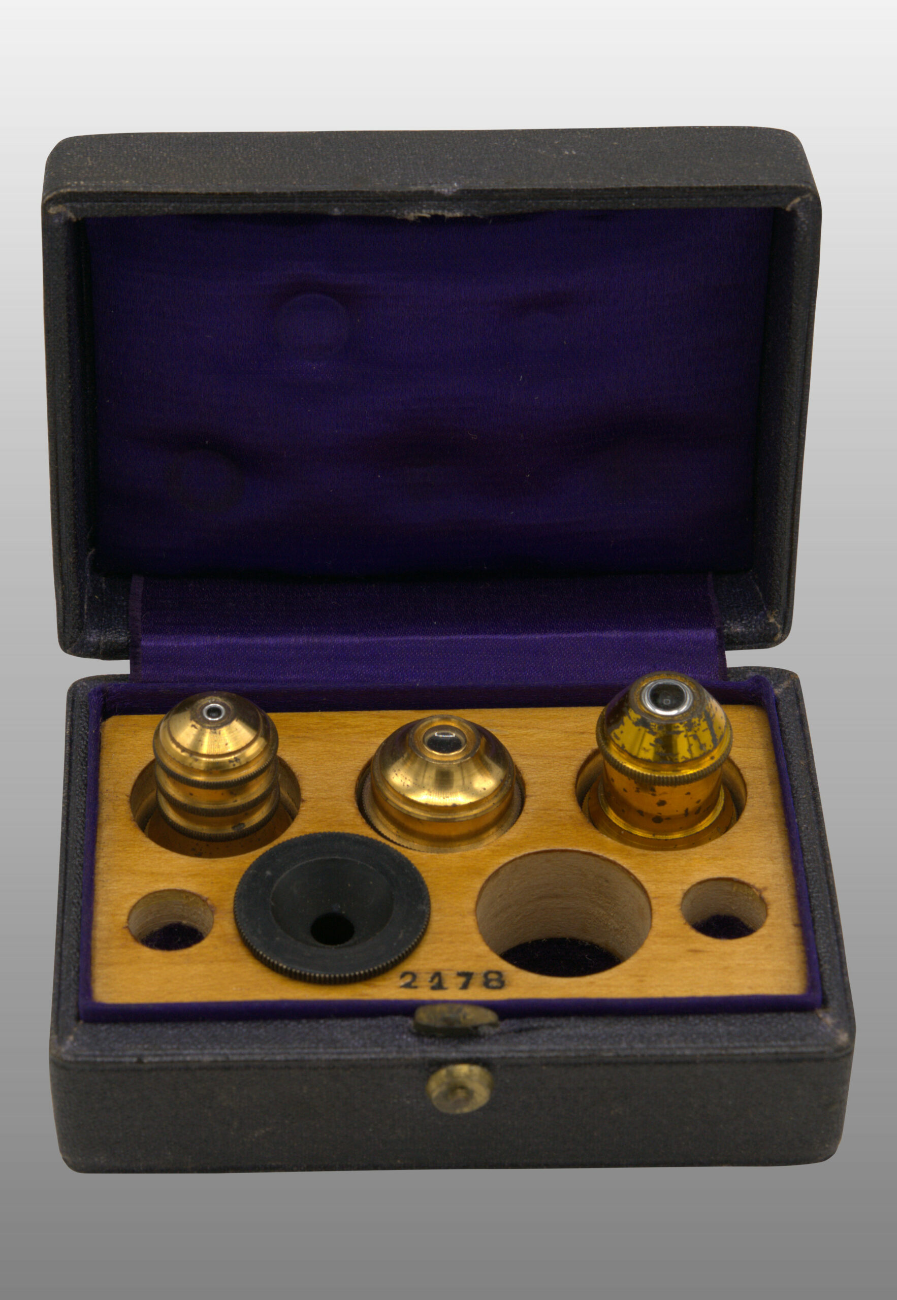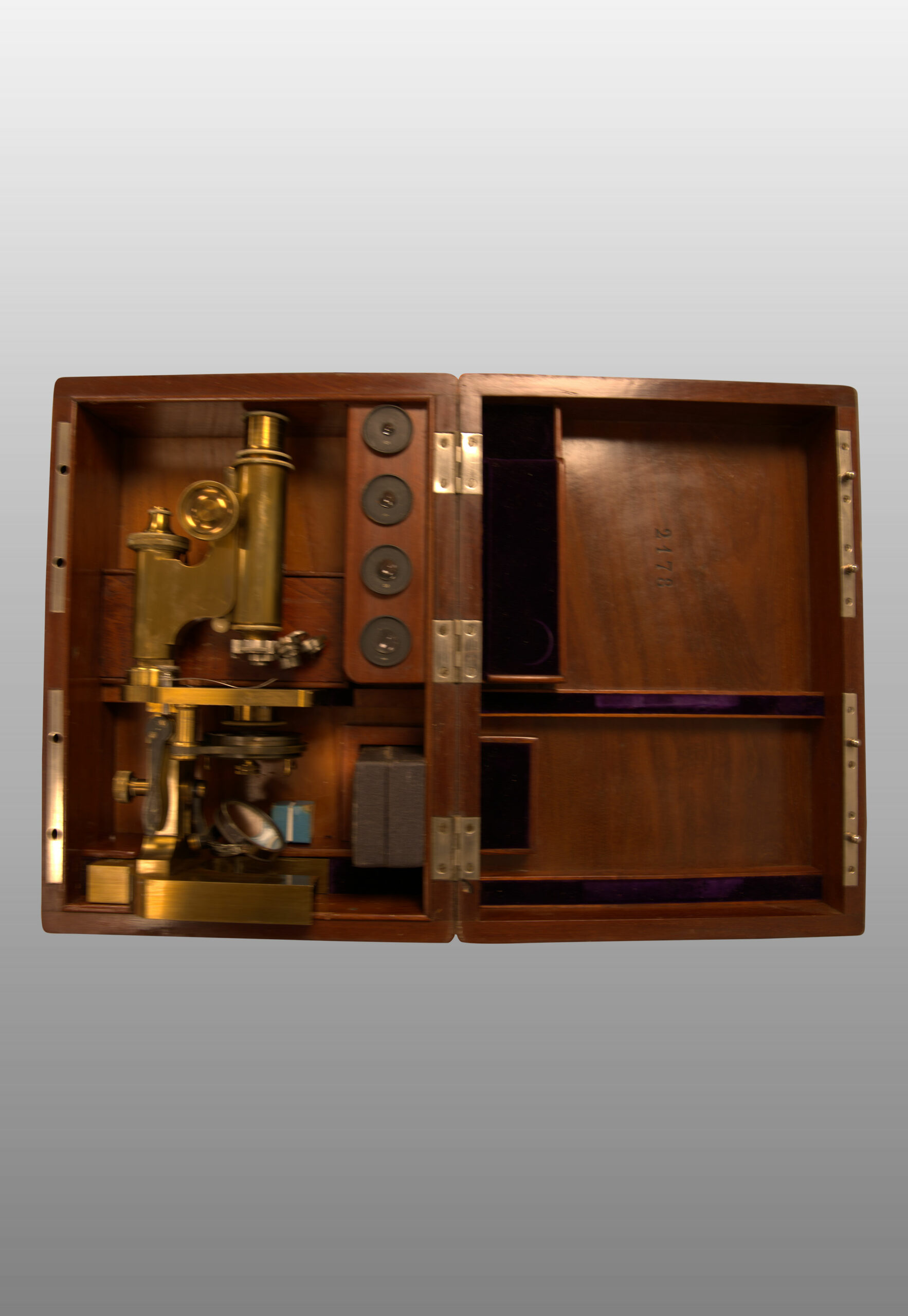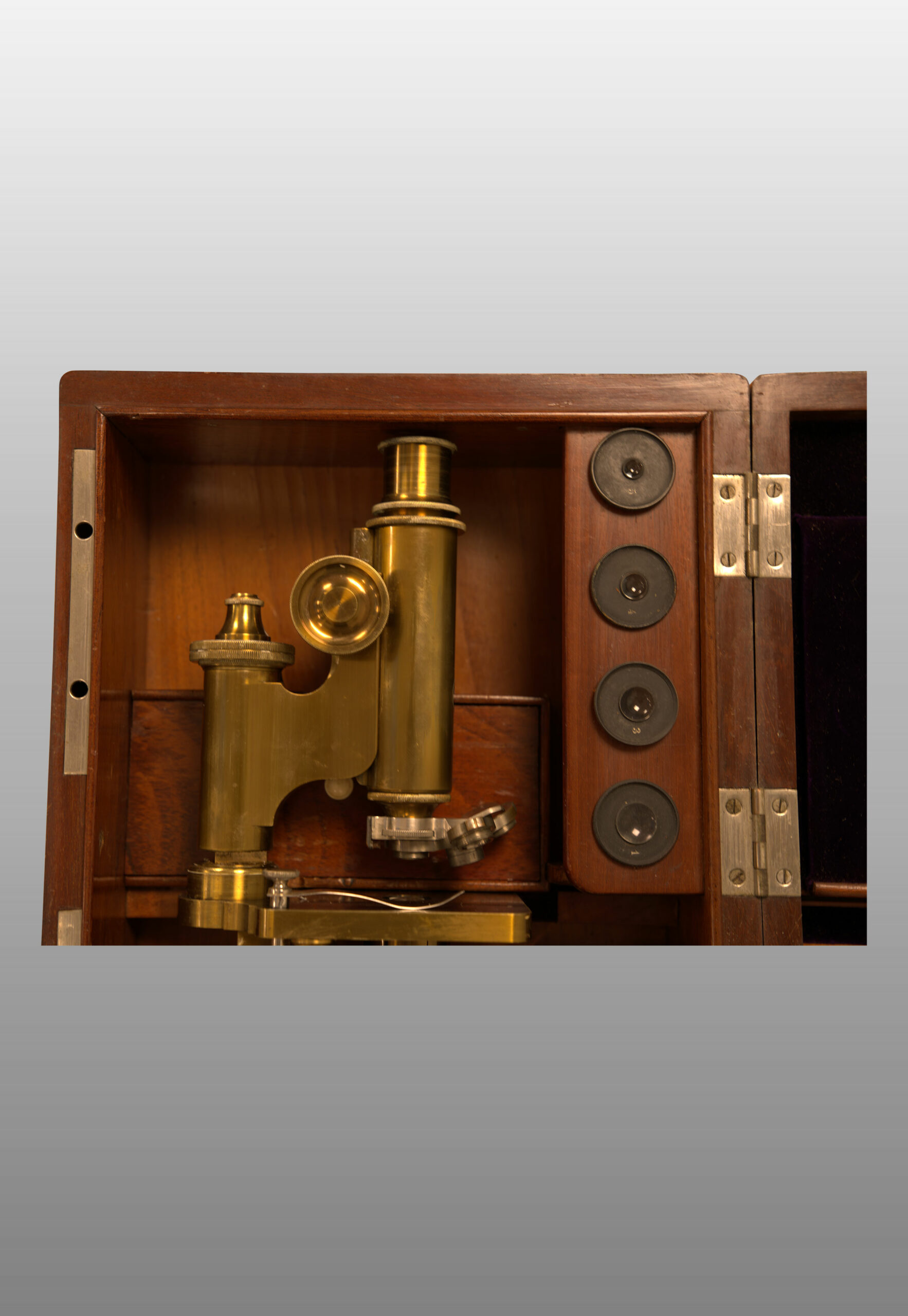 Description 596 :        Boite en acajou (23x 12×32 cm), Oculaire 1, 2, 3, 4, 5 Objectif 5, 8, c. Clef, revolver 3 trous. 2 valets. 1 condenseur. Boite objectifs avec numéro,