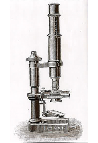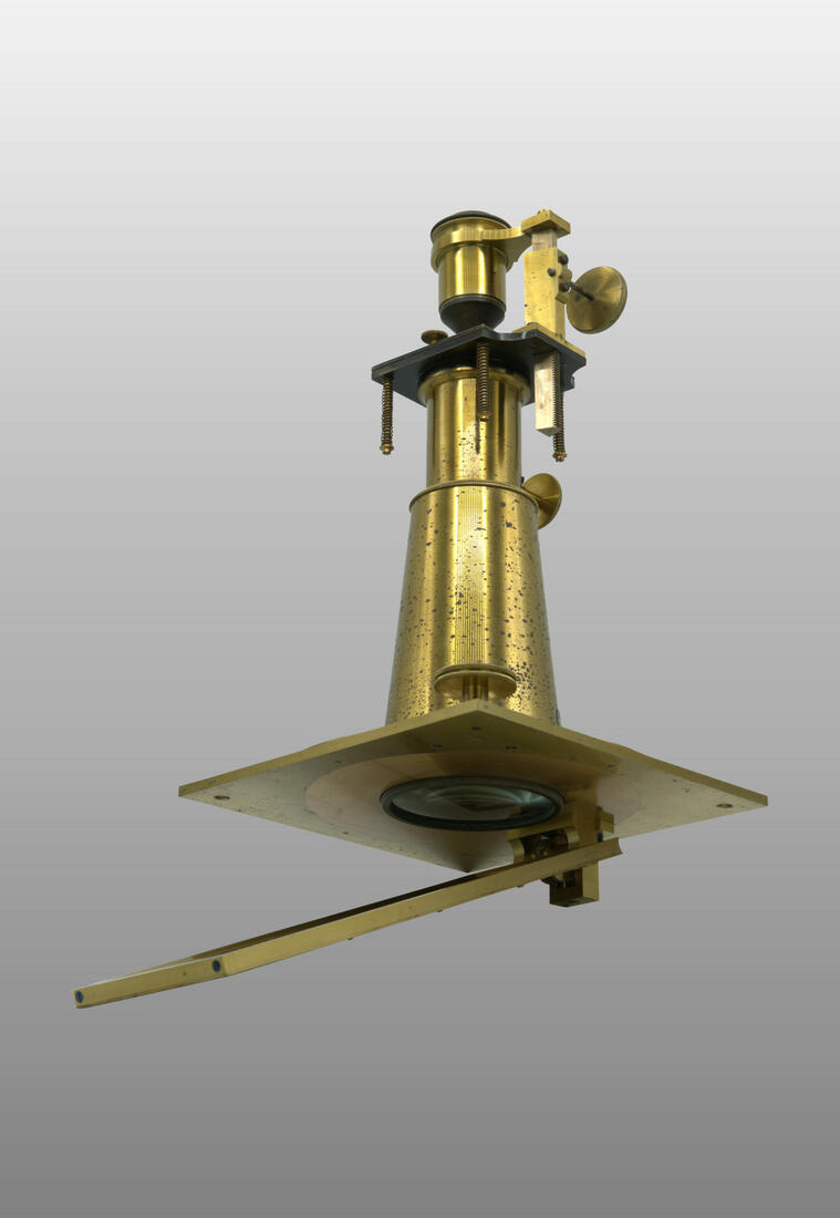 Pied en fer à cheval. Platine fixe. Mise au foyer par la colonne, avec miroir mobile fixé sur un levier sous la platine. Une glissière escamotable en queue d’aronde supportant le fourreau de diaphragme sous la platine. Vis micrométrique située sur le haut de la colonne. 2 valets.