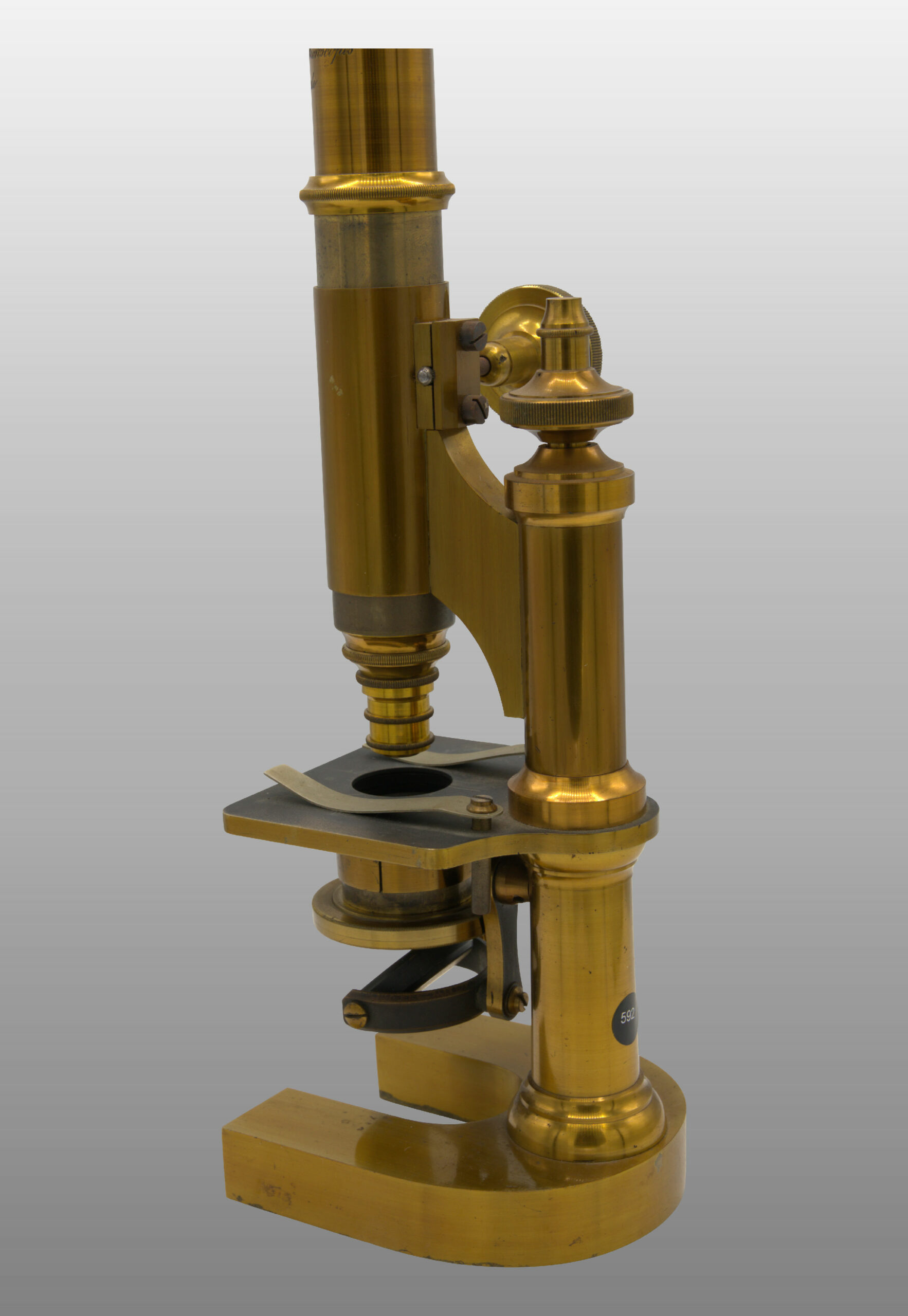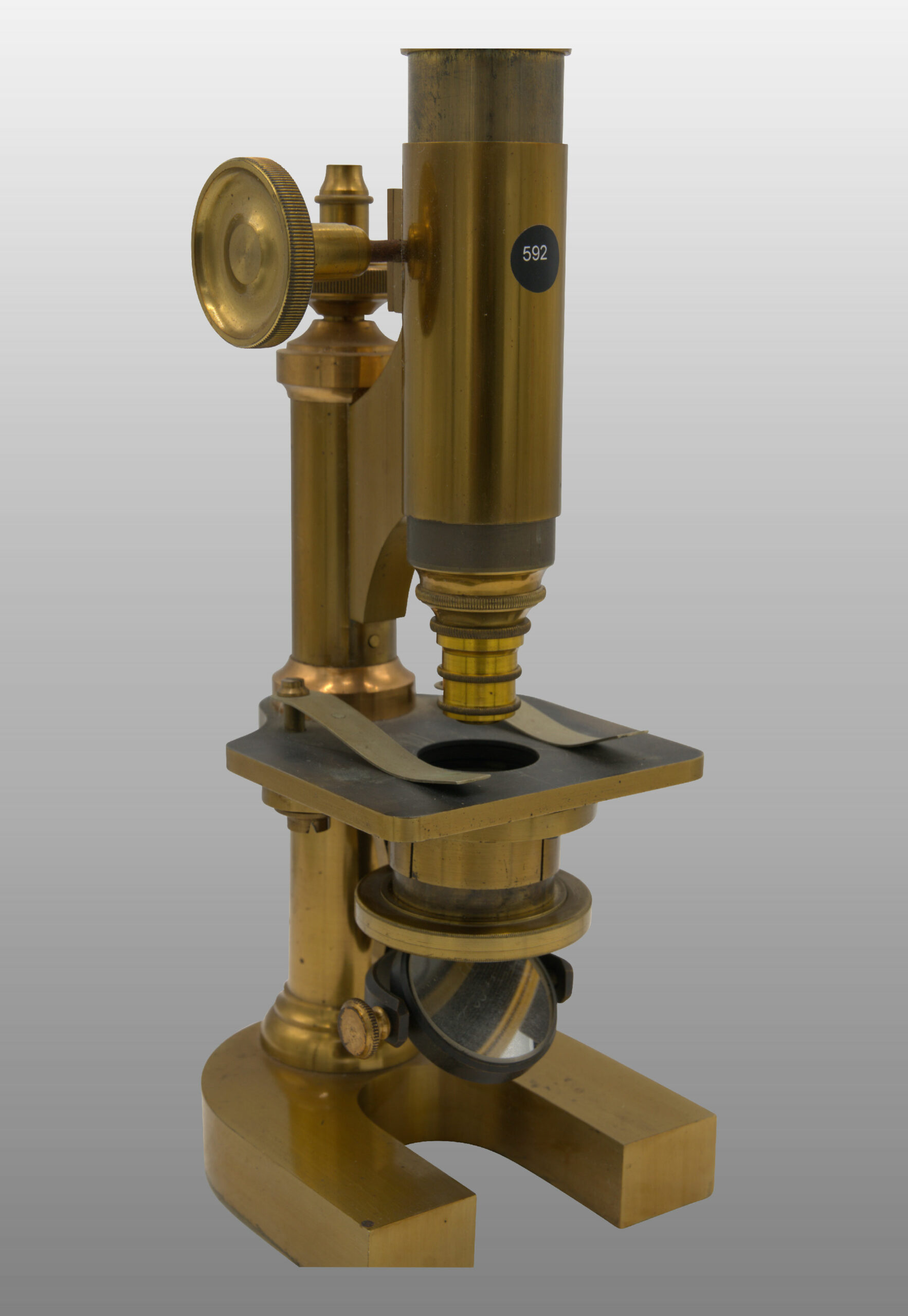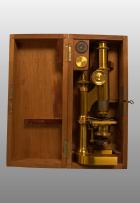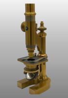 Pied en fer à cheval. Platine fixe. Mise au foyer par le biais d’un bouton macrométrique entrainant un pignon sur une crémaillére, avec miroir mobile pour l’éclairage oblique, un condenseur composé des systèmes d’objectifs n°1, 4 et des oculaires n°1 ,3