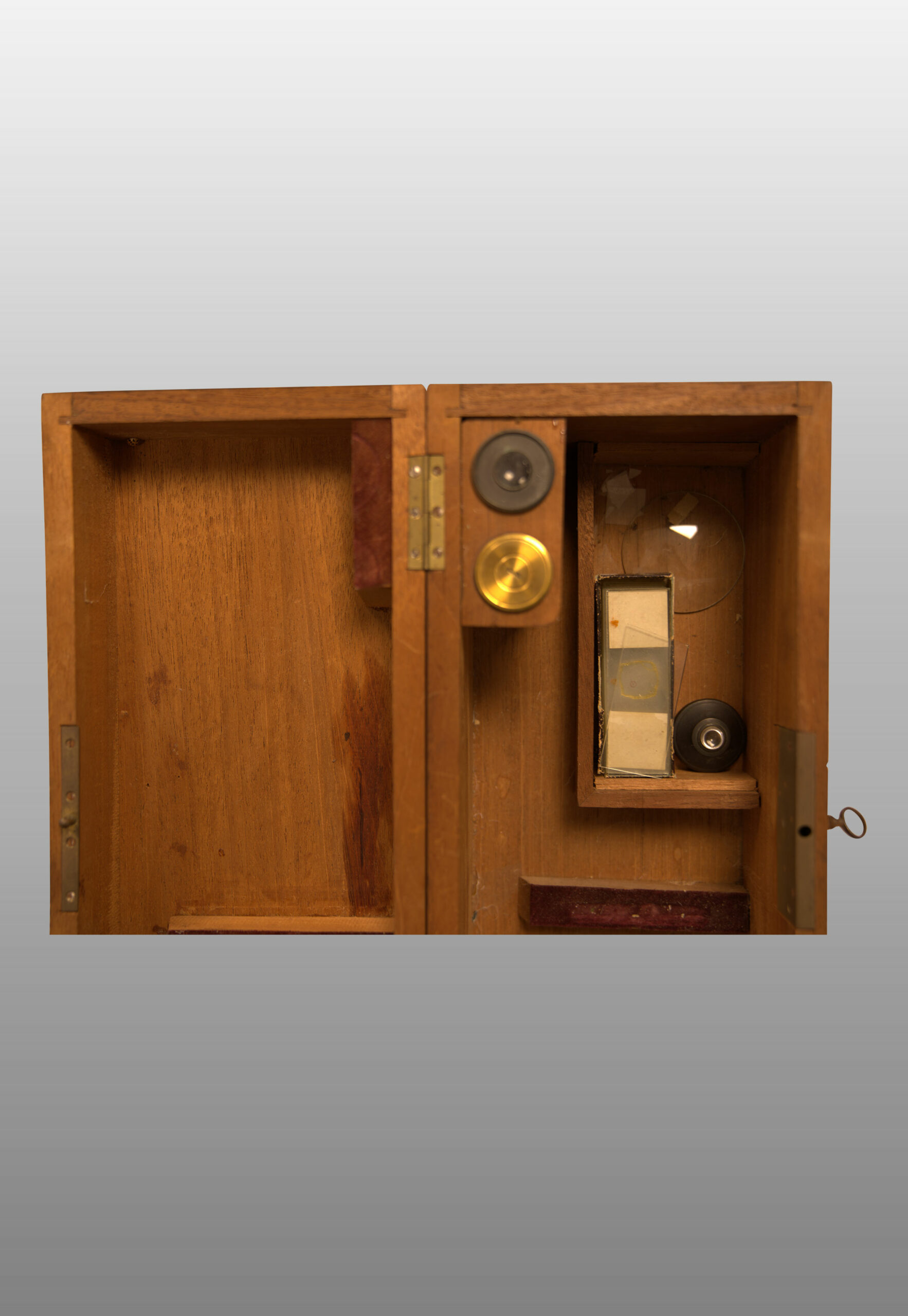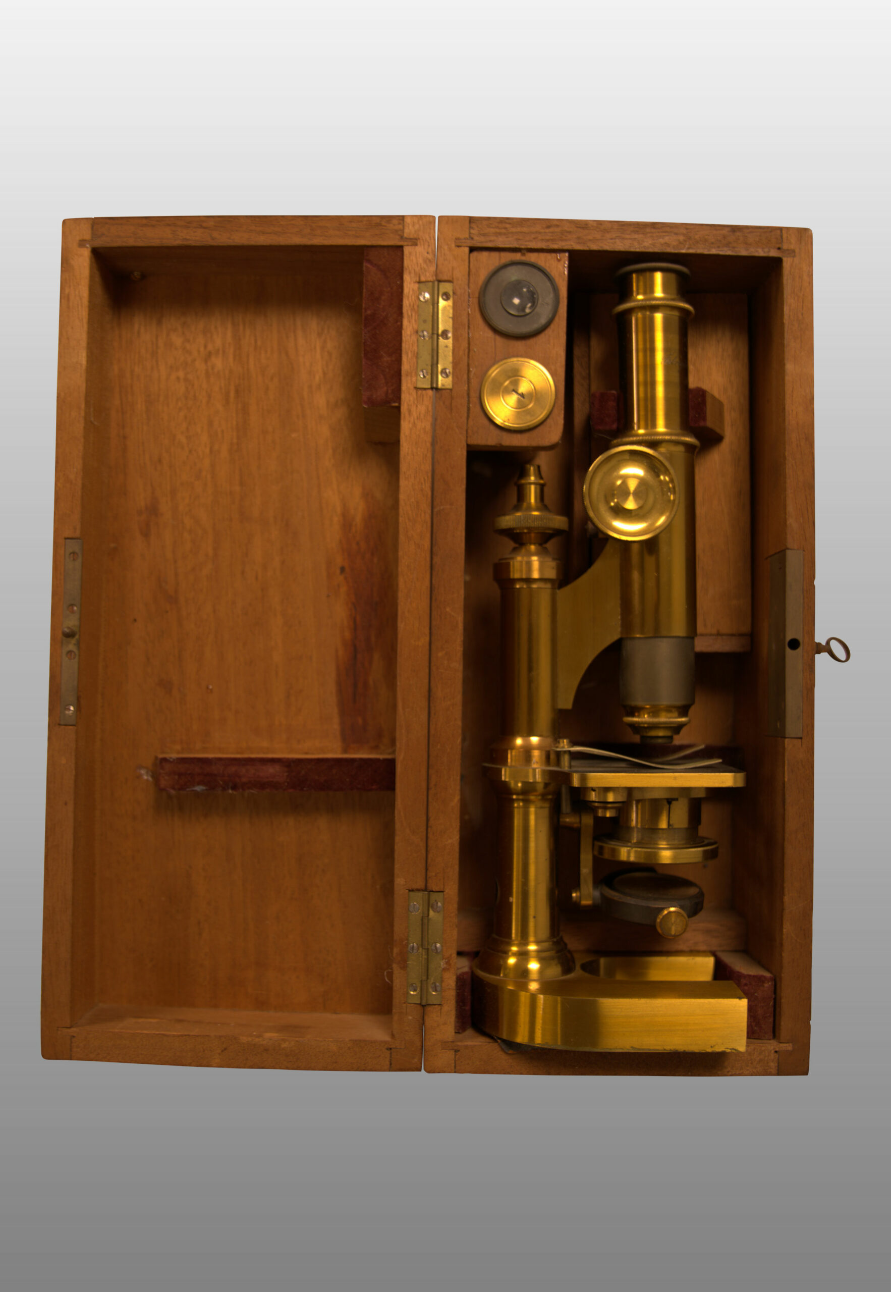 Description 592 : boite en acajou (14x31x12 cm), oculaire 1, 3, Objectif 1, 4, valets, cupule en verre.