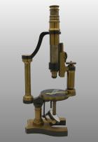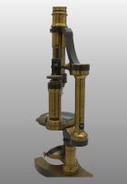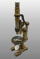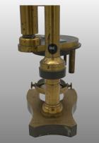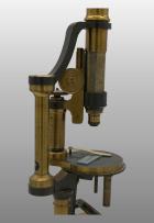 Monté sur une seule colonne, même principe de construction que dans le grand modèle précédent, mais plus simple ; Non inclinant, platine simple à division circulaire et vernier., nicol supérieure ajusté sur l’oculaire, nicol inférieur avec lentille condensatrice simple. 3 Objectifs 3, 5, 7 ; 2 oculaires dont 1 fil croisé. Dans une boite.