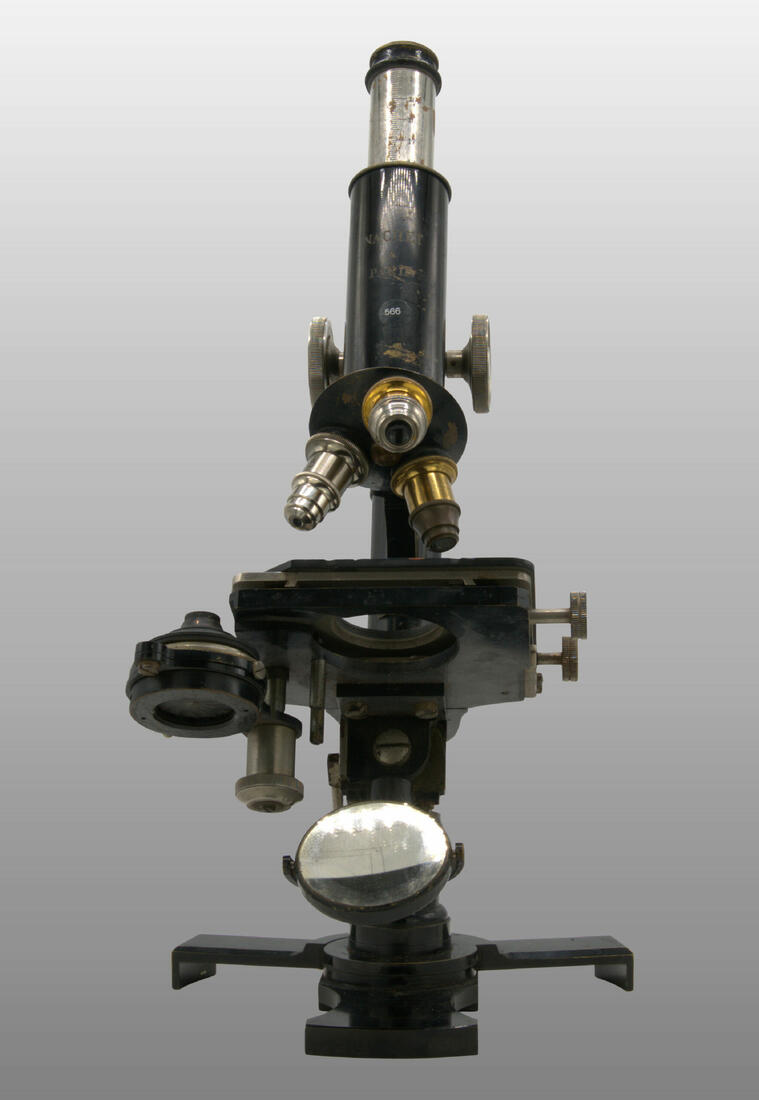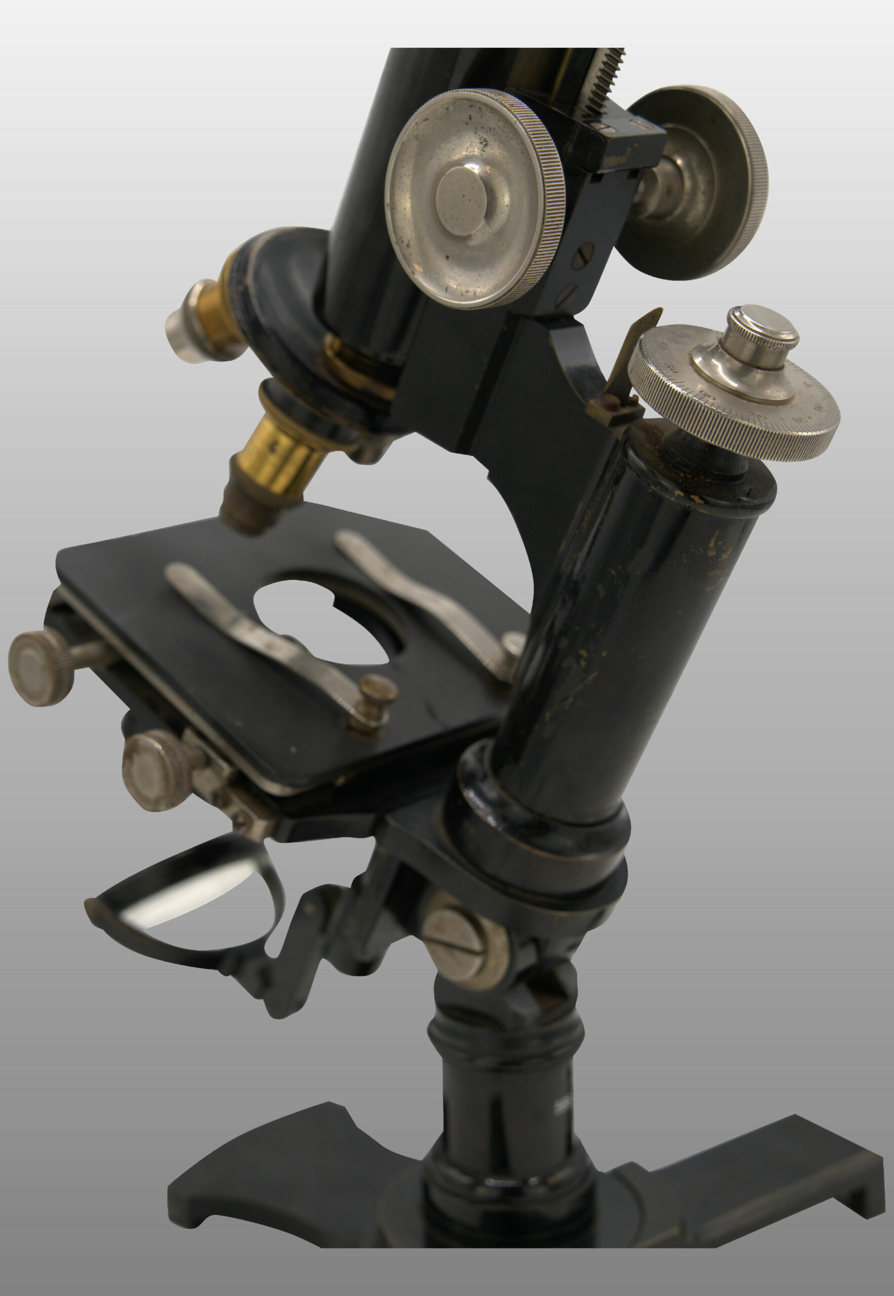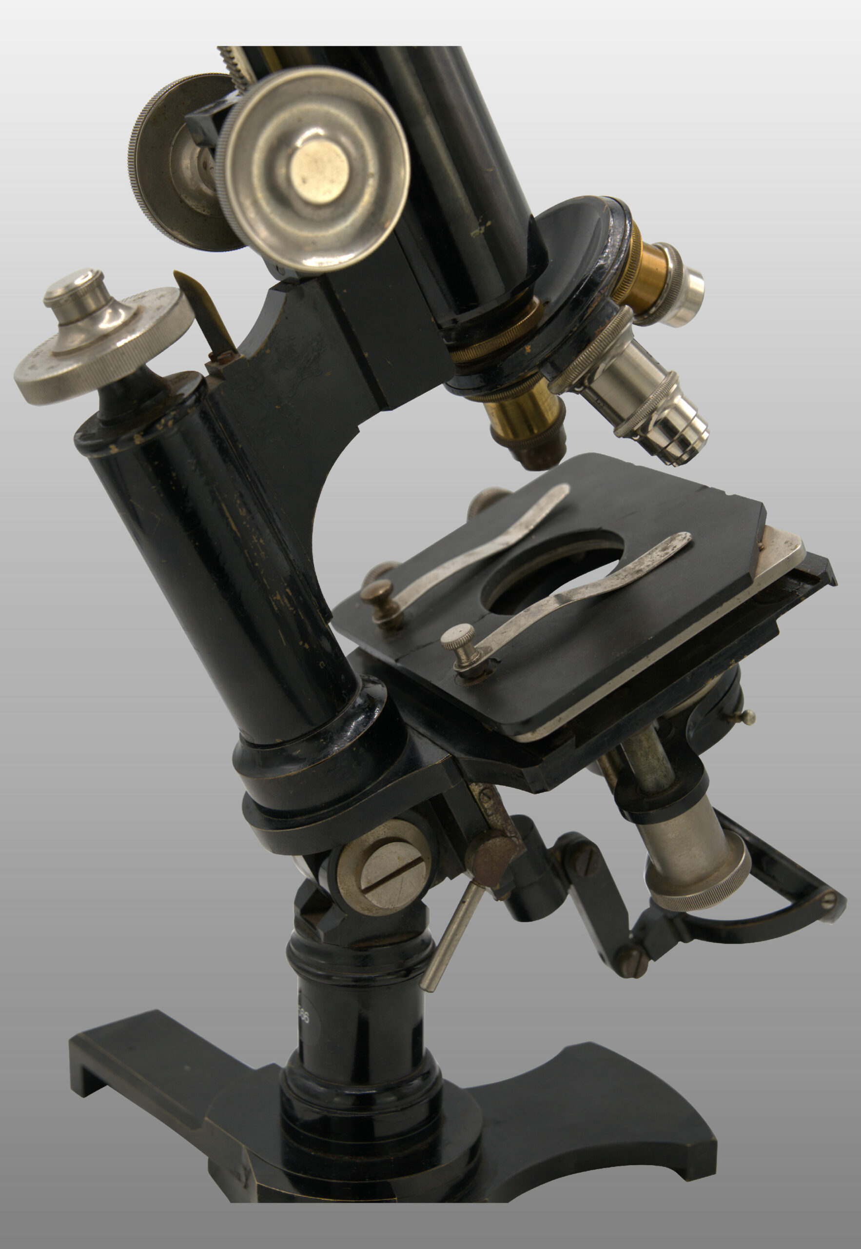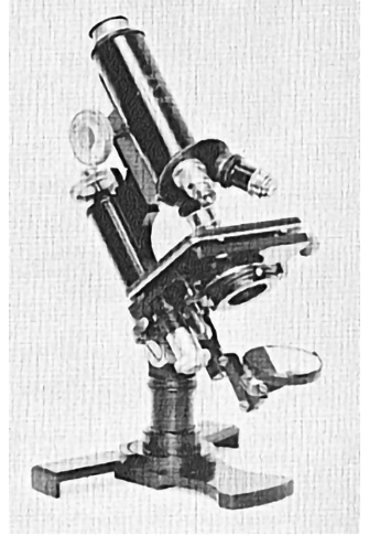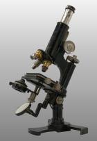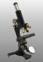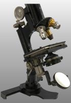 Pied en forme d’hélice. Deux modules peuvent être repliés afin de prendre moins de place. Le statif est monté sur une colonne inclinante. Miroir plan concave orientable. Condenseur escamotable avec lentille et diaphragme à iris.