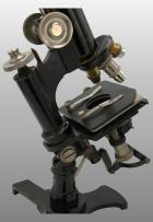 Platine avec mouvement X et Y et recouverte de bakélite. Revolver à 3 objectifs. Mouvement macrométrique avec 2 boutons, une crémaillére. Bouton micrométrique se trouvant au-dessus de la colonne. Objectifs 2, 4, 5. Oculaire 3.