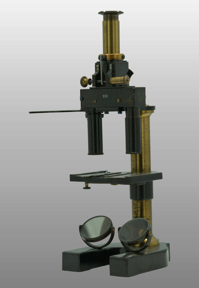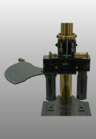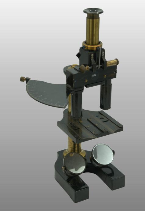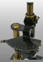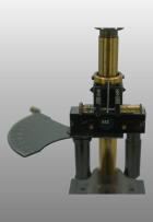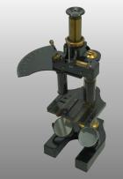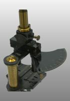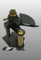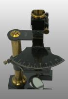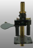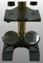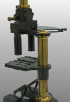 Le pied était fait de trois plaques plates autour d’un axe en forme d’étoile. Comme sur le modèle type Chest, une articulation permettait de basculer l’ensemble du microscope. En bas du tube cylindrique l’objectif est vissé et en haut se trouve l’oculaire La vis de helvelius était abandonnée et le support de platine glissait autour d’une colonne ronde. La mise au point micrométrique se faisait par un bouton en haut de la colonne. L’objectif était fixe et c’est la platine qui montait ou descendait pour effectuer la mise au point par glissement. Le miroir était concave. La platine avait deux valets permettant de fixer la préparation ou tout autres accessoires. Pas de condenseur