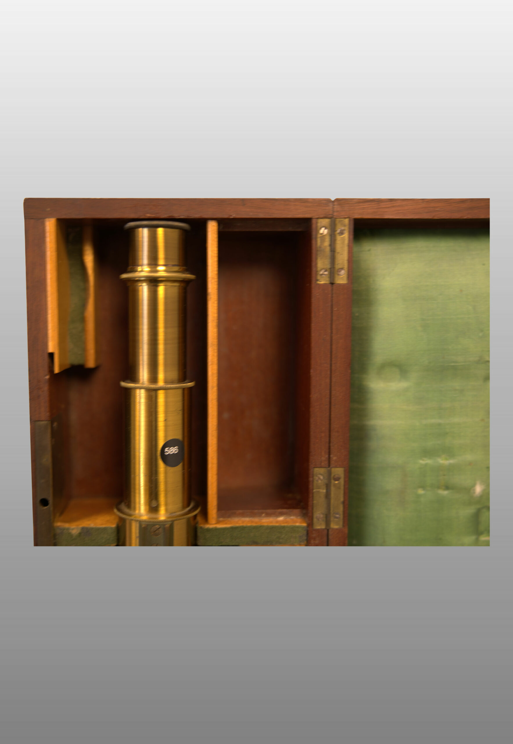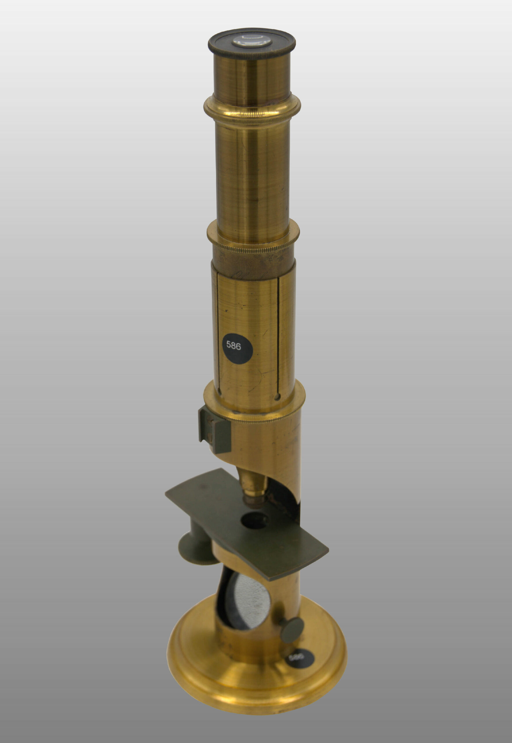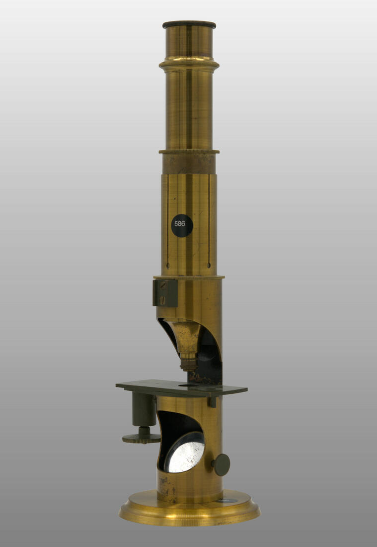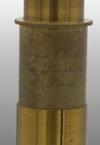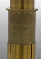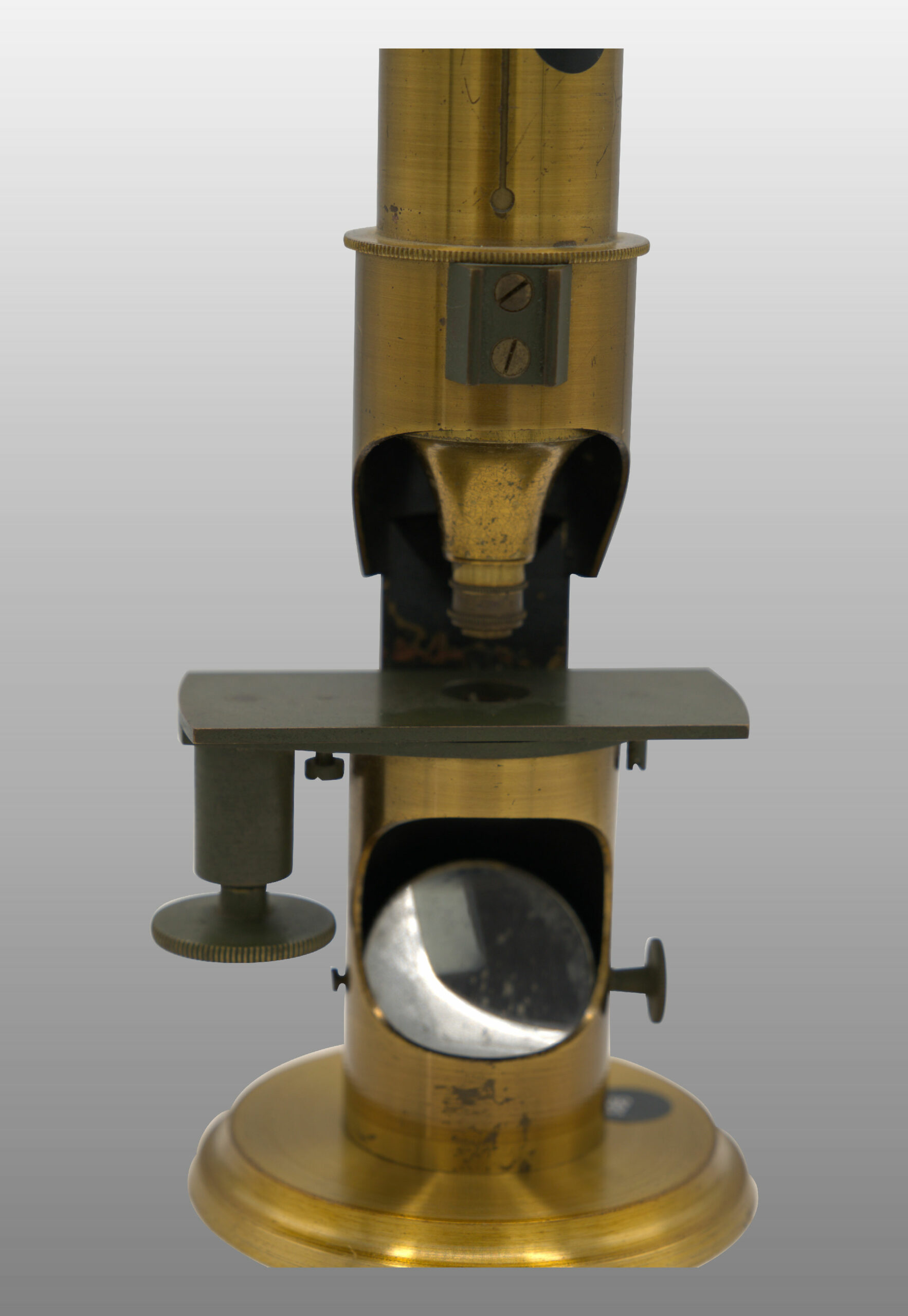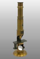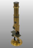 Petit modèle, colonne creuse fixée sur un disque en métal. Large ouverture laissant arriver la lumière un miroir éclaireur fixé à l’intérieur de cette sorte de niche. L’éclairage latéral avec cette configuration est impossible. Tube à frottement, une lentille achromatique, un oculaire, miroir concave.