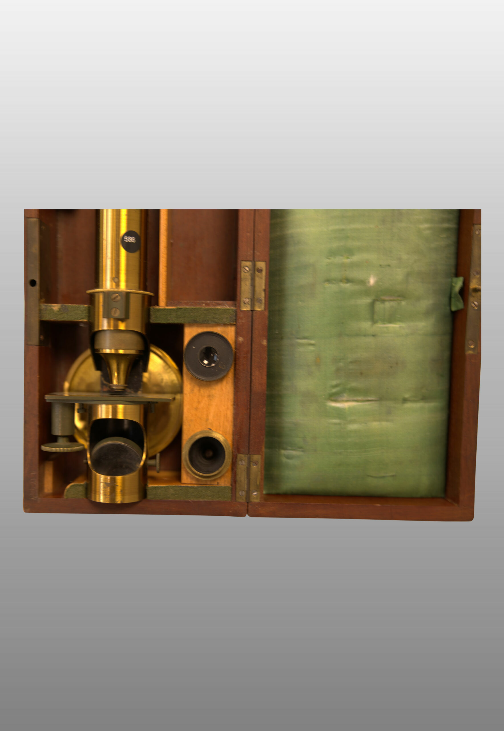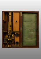 Description 586 :        boite en acajou à crochet (13x26x7 cm), oculaire 2,3. Objectifs 4,7; n° sur la boite. Très joli manuscrit indiquant le fonctionnement du microscopeManque loupe éclairage corps opaques.