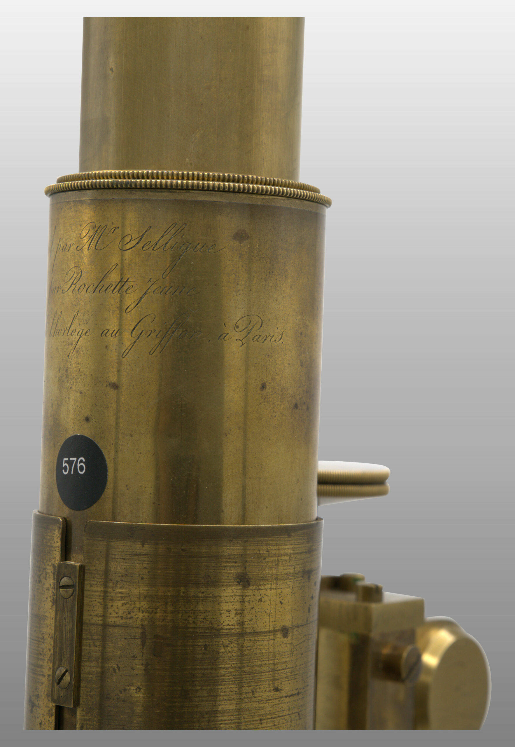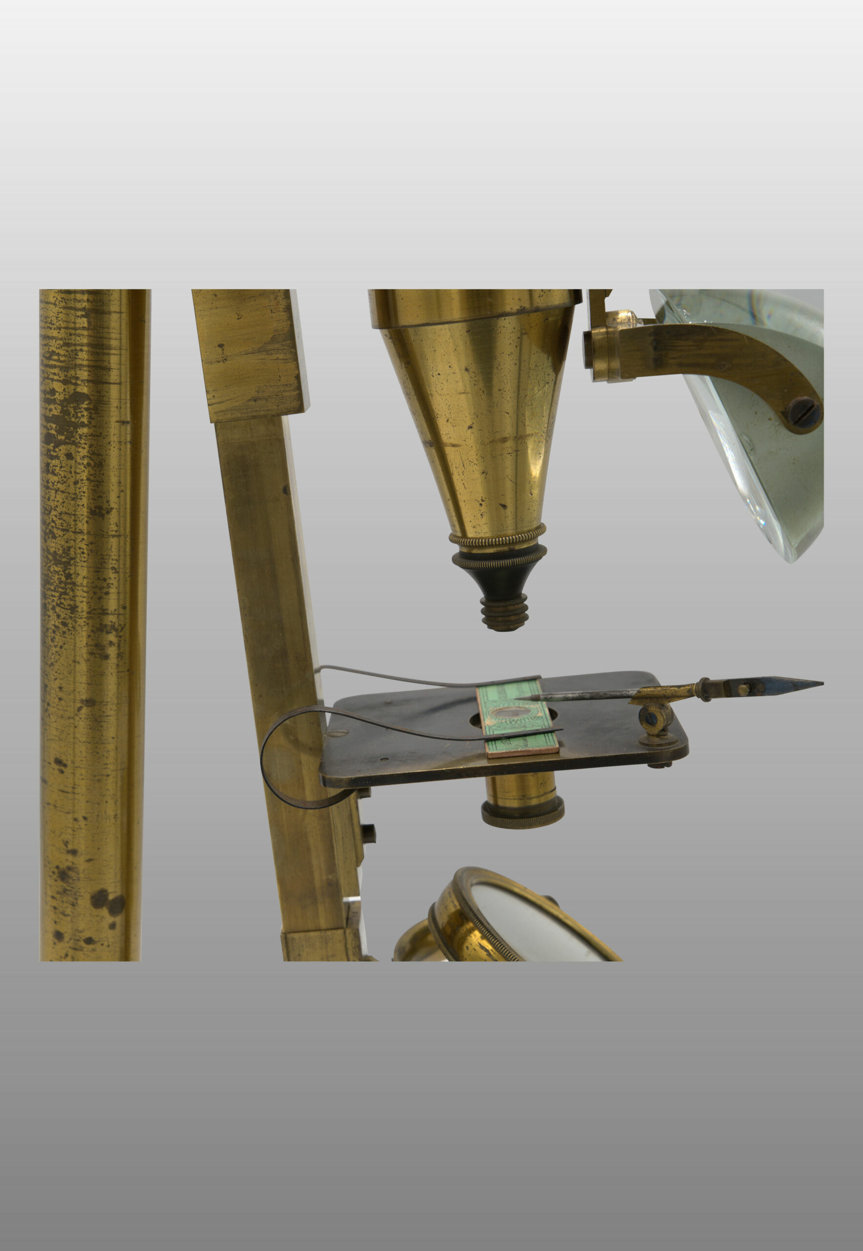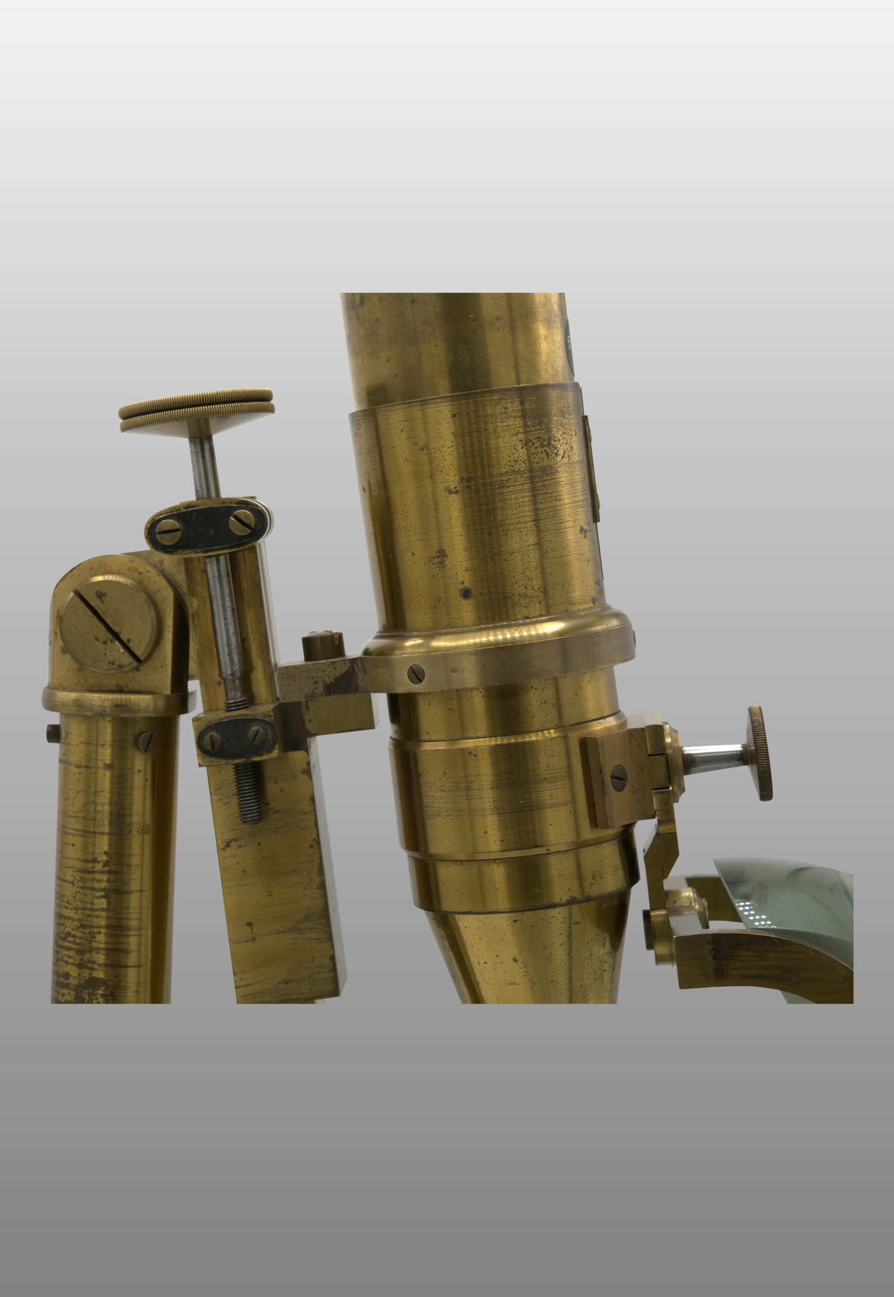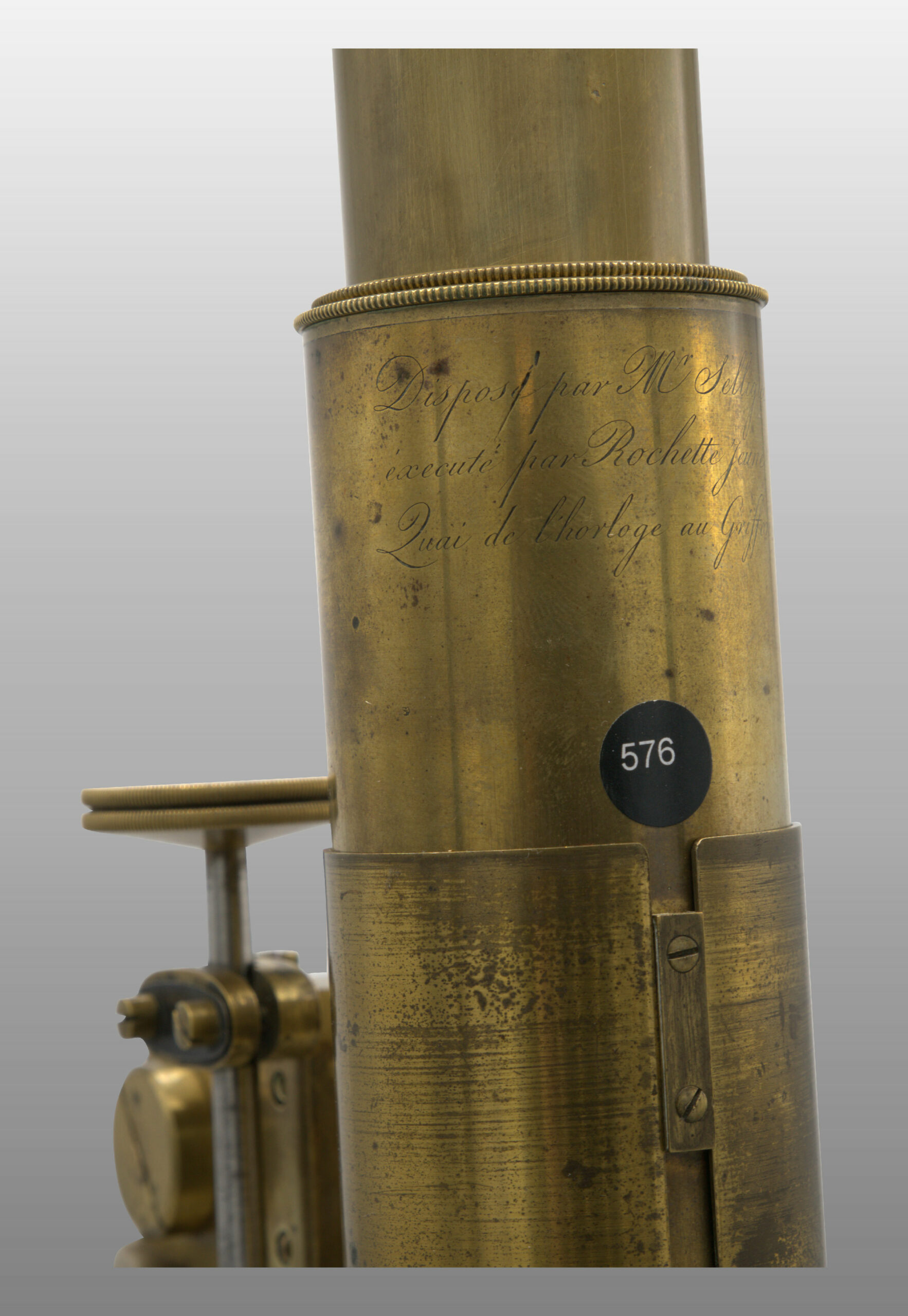 Corps cylindrique à deux tirages portant l’oculaire composé de deux lentilles plan-convexes, l’objectif formé de quatre lentilles plan-convexes vissées ensemble et numérotées 0, 1, 2, 3; l’ensemble est monté par un bras sur un support rectangulaire également porteur du porte-objectif ajustable par une vis de Helvelius située en haut, et d’un miroir réflecteur, et attaché à une colonne cylindrique à double pied pliant. Un prisme d’illumination est attaché au corps de l’instrument par un collier ajustable.