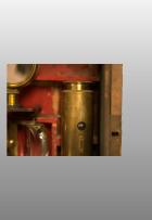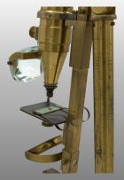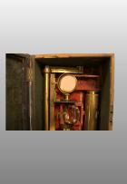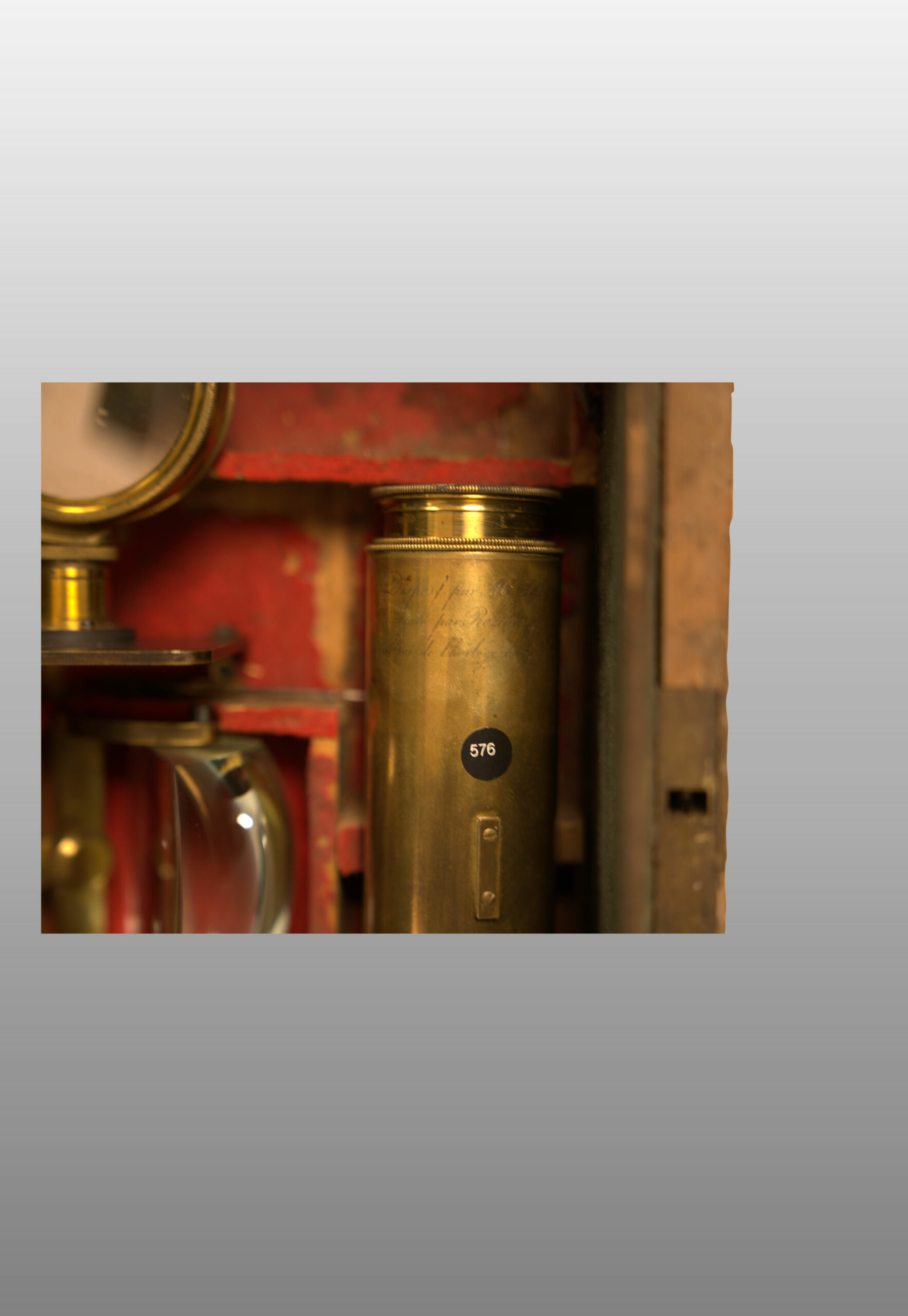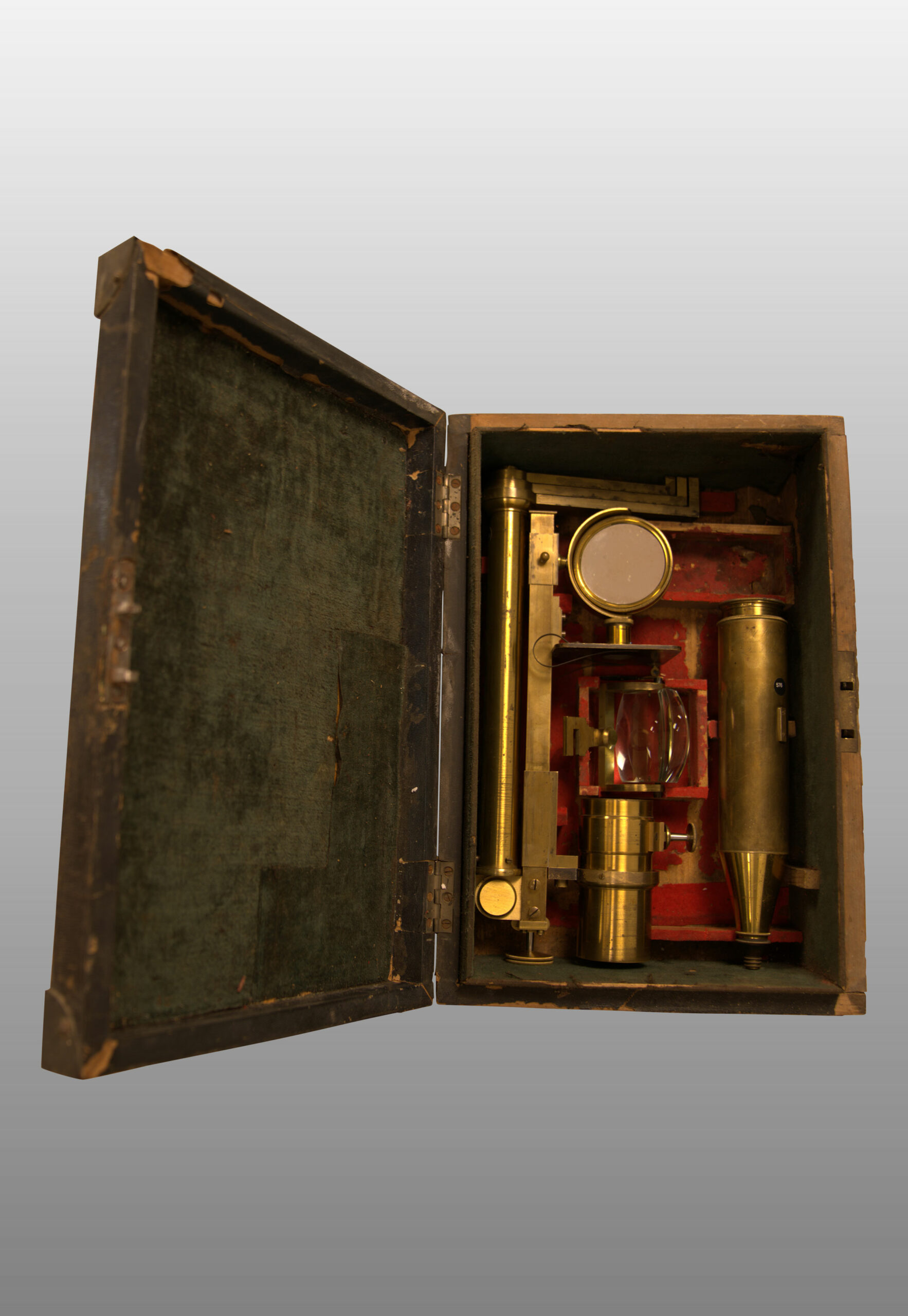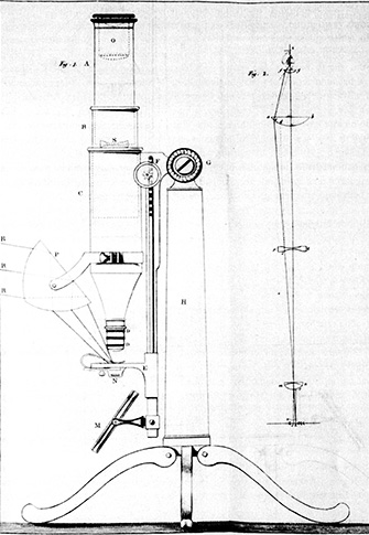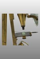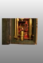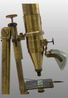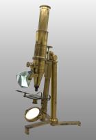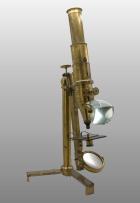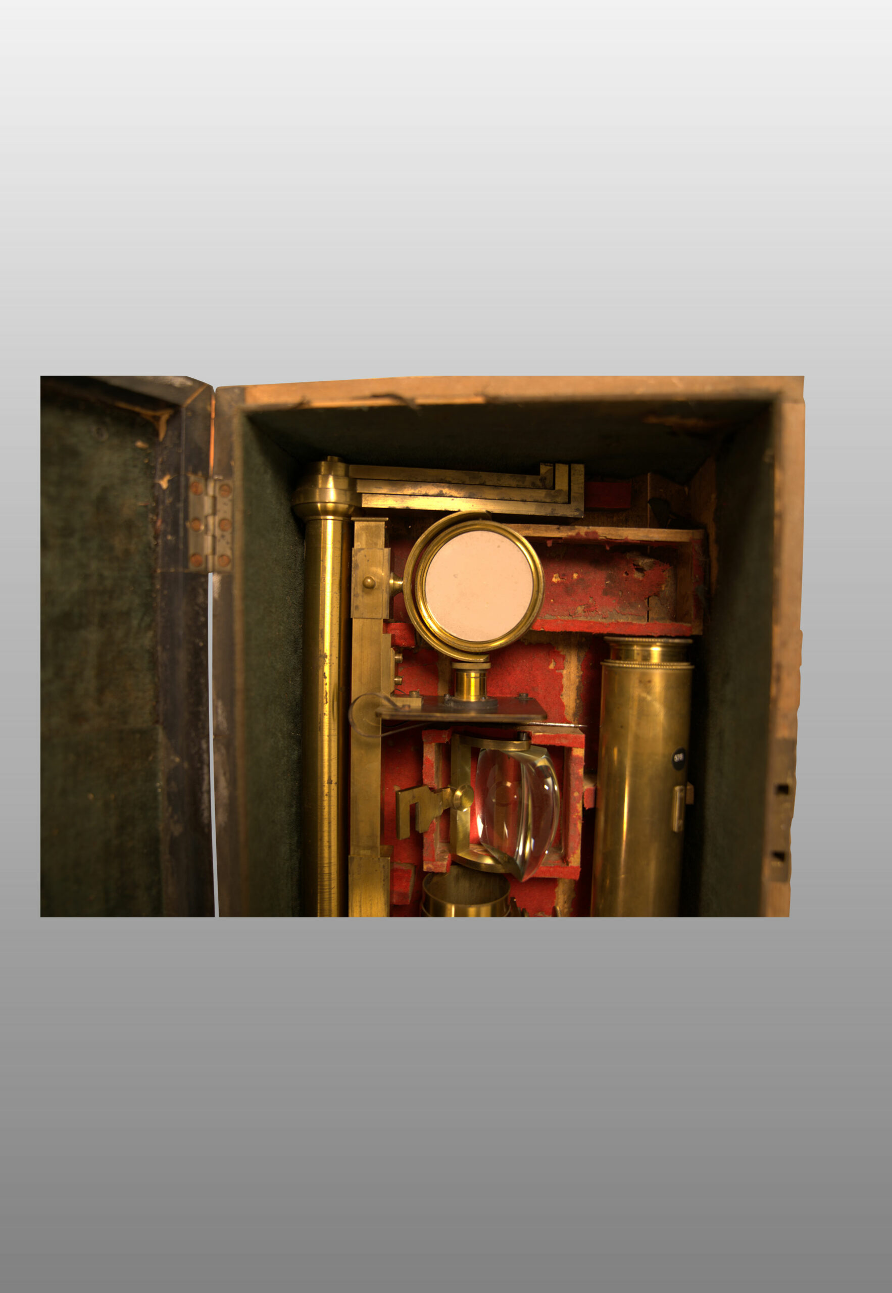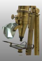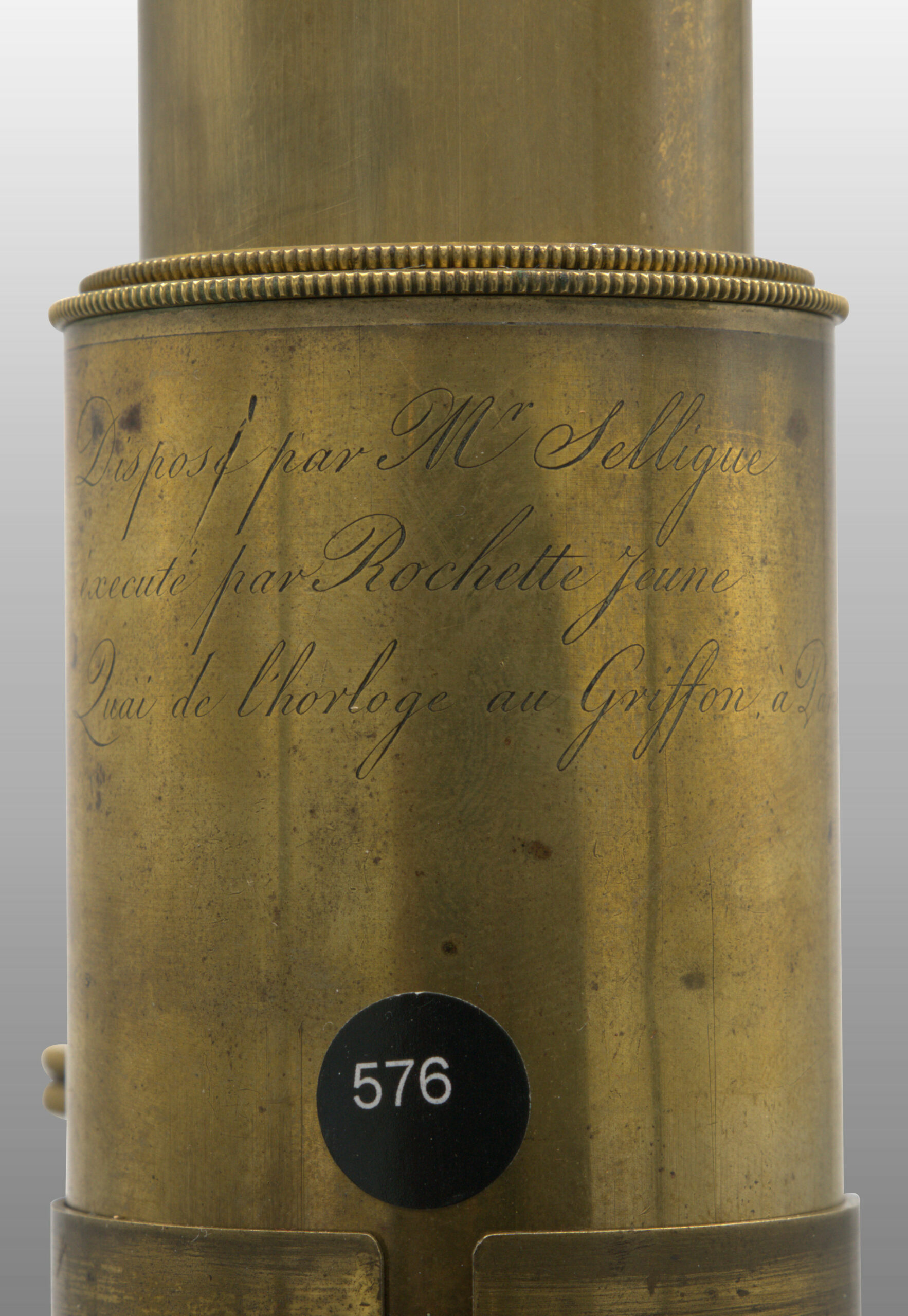 Corps cylindrique à deux tirages portant l’oculaire composé de deux lentilles plan-convexes, l’objectif formé de quatre lentilles plan-convexes vissées ensemble et numérotées 0, 1, 2, 3; l’ensemble est monté par un bras sur un support rectangulaire également porteur du porte-objectif ajustable par une vis de Helvelius située en haut, et d’un miroir réflecteur, et attaché à une colonne cylindrique à double pied pliant. Un prisme d’illumination est attaché au corps de l’instrument par un collier ajustable.