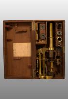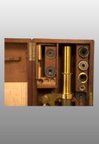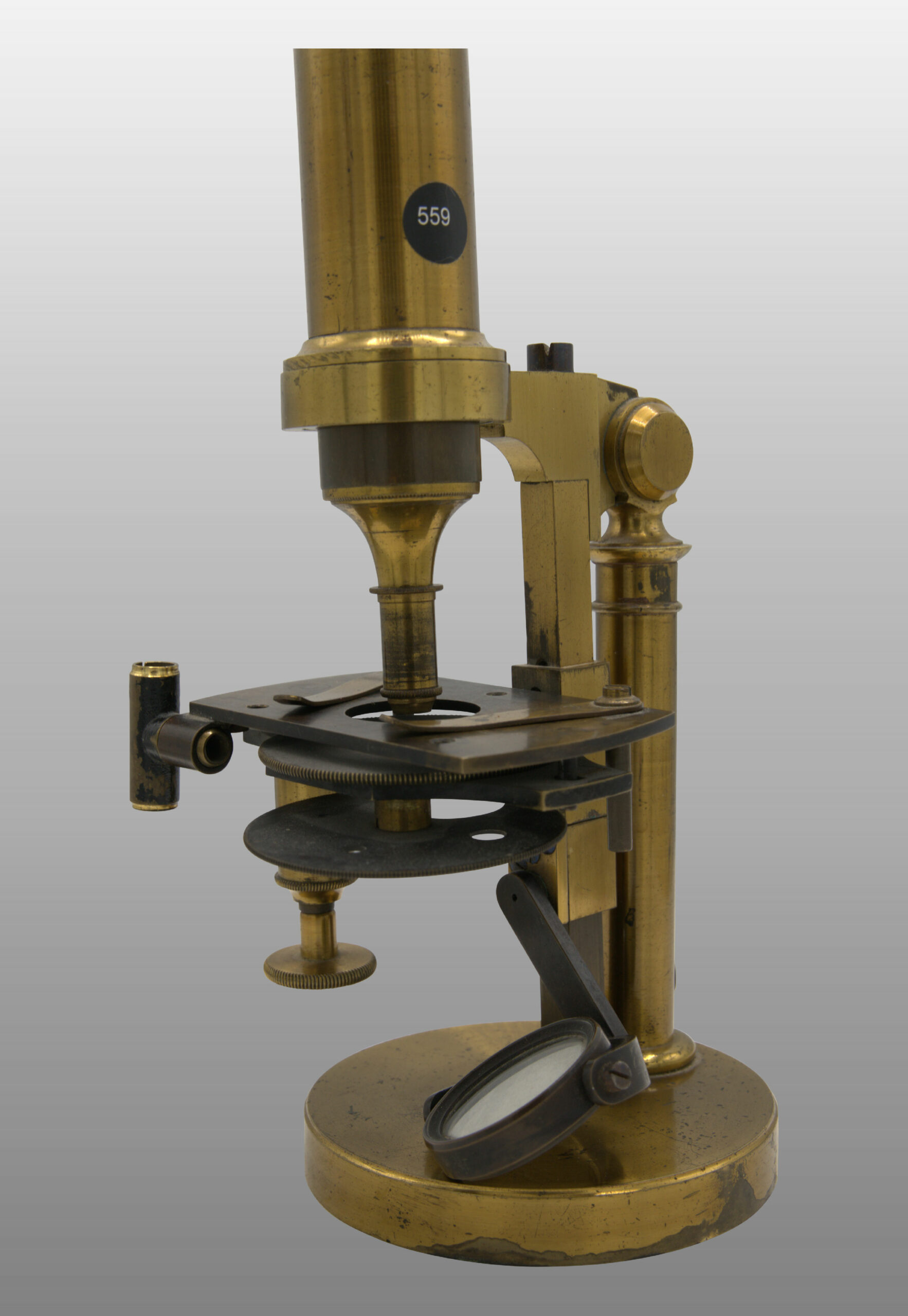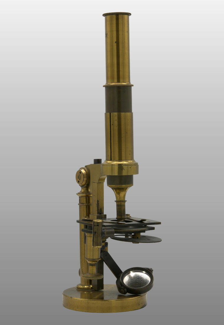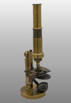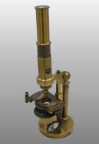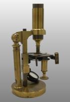 Le corps du microscope est monté sur un pied rond. Comme sur le modèle type Chest, une articulation permettait de basculer l’ensemble du microscope. La vis de helvelius était abandonnée et le support de platine glissait autour d’une colonne carrée. L’objectif était fixe et c’est la platine qui montait ou descendait pour effectuer la mise au point. La mise au point fine s’effectue en tournant un bouton sous la platine et le plateau supérieur se déplace.