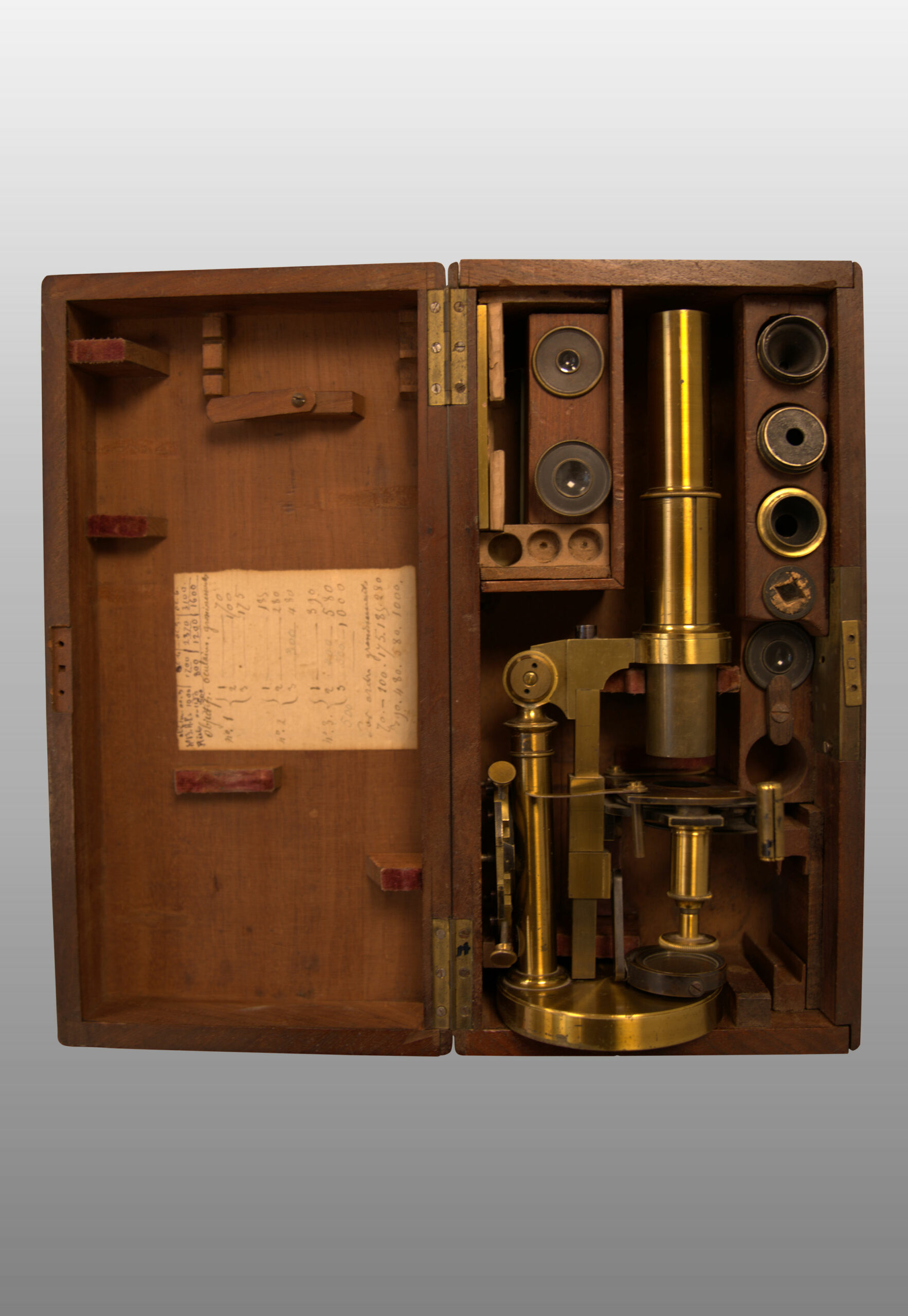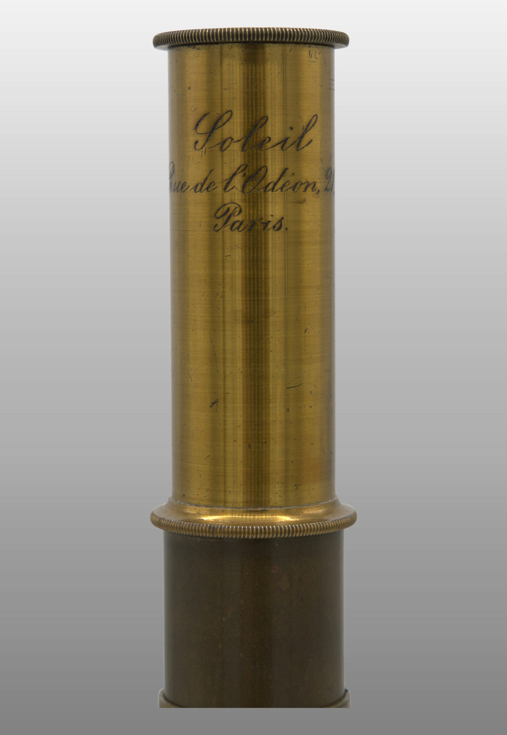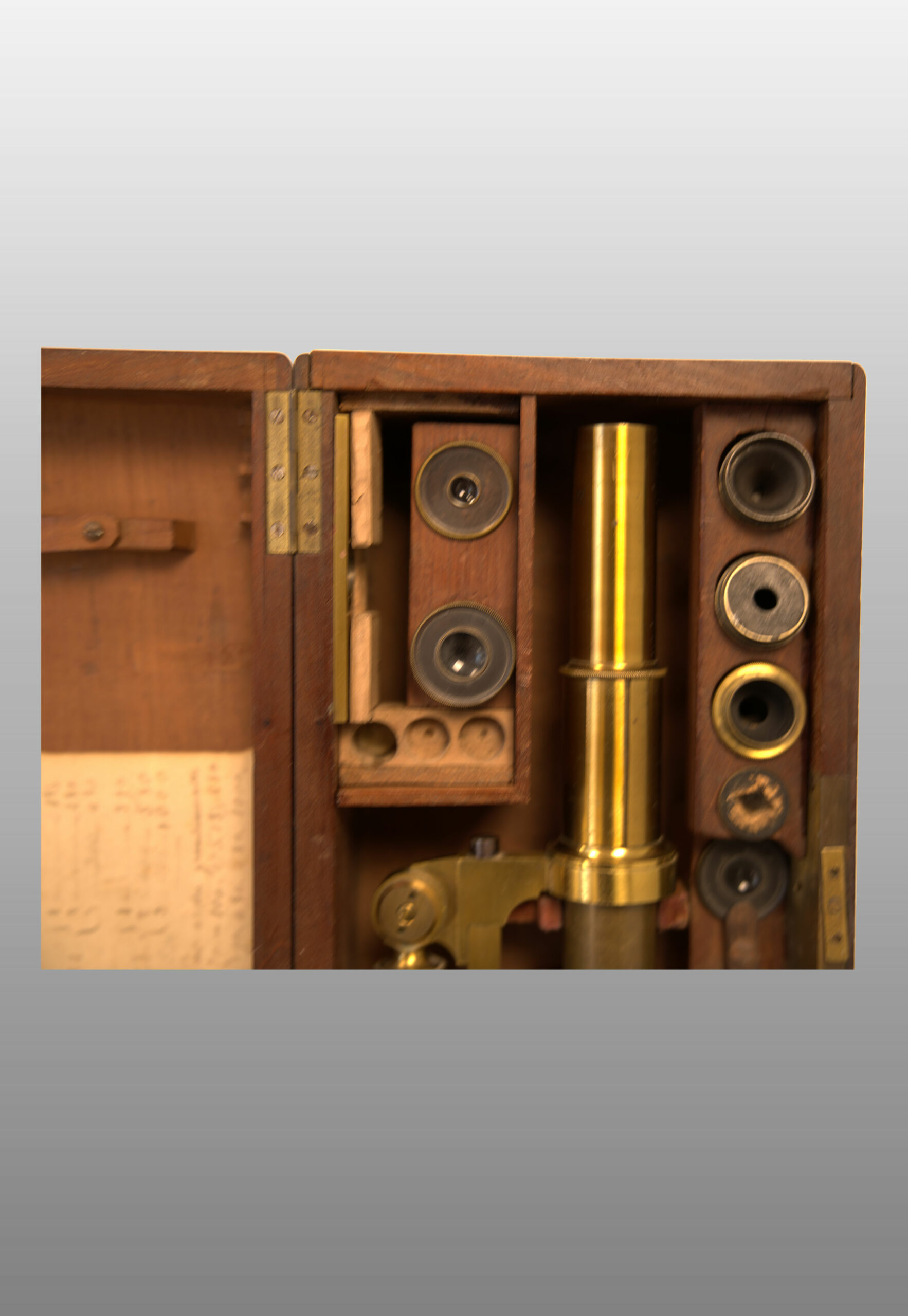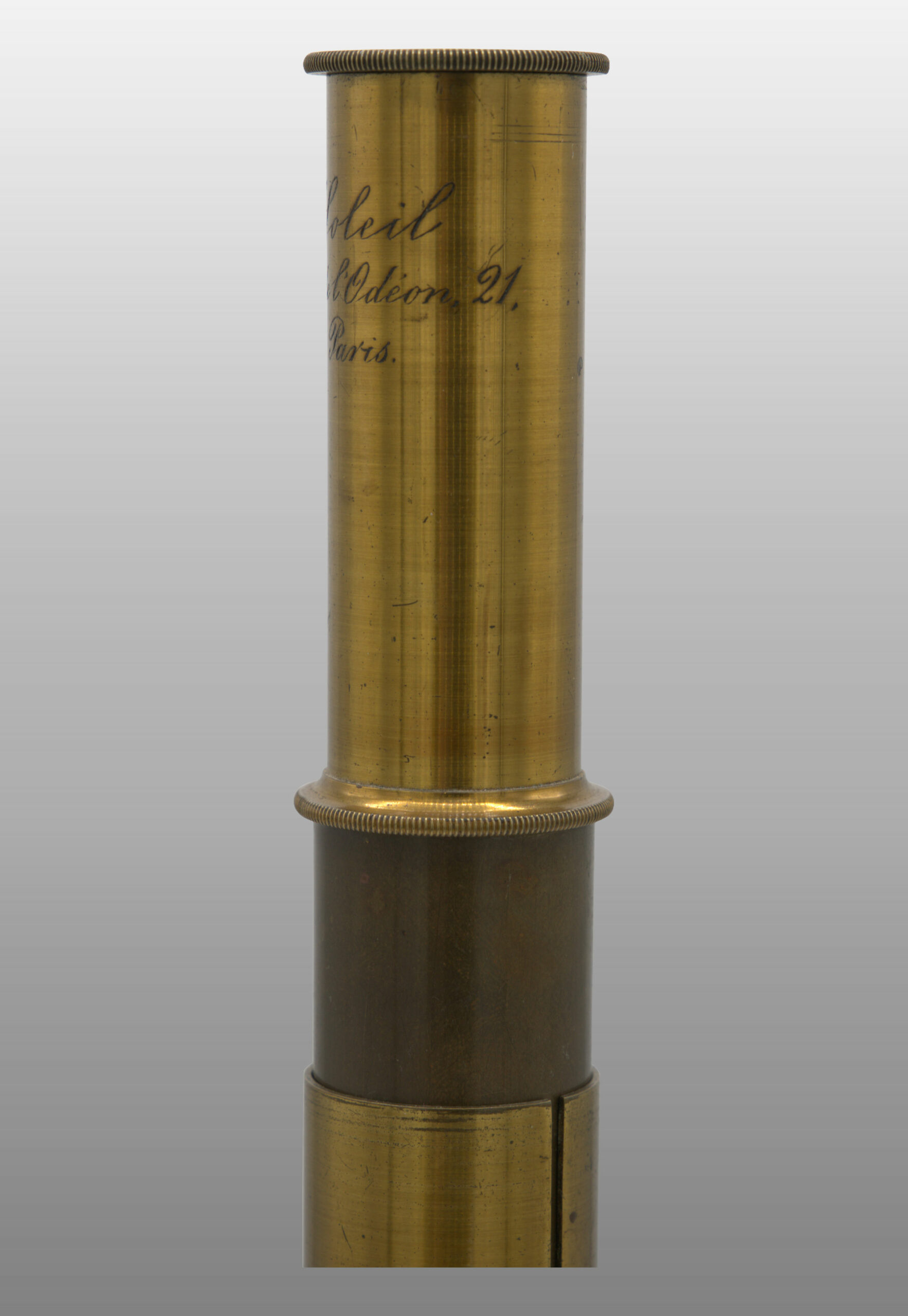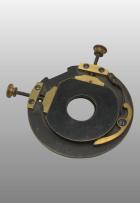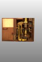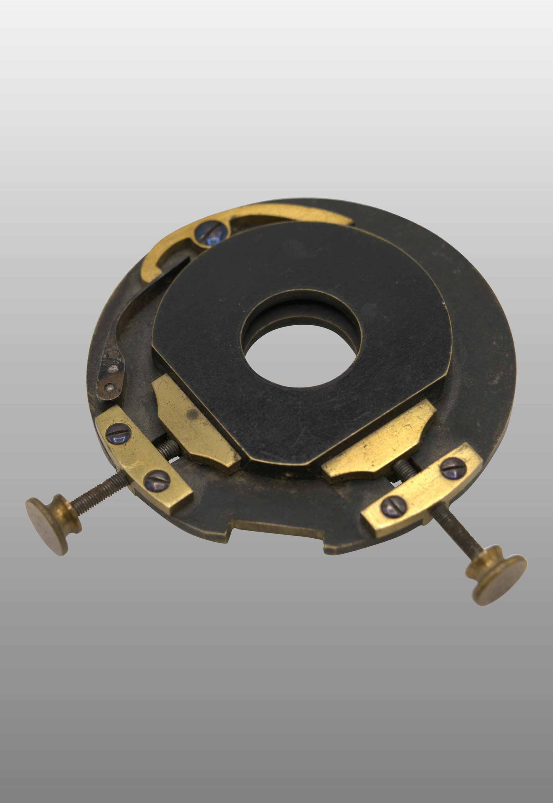 Le miroir était double plan et concave. La platine est rectangulaire avec 5 trous plus le trou central. 3 de ces trous permettent de caler une surplatine qui ressemble à celle de Chevalier. Sous la platine se trouve un disque qui tourne à 360° autour de l’axe optique. On peut y insérer un prisme pour la polarisation. Sous ce disque, il y a un autre disque avec 4 trous servant de diaphragmes.