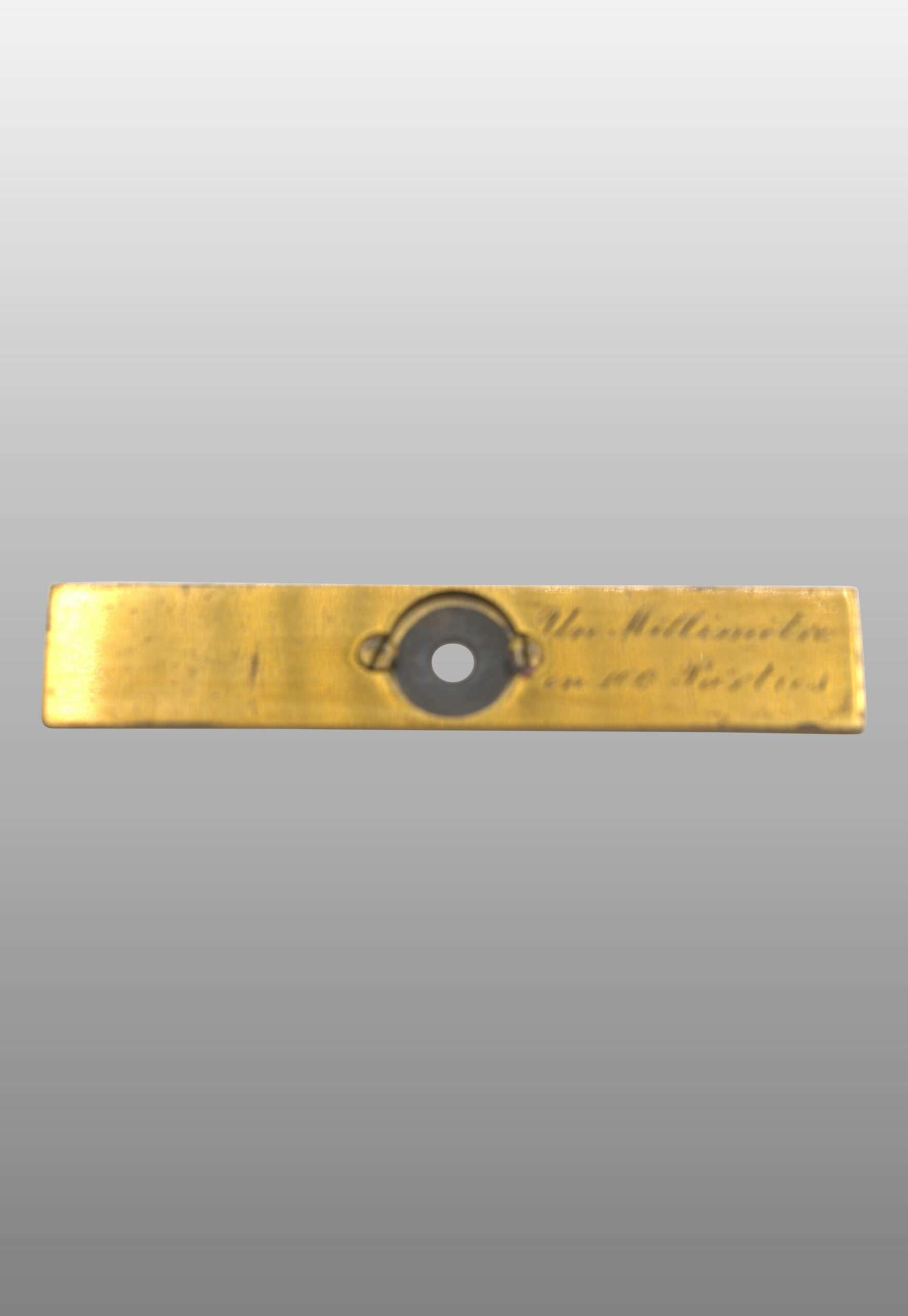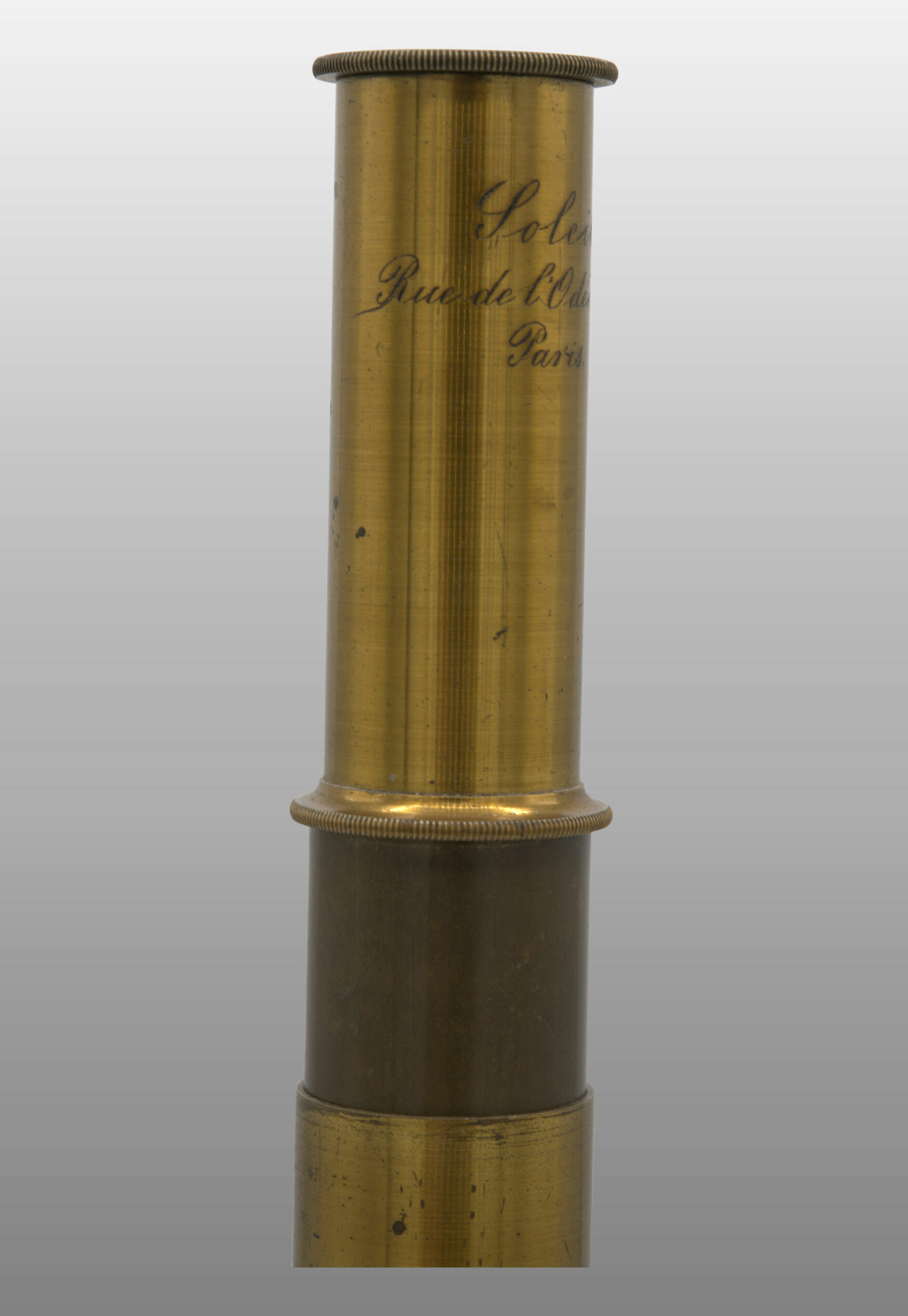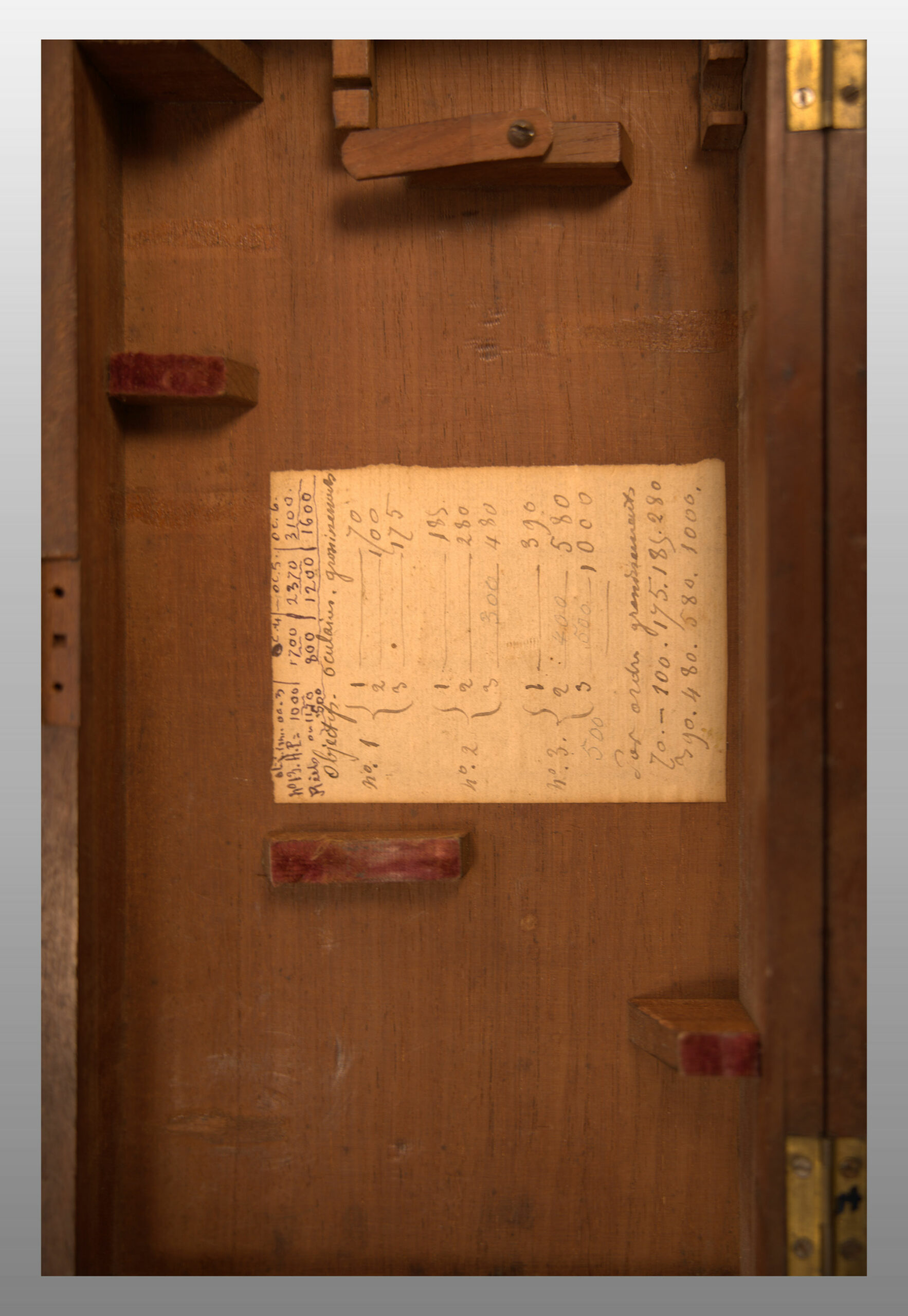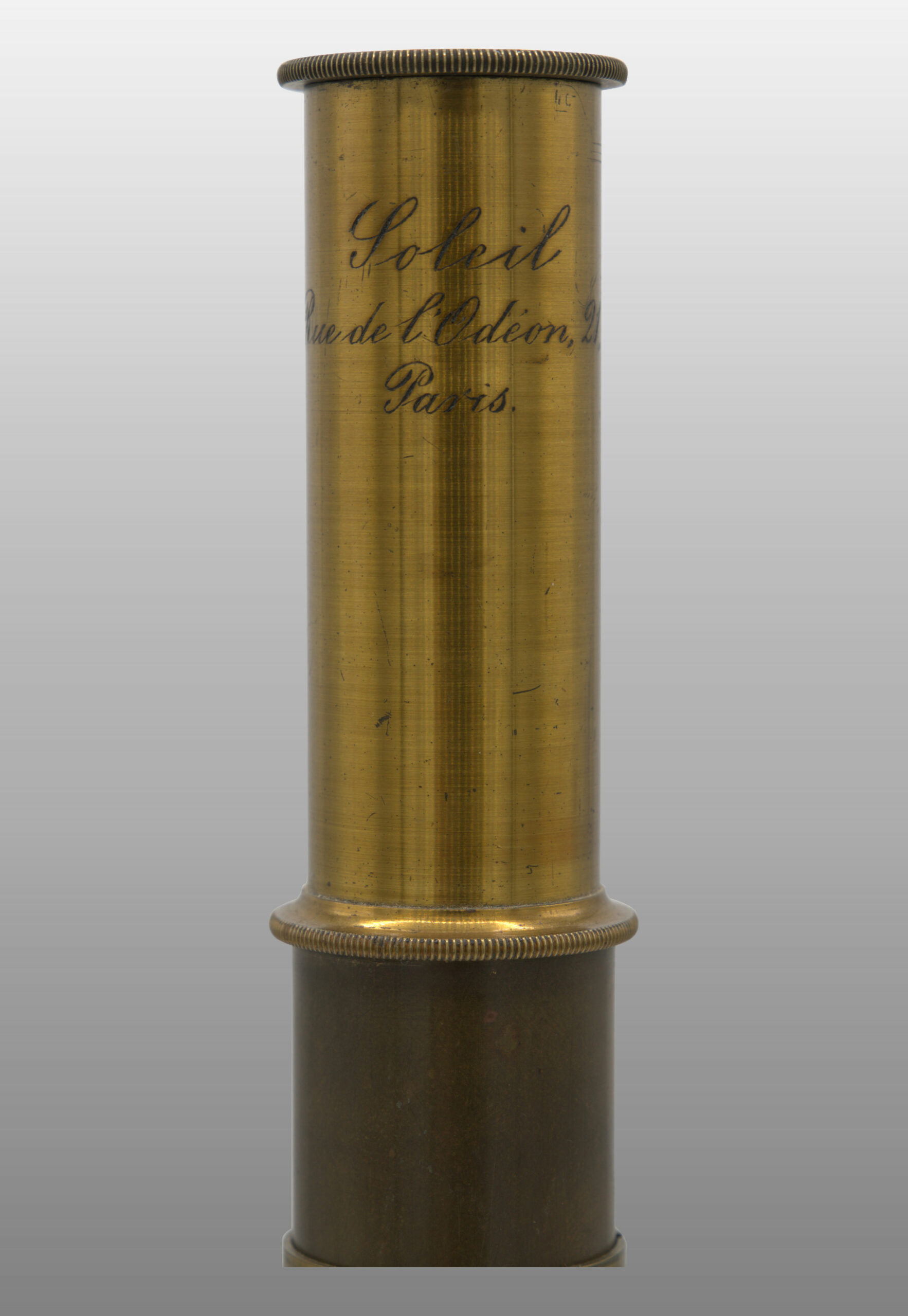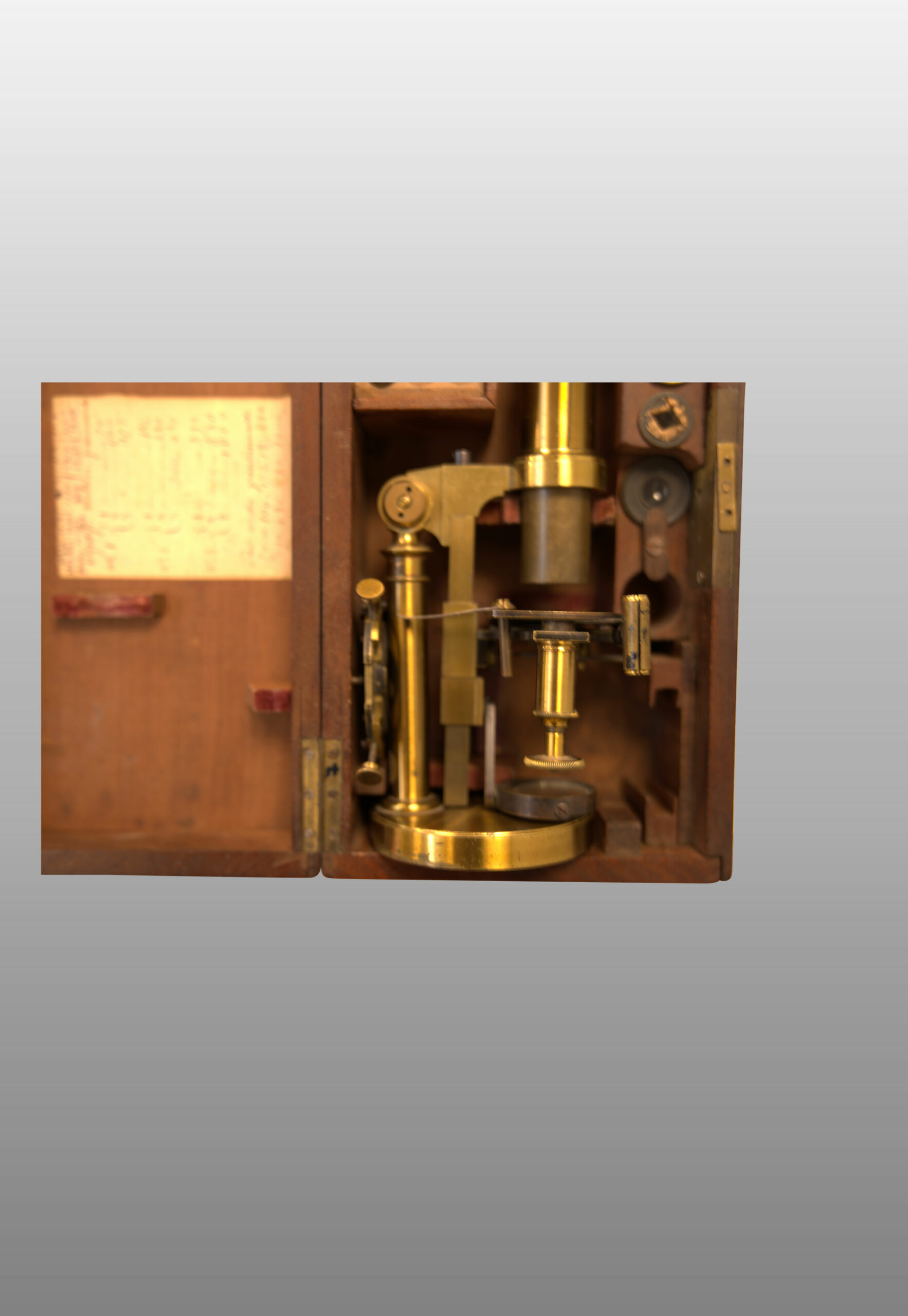 Le miroir était double plan et concave. La platine est rectangulaire avec 5 trous plus le trou central. 3 de ces trous permettent de caler une surplatine qui ressemble à celle de Chevalier. Sous la platine se trouve un disque qui tourne à 360° autour de l’axe optique. On peut y insérer un prisme pour la polarisation. Sous ce disque, il y a un autre disque avec 4 trous servant de diaphragmes.