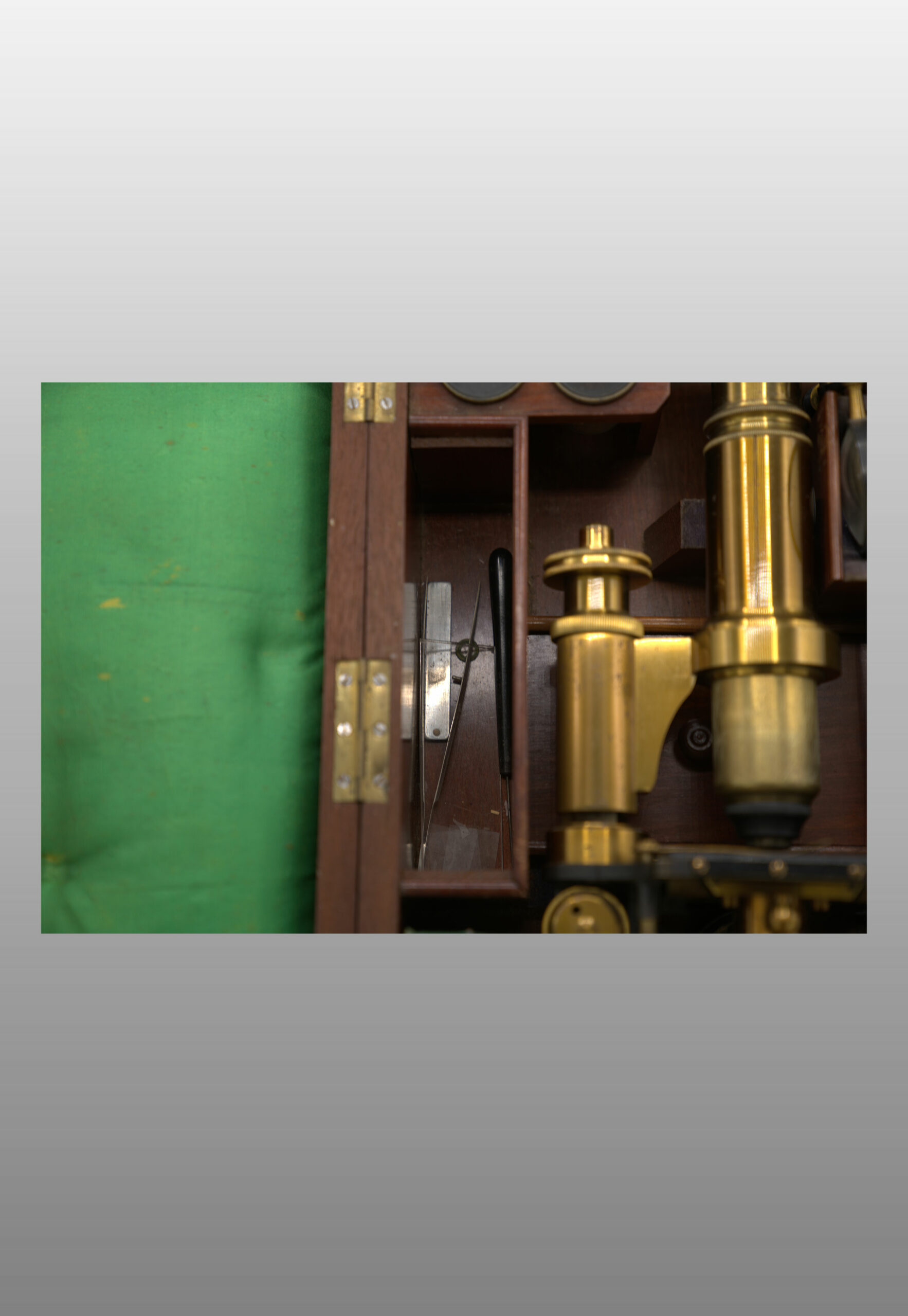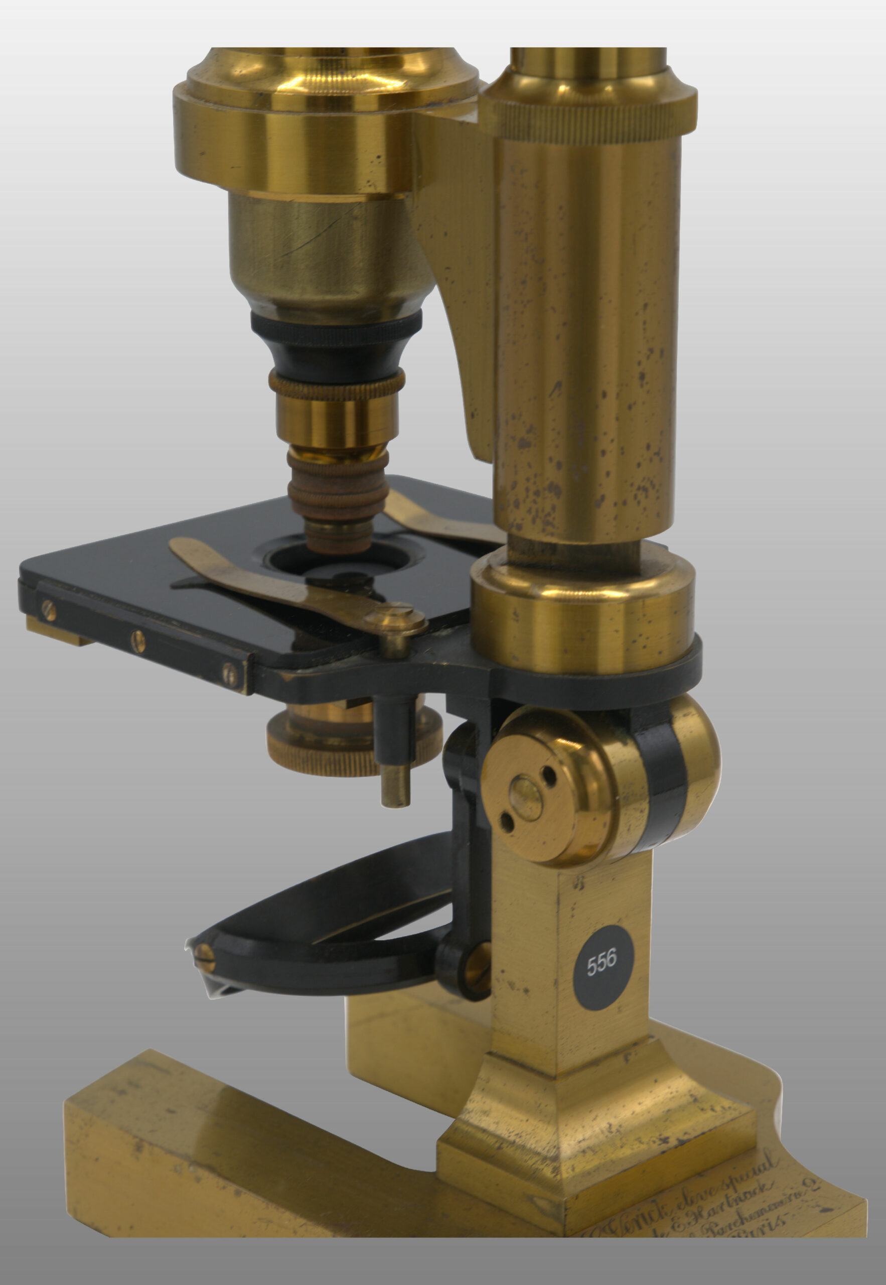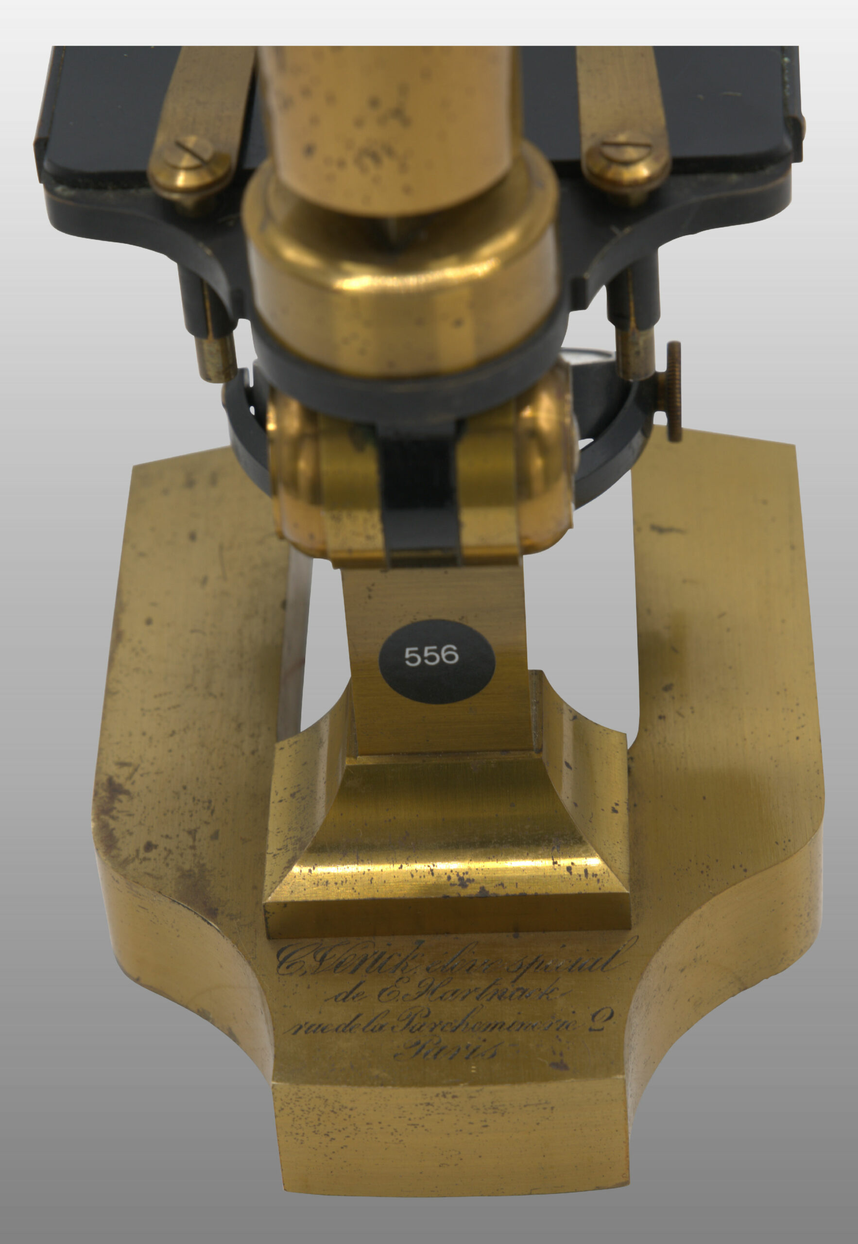 Platine munie d’une glace noire pour les acides. Mouvement rapide par tirage du coulant, mouvement lent par la vis micrométrique. Miroir donnant la lumière oblique. Il est composé de 3 objectifs n° 2, 6, 7, et de deux oculaires n°1 et 3. Grossissement maximum 780 x. Renversement à charnières. Loupe petit modèle pour corps opaques.
