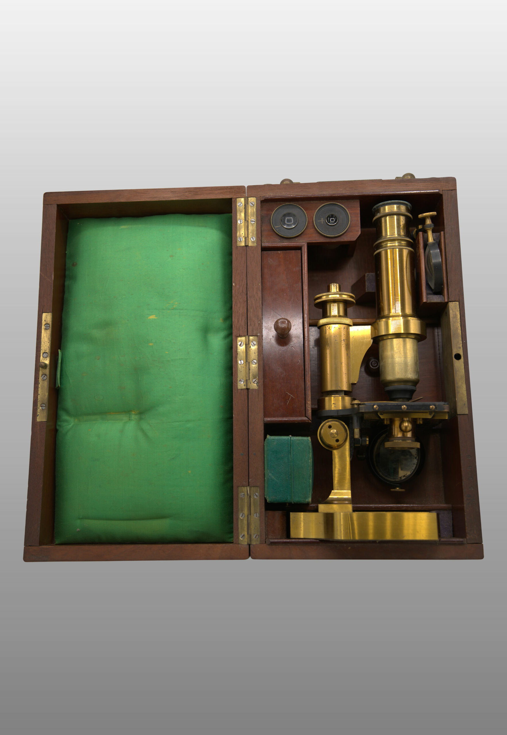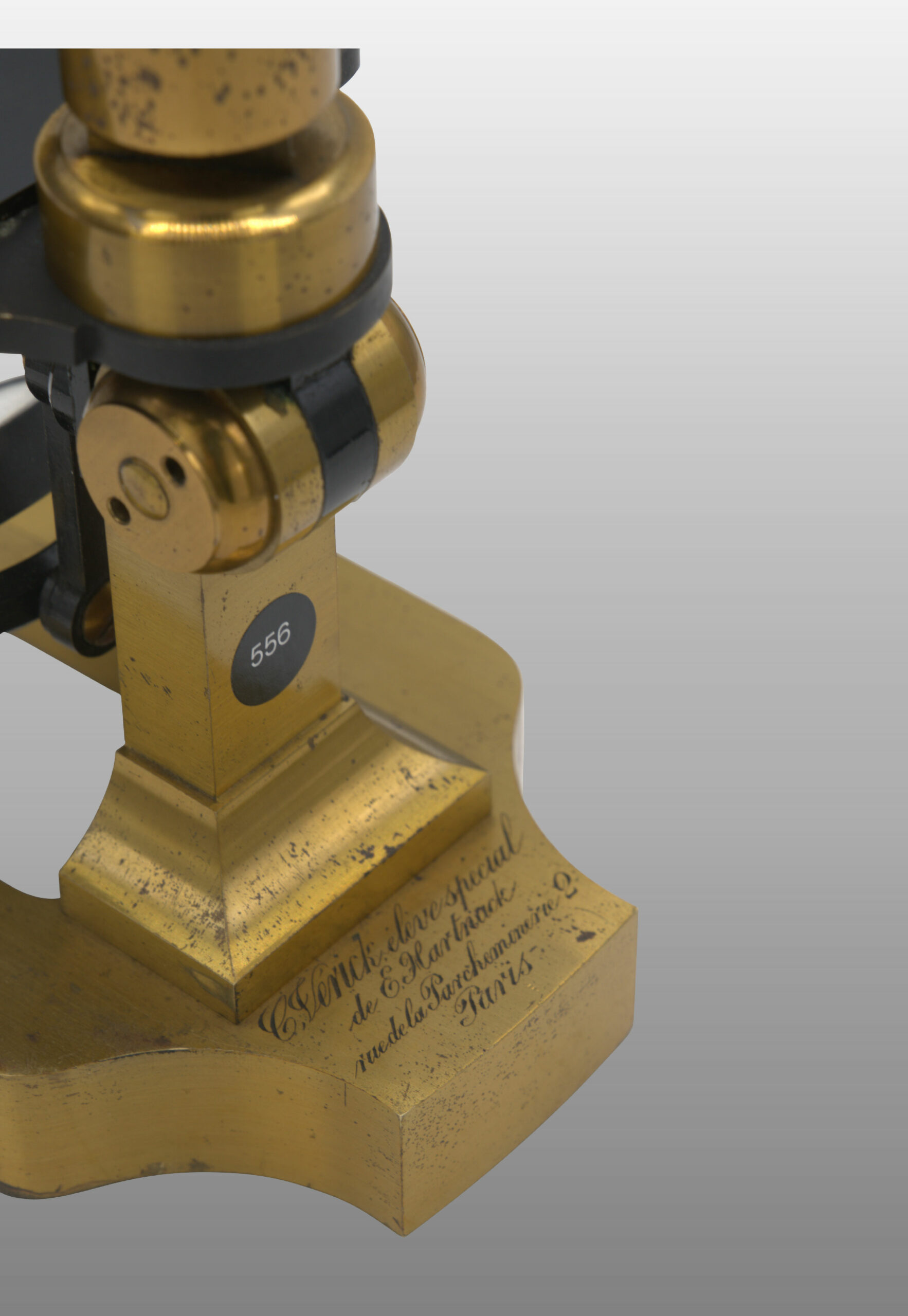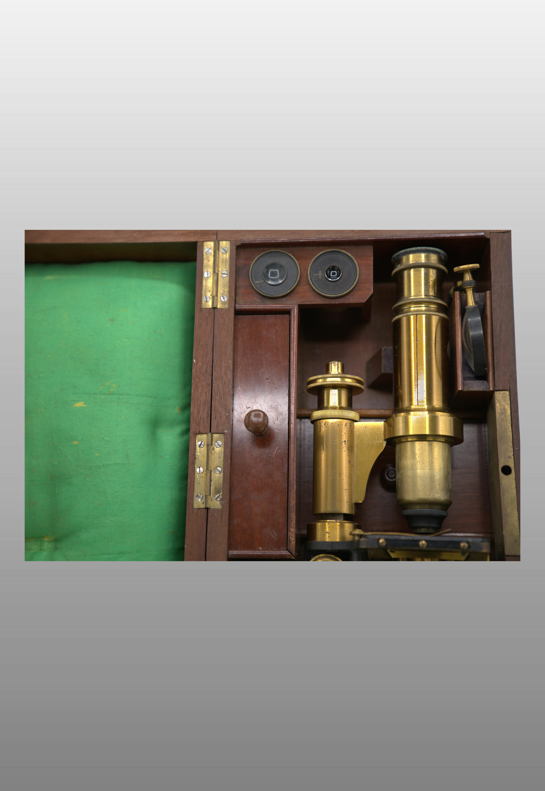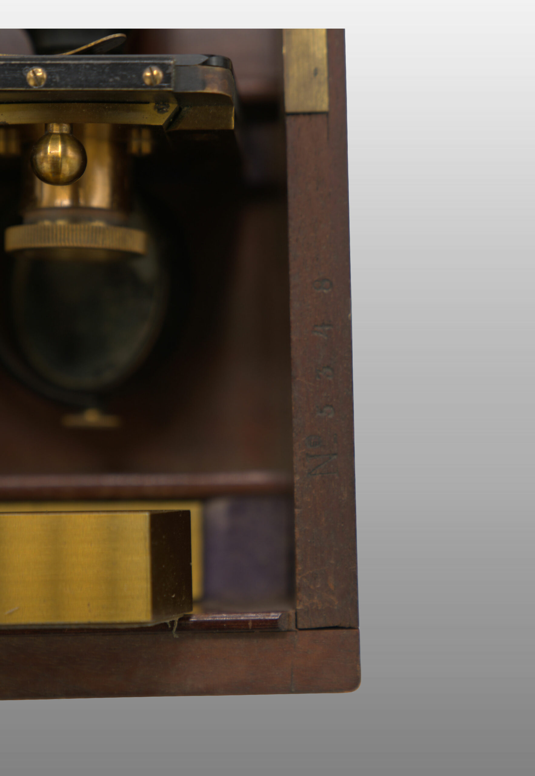 Platine munie d’une glace noire pour les acides. Mouvement rapide par tirage du coulant, mouvement lent par la vis micrométrique. Miroir donnant la lumière oblique. Il est composé de 3 objectifs n° 2, 6, 7, et de deux oculaires n°1 et 3. Grossissement maximum 780 x. Renversement à charnières. Loupe petit modèle pour corps opaques.