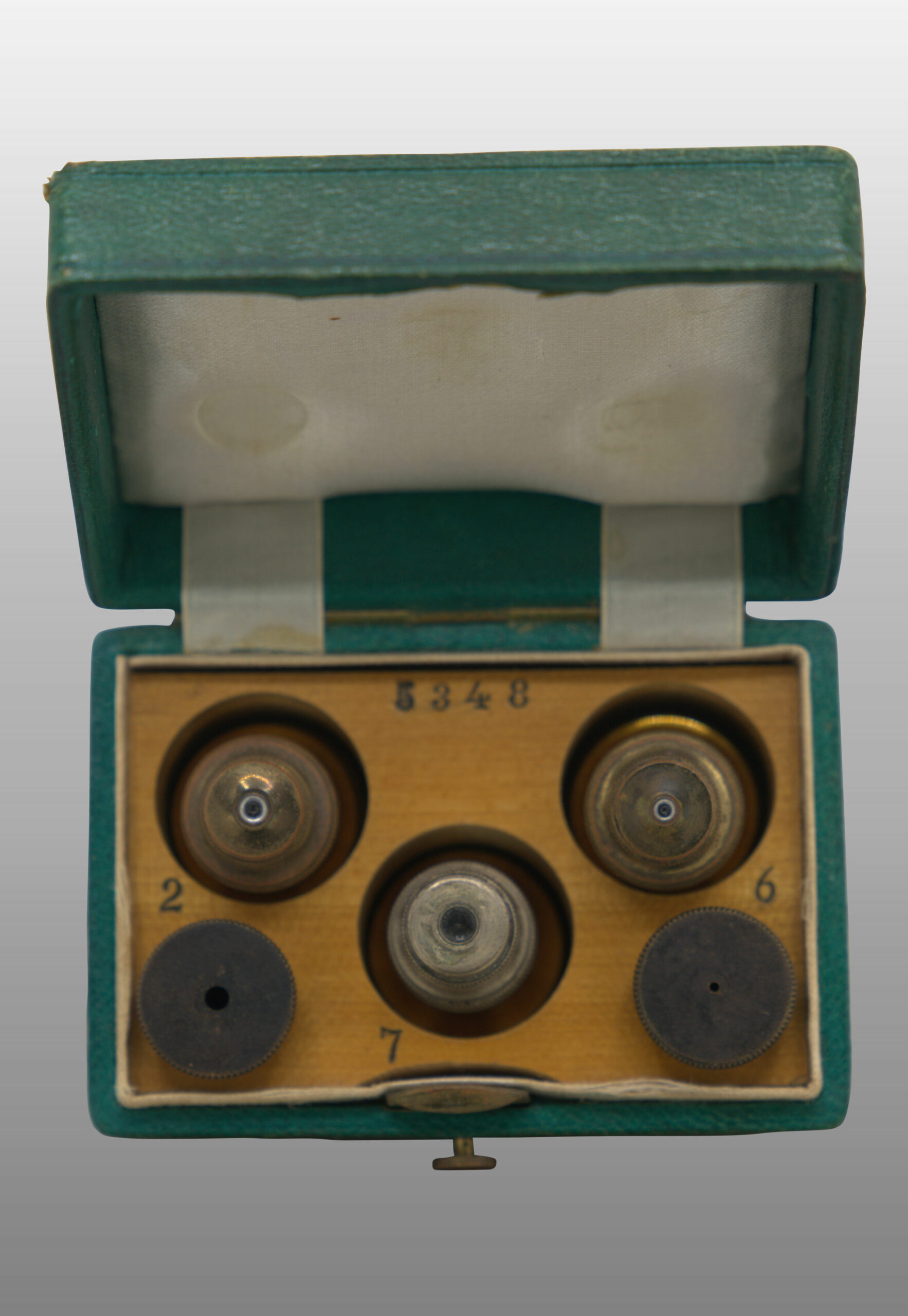 Description 556 : boite (16x29x11) numérotée. Oculaire 1/2/4. Objectifs n° 2,6,7, loupe corps opaques. Boite objectifs et diaphragmes condenseur numérotée. Condenseur. 2 valets. Piques, pincette.