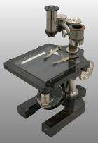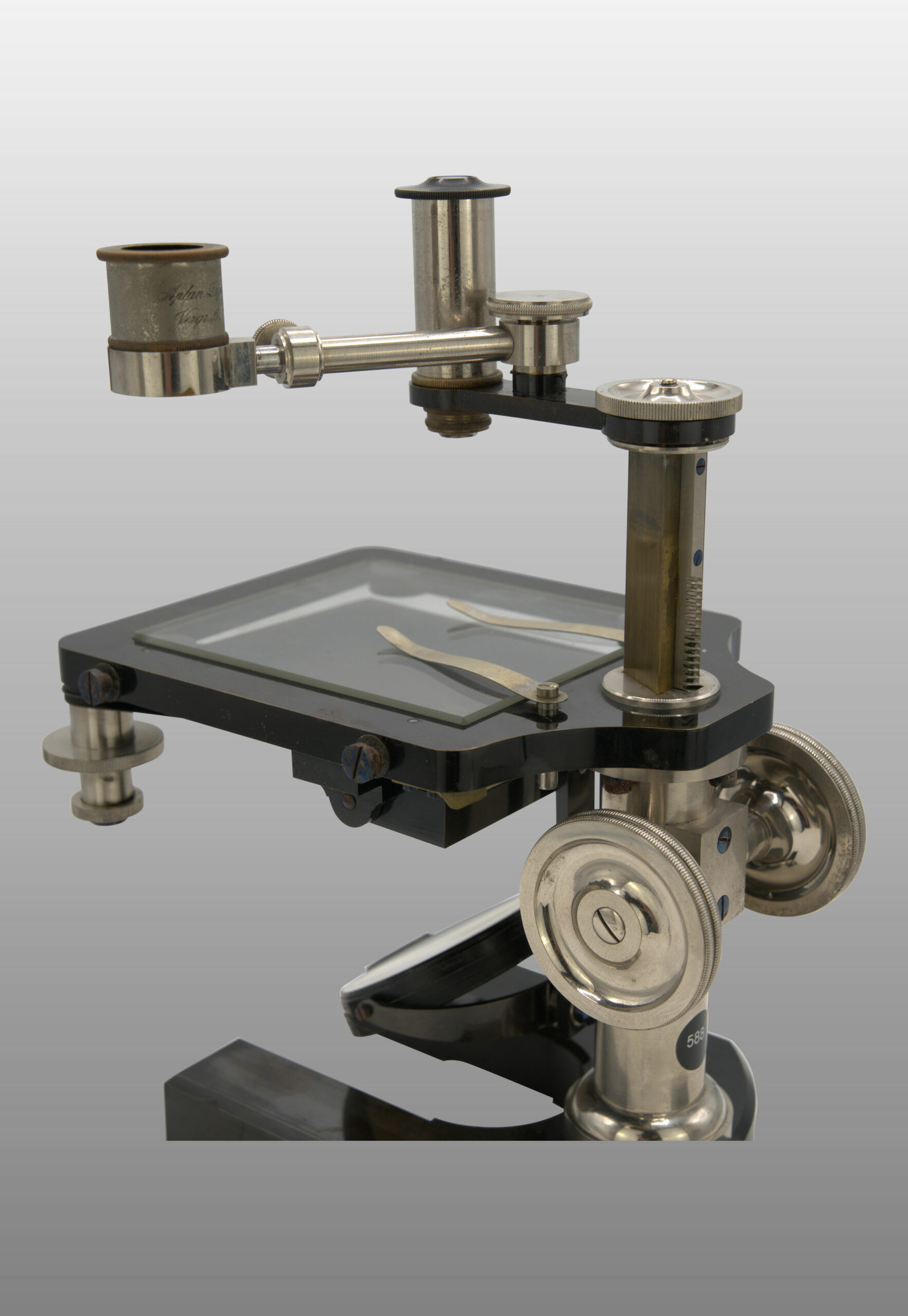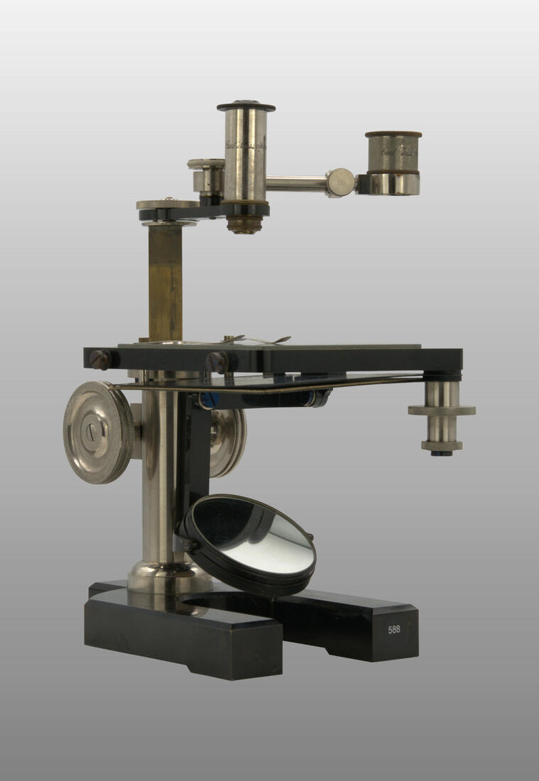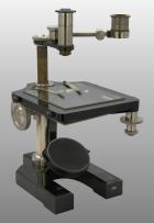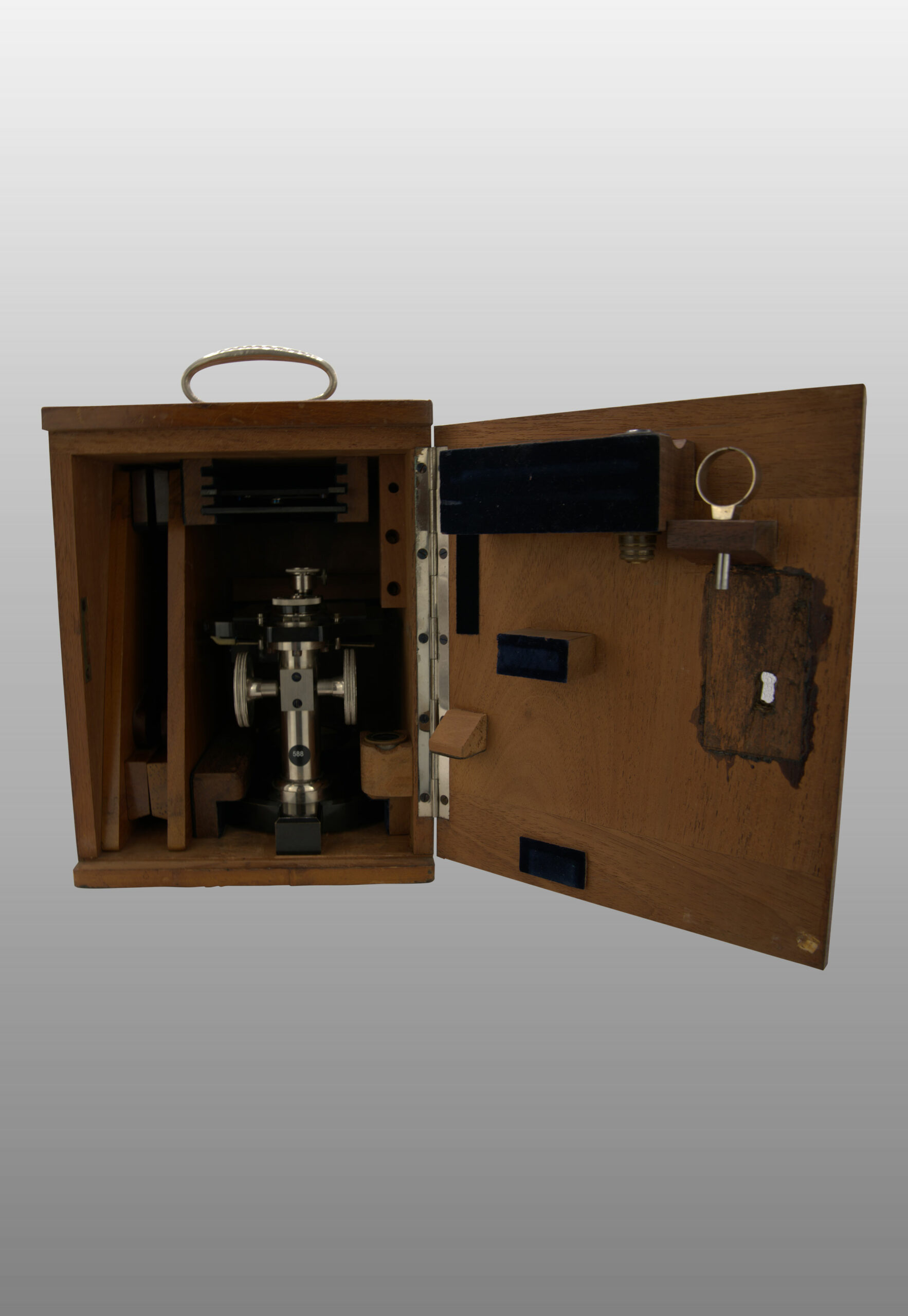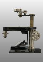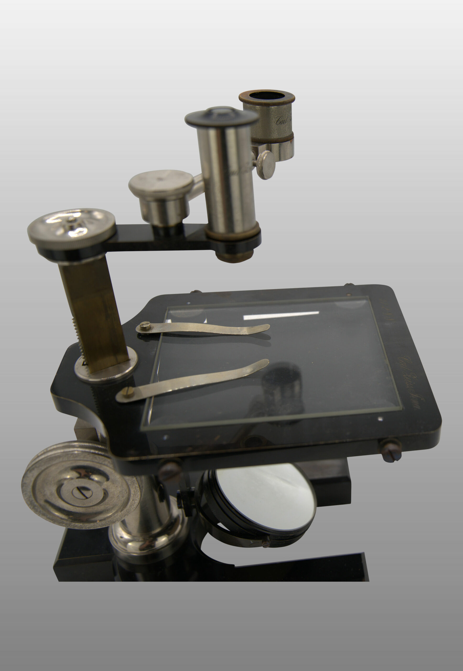 Le pied du microscope est fait de laiton nickelé et peint en noir, d’acier nu et bleuté, de céramique blanche et de bois d’acajou. Pour éclairer l’objet, il est équipé d’un miroir à quatre articulations, dont l’arrière est équipé d’une plaque de céramique blanche pour l’éclairage diffus. L’instrument dispose du grand fer à cheval du trépied I de Zeiss, la colonne est dentelée et deux boutons macrométriques fixés sur le pignon permettent de faire la mise au point.
