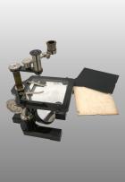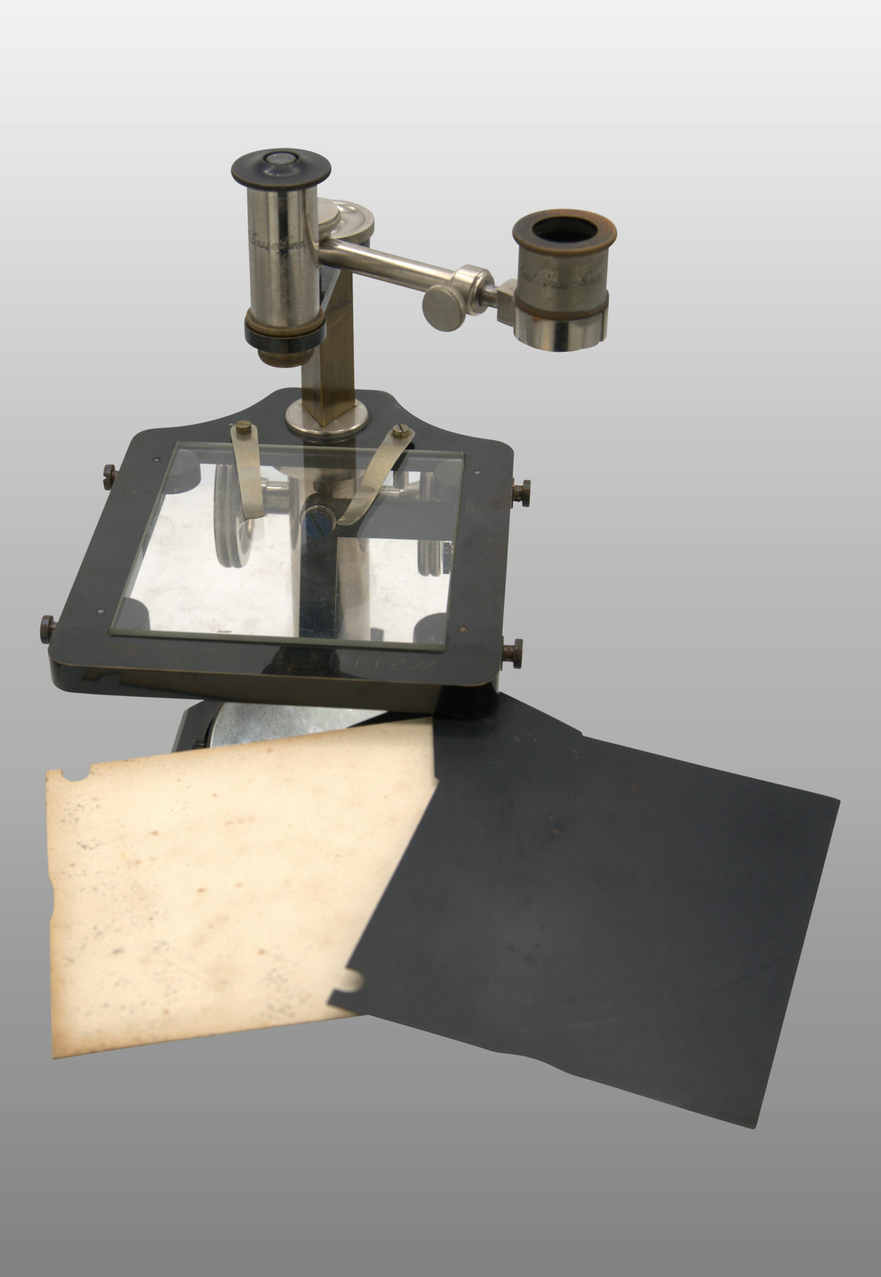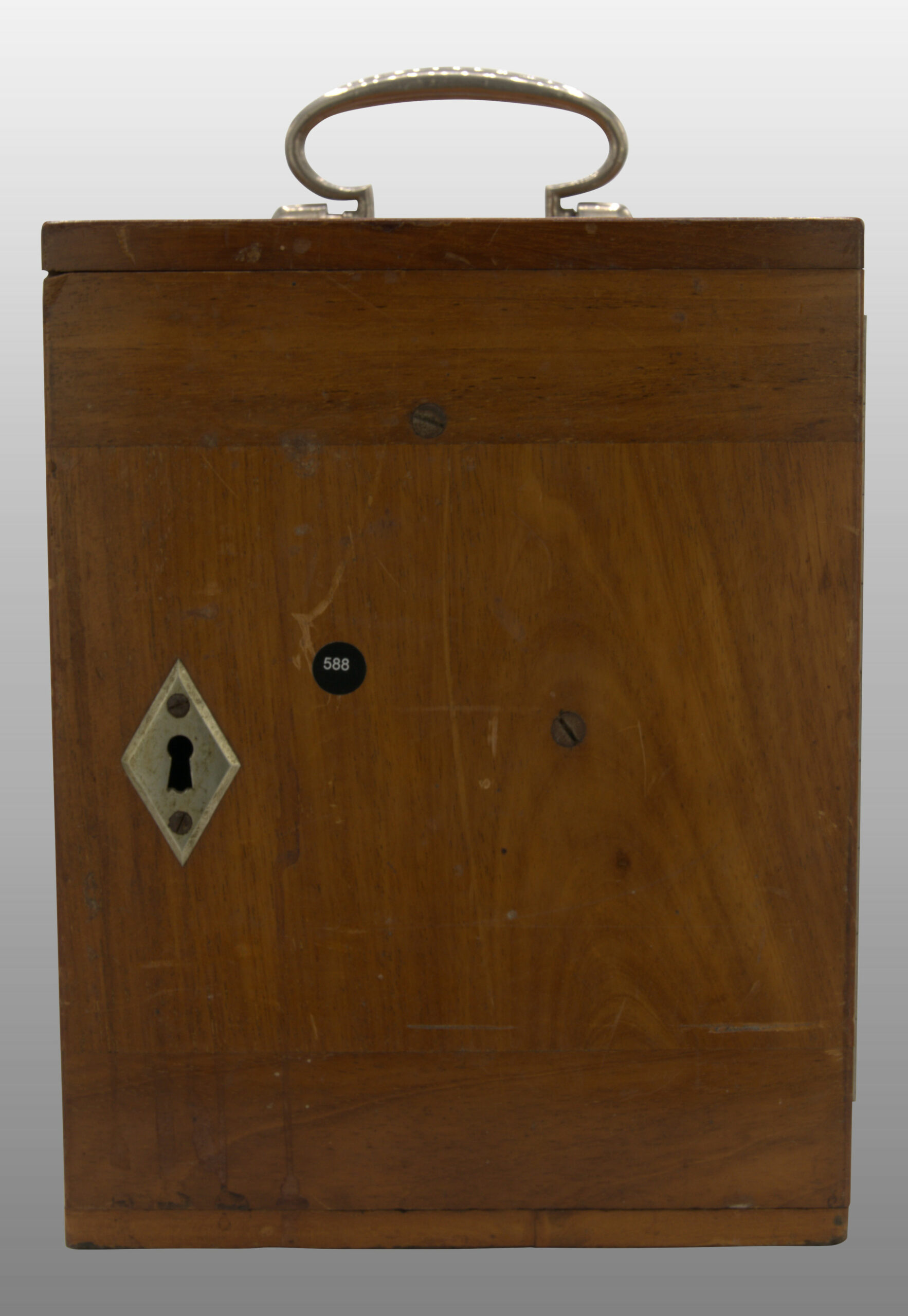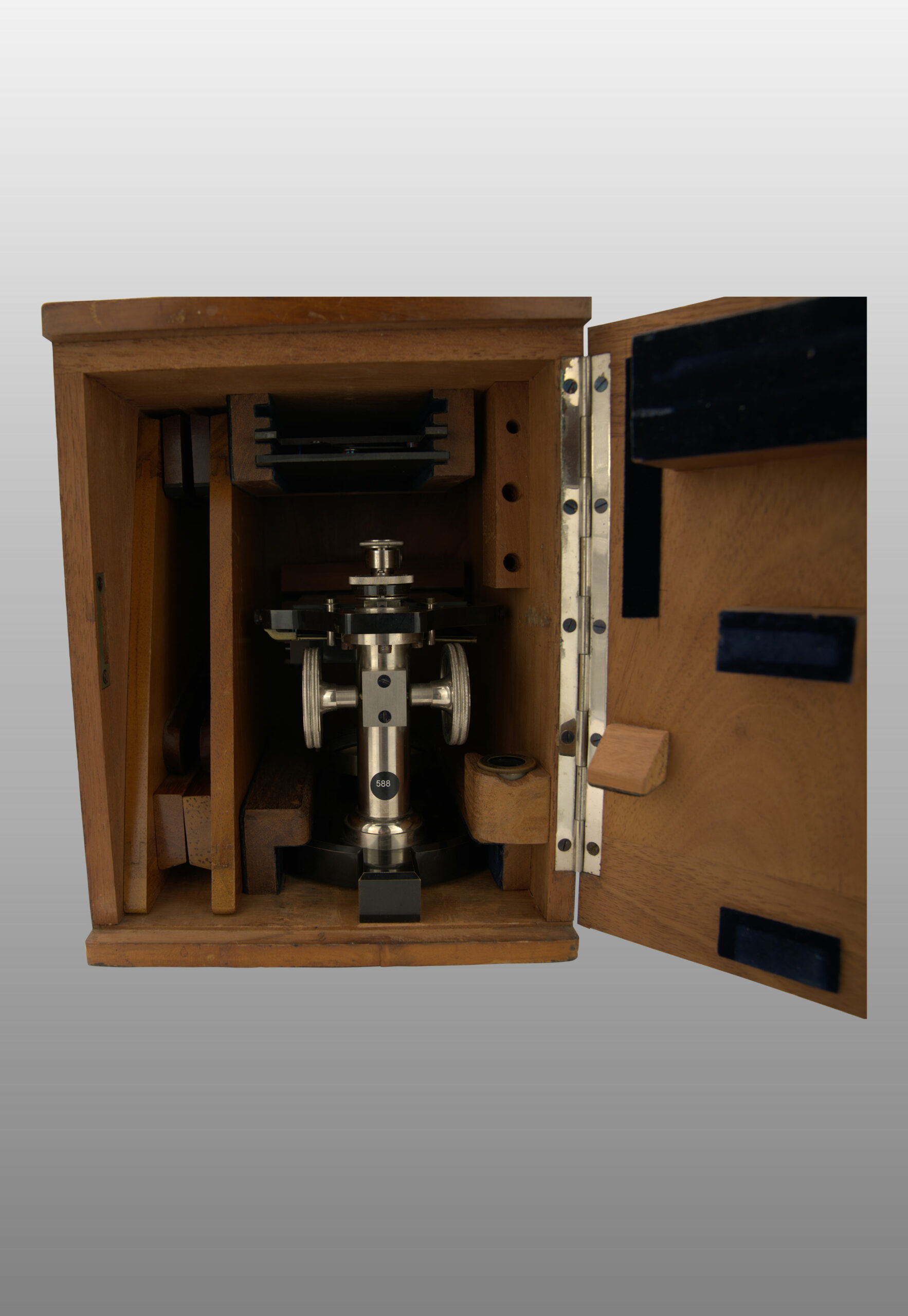 Description 588 : Loupe 6x et son support, plaque noire et blanche sous la platine, verre carré de platine, lentille de Brücke 10x et son support, 2 accoudoirs en bois avec fixation latérale sur la platine. Miroir concave. 2 plaques en acier noir qui s’insèrent à la place de la plaque en verre. Boite en bois sans serrure.